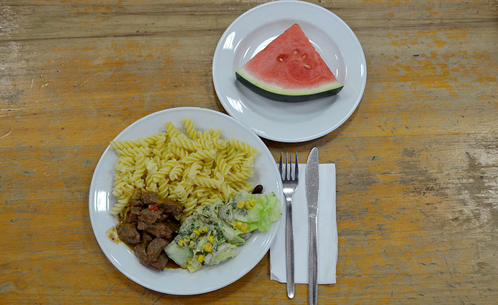 Unser Mittagessen: Gulasch, Nudeln, Salat