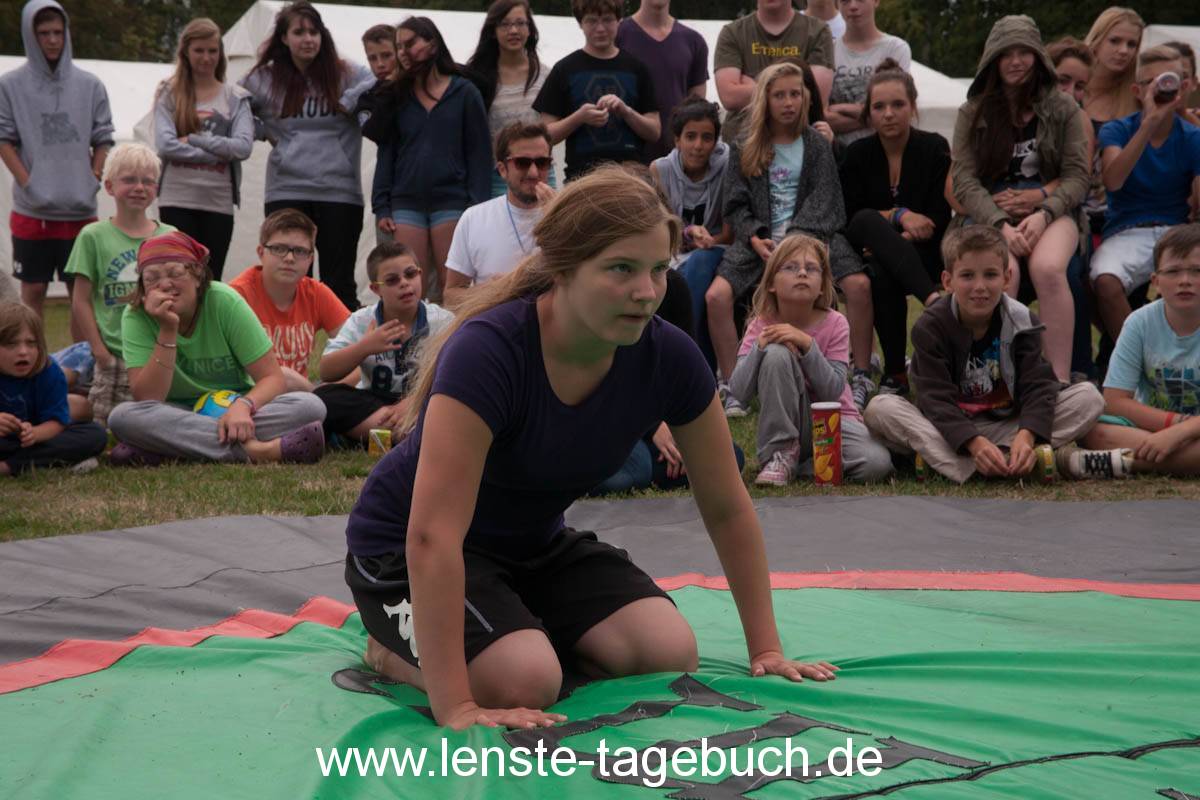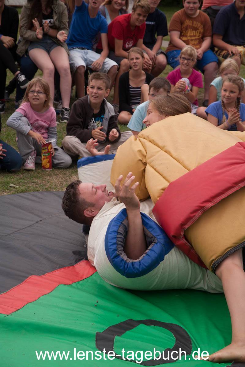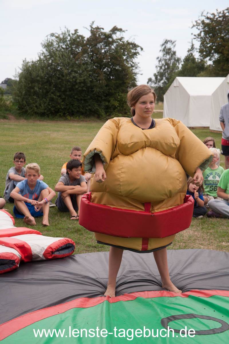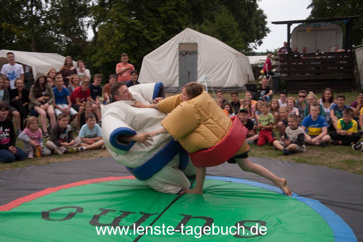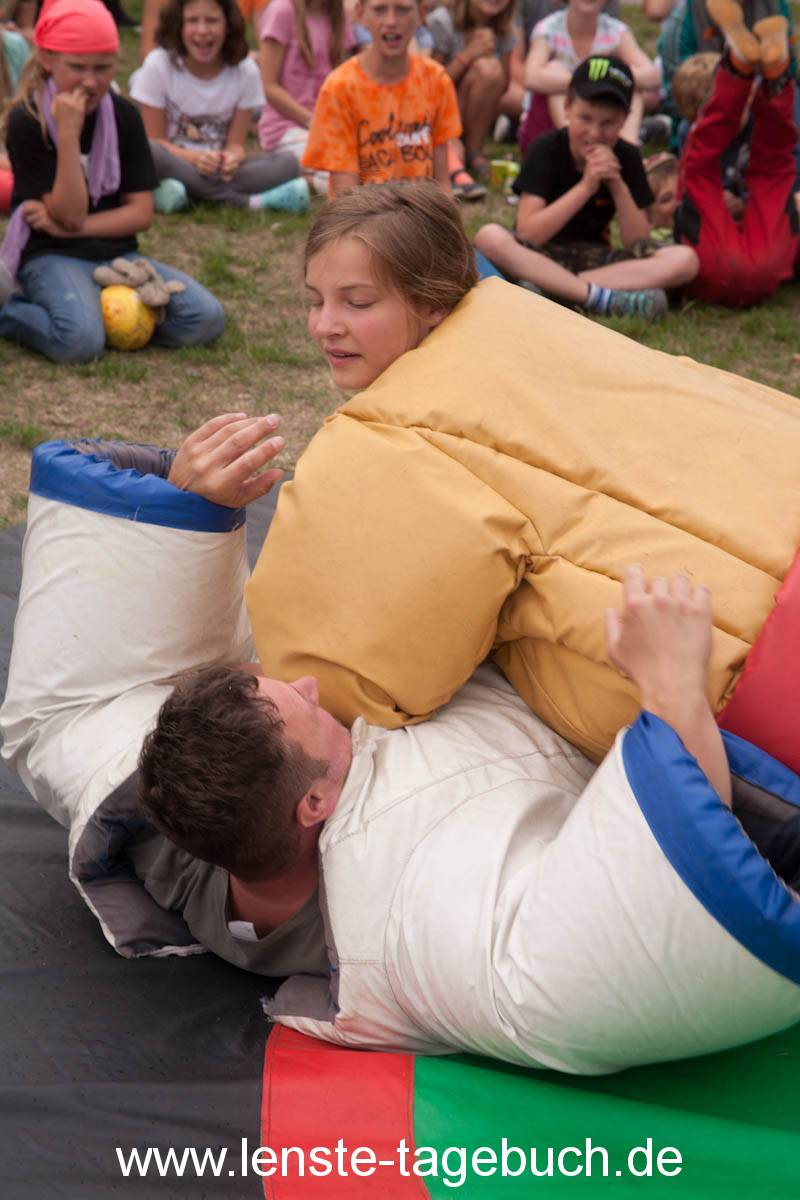 Jeannine aus dem Ü-16 Zelt forderte unseren Fahrbereitschafts-Neigi zum Ringen auf. In den ersten beiden Runden mit Sumoringer-Kostüm ging es Unentschieden aus. Die letzte und entscheidende Runde in normaler Sport-Kleidung konnte Jeannine für sich entscheiden. Herzlichen Glückwunsch!! 🙂