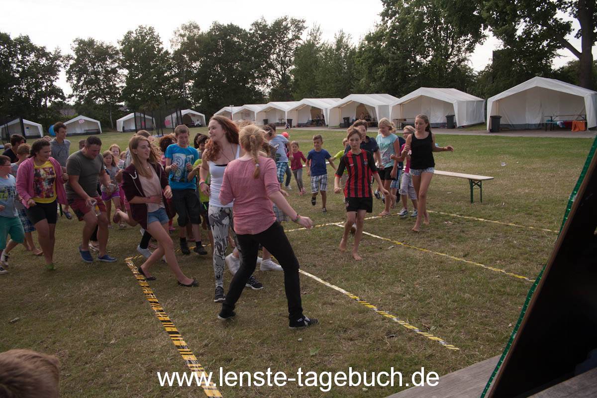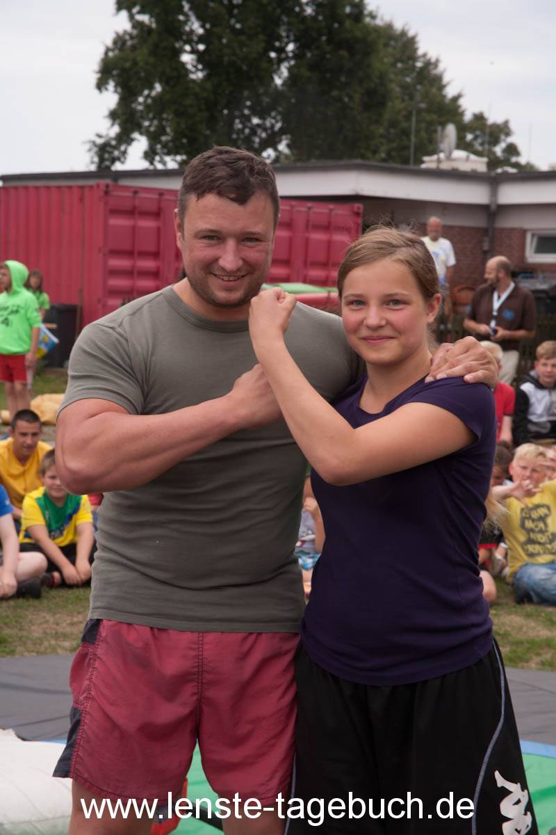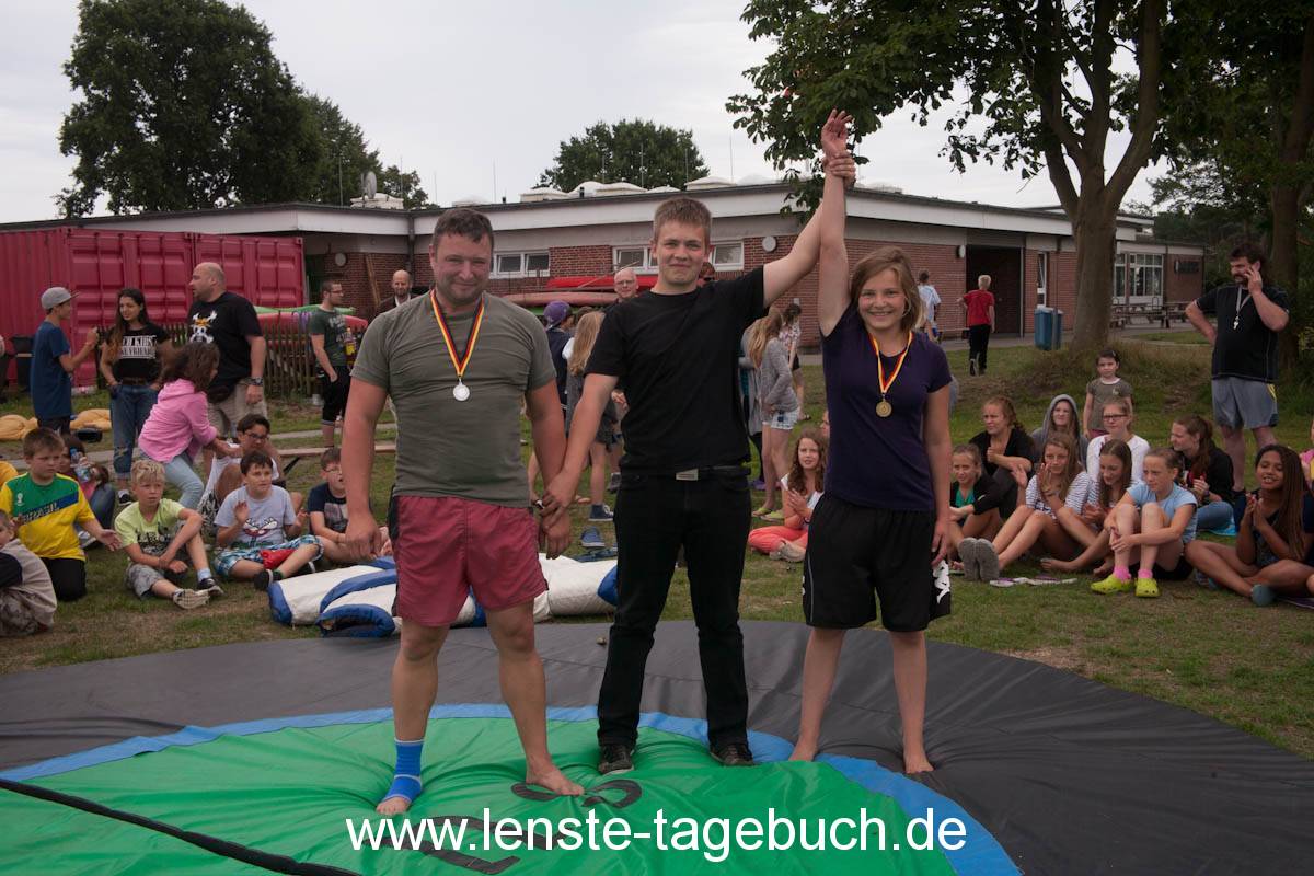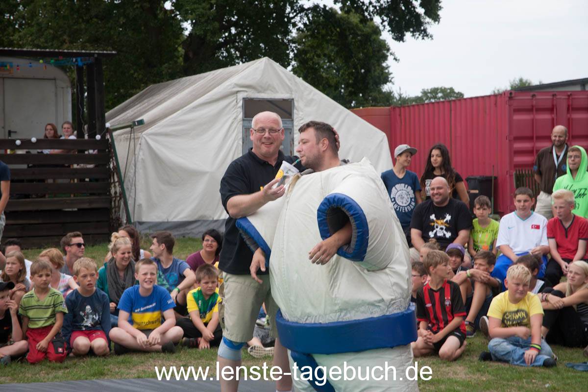 Jeannine aus dem Ü-16 Zelt forderte unseren Fahrbereitschafts-Neigi zum Ringen auf. In den ersten beiden Runden mit Sumoringer-Kostüm ging es Unentschieden aus. Die letzte und entscheidende Runde in normaler Sport-Kleidung konnte Jeannine für sich entscheiden. Herzlichen Glückwunsch!! 🙂