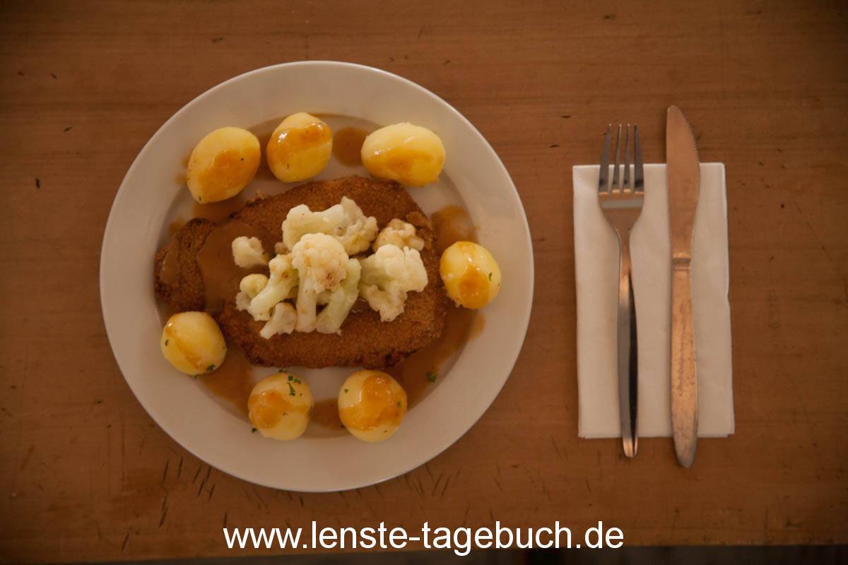 Zum Mittagessen gab es Schnitzel mit Kartoffeln und Blumenkohl.