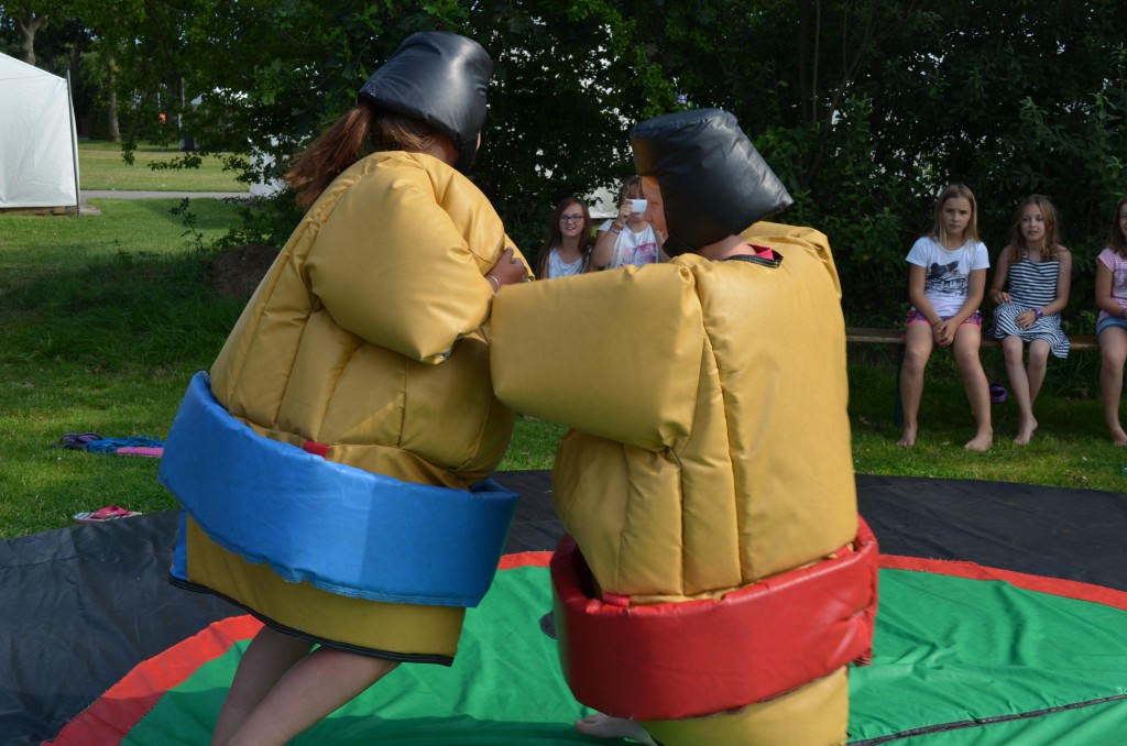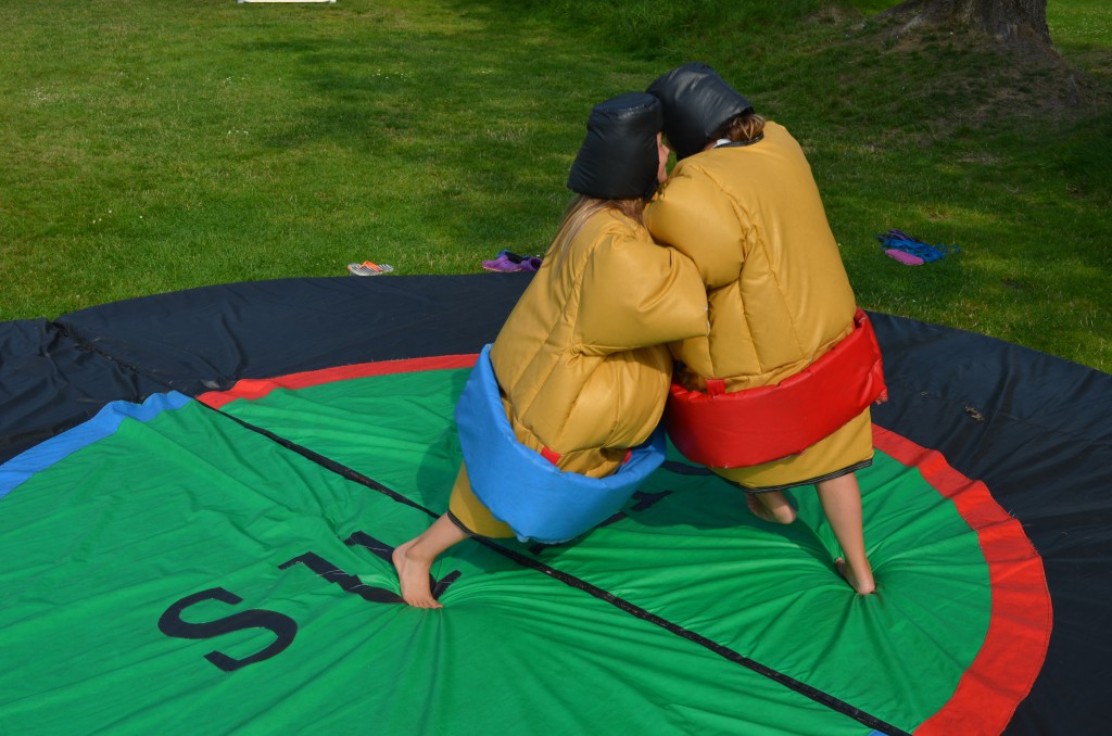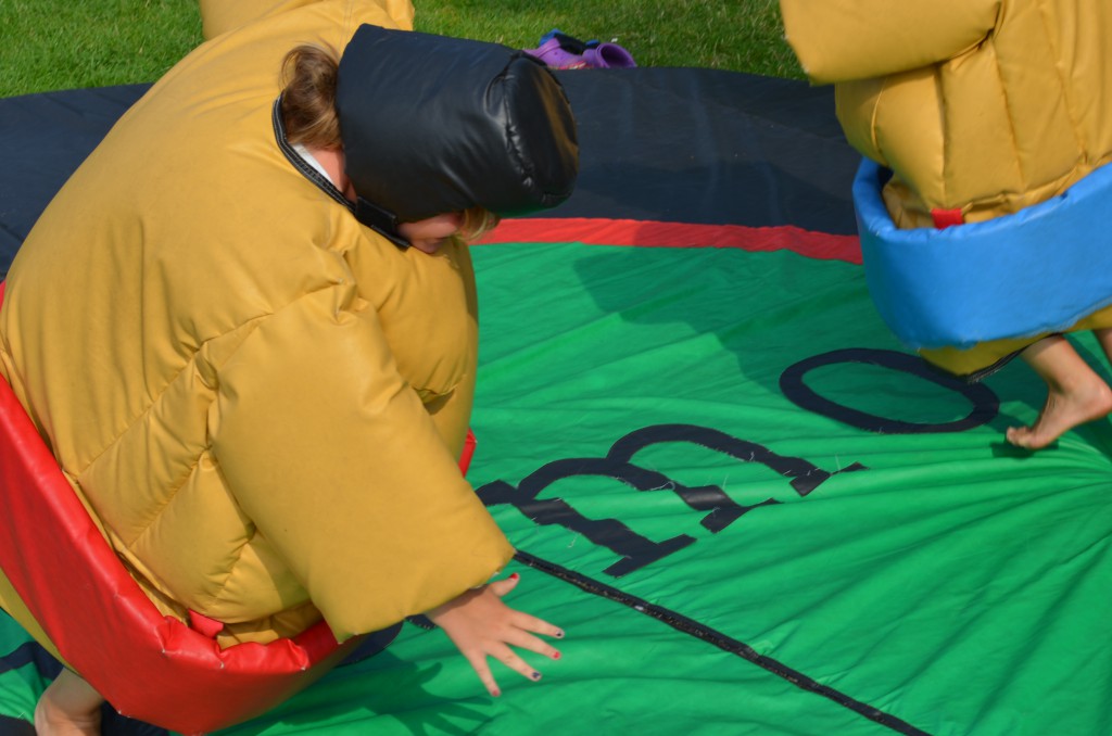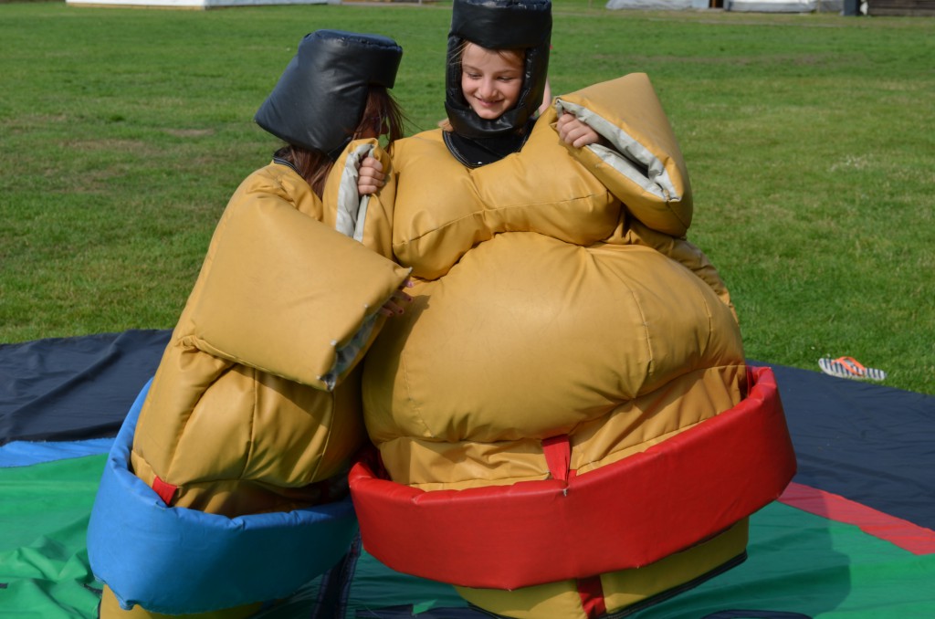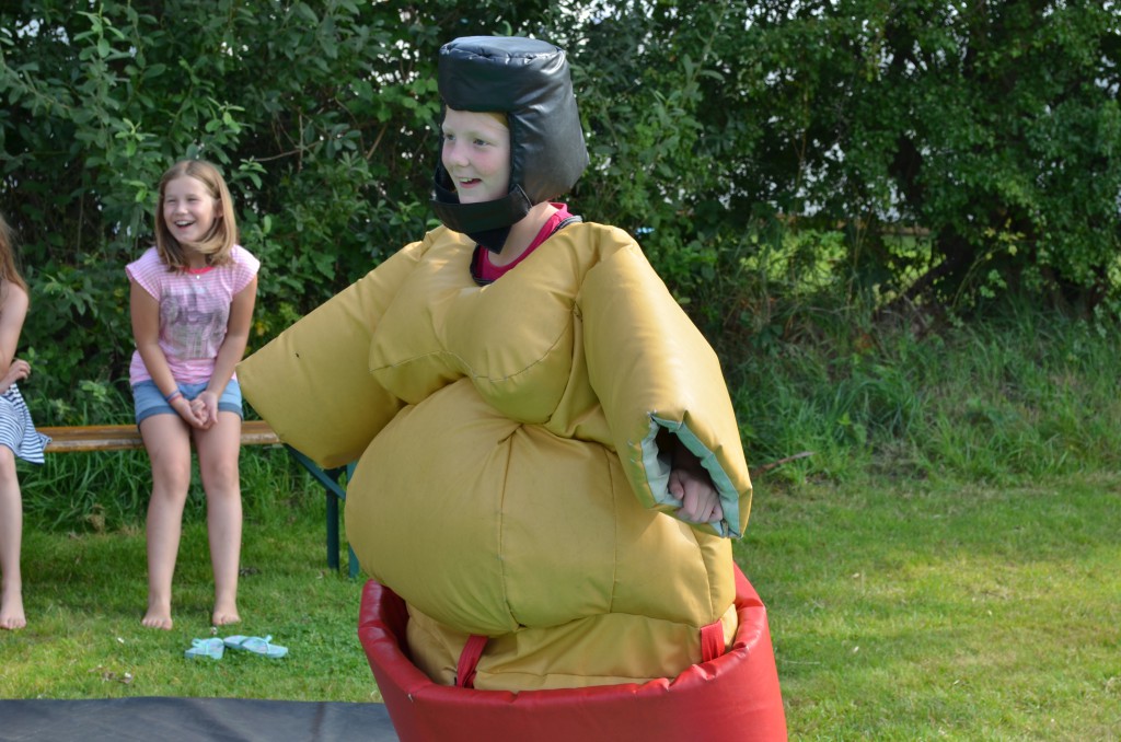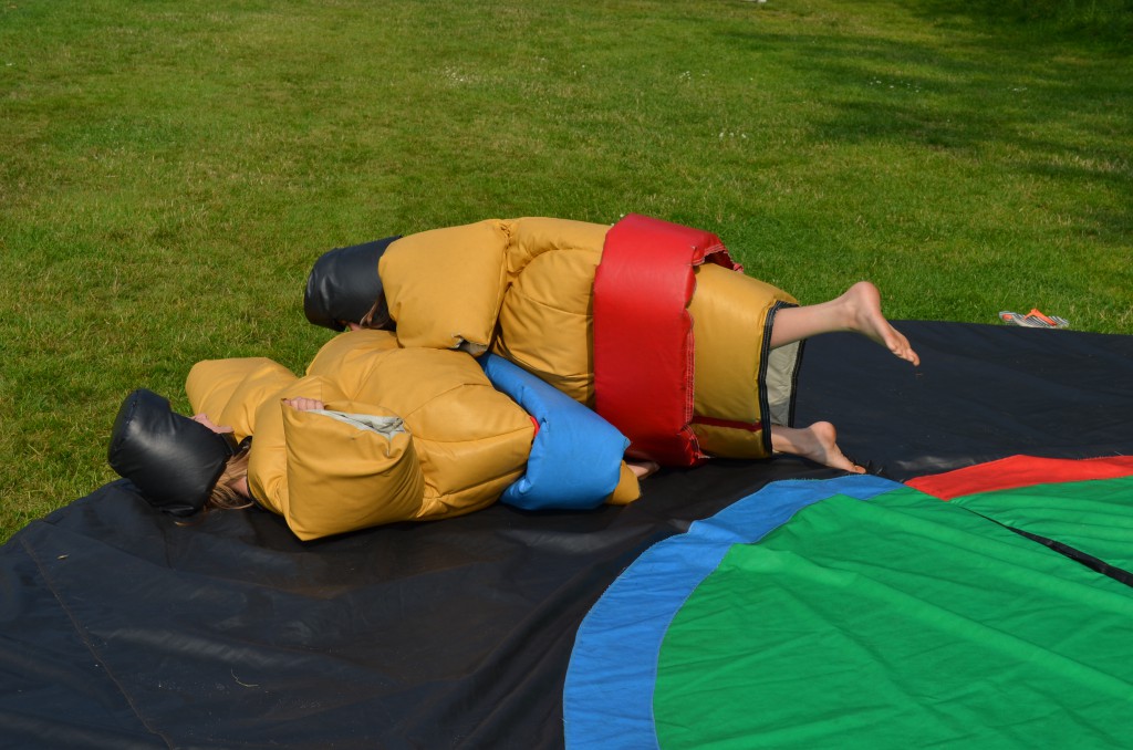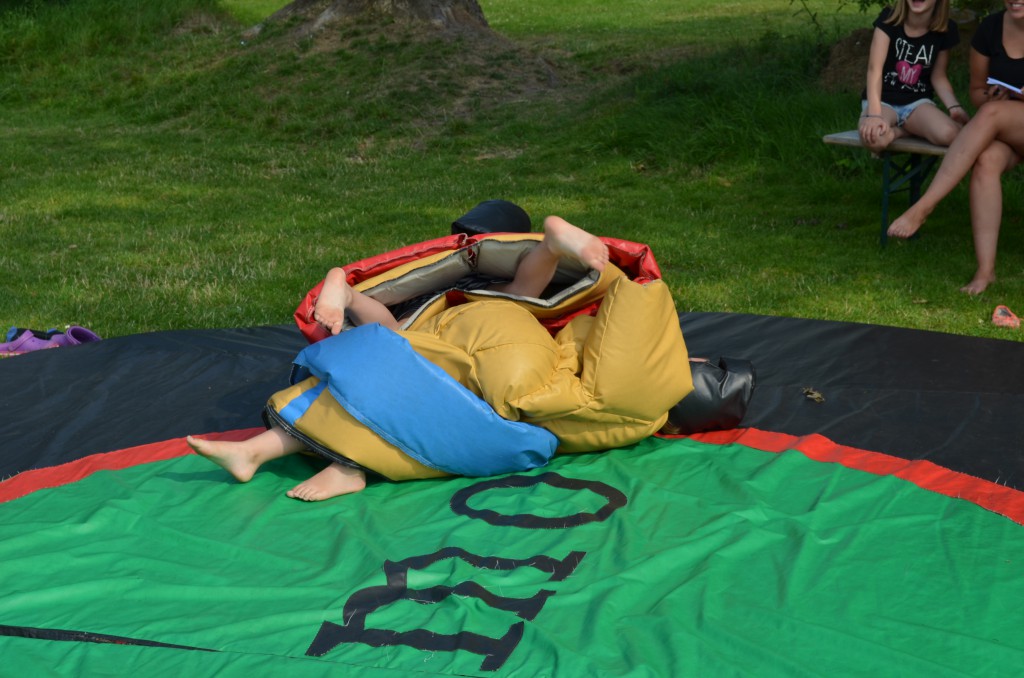 Bei uns werden die Kleinsten im Handumdrehen RIESENGROSS … Schwupp, in die Sumo-Anzüge geschlüpft, wird jeder Mattenplatscher zum RIESENSPASS. Am lustigsten ist es, wenn man dabei auch gleich mal die Betreuerin herumkugeln kann.