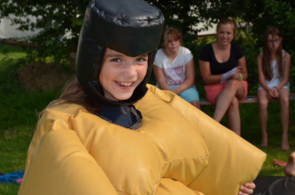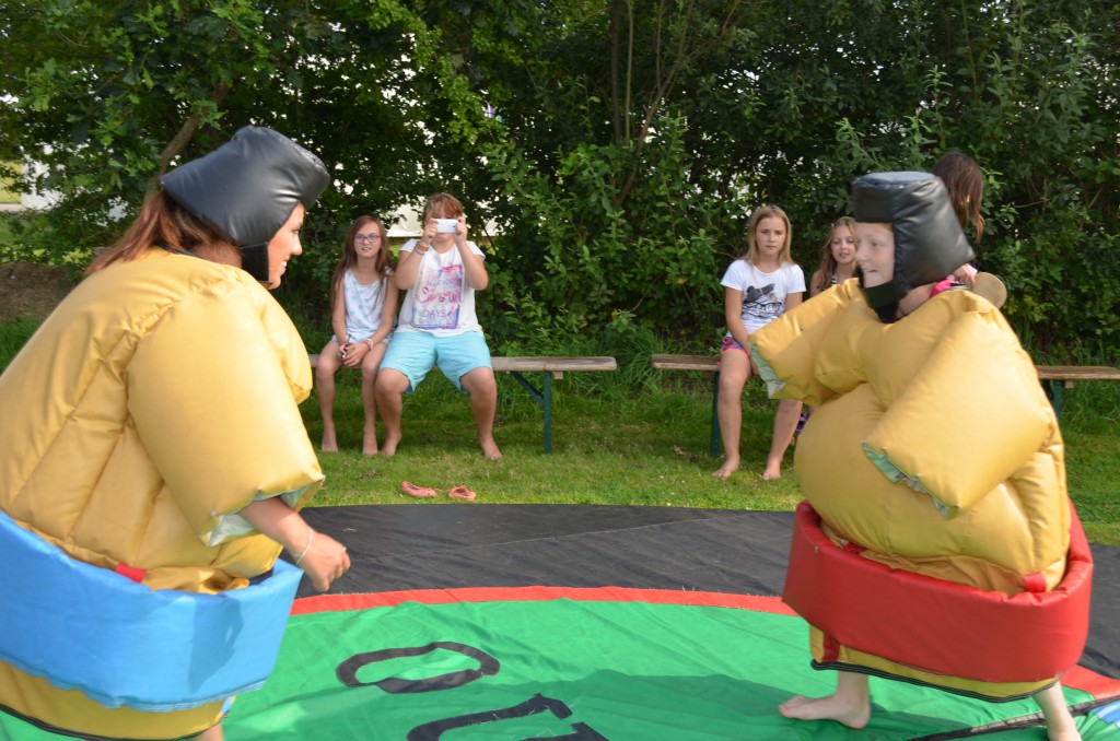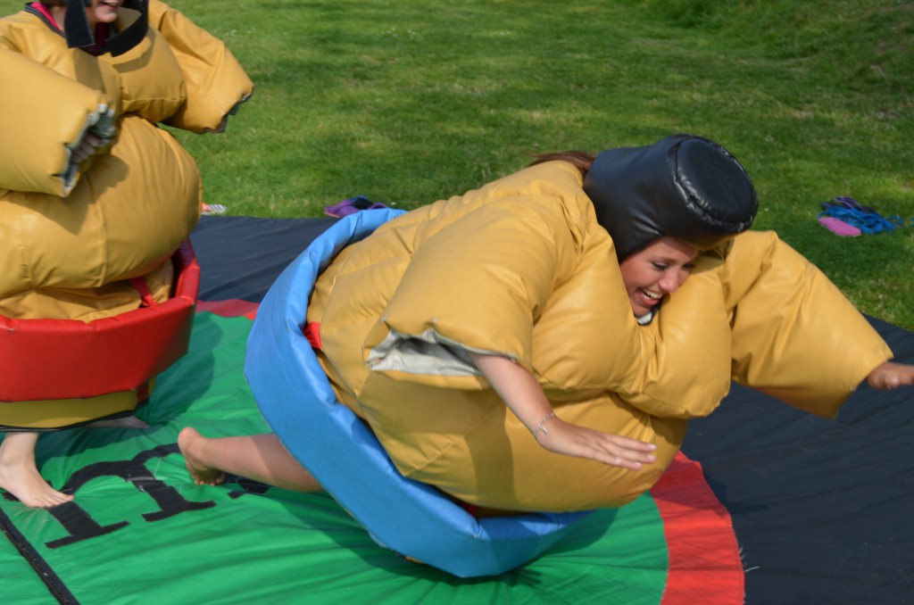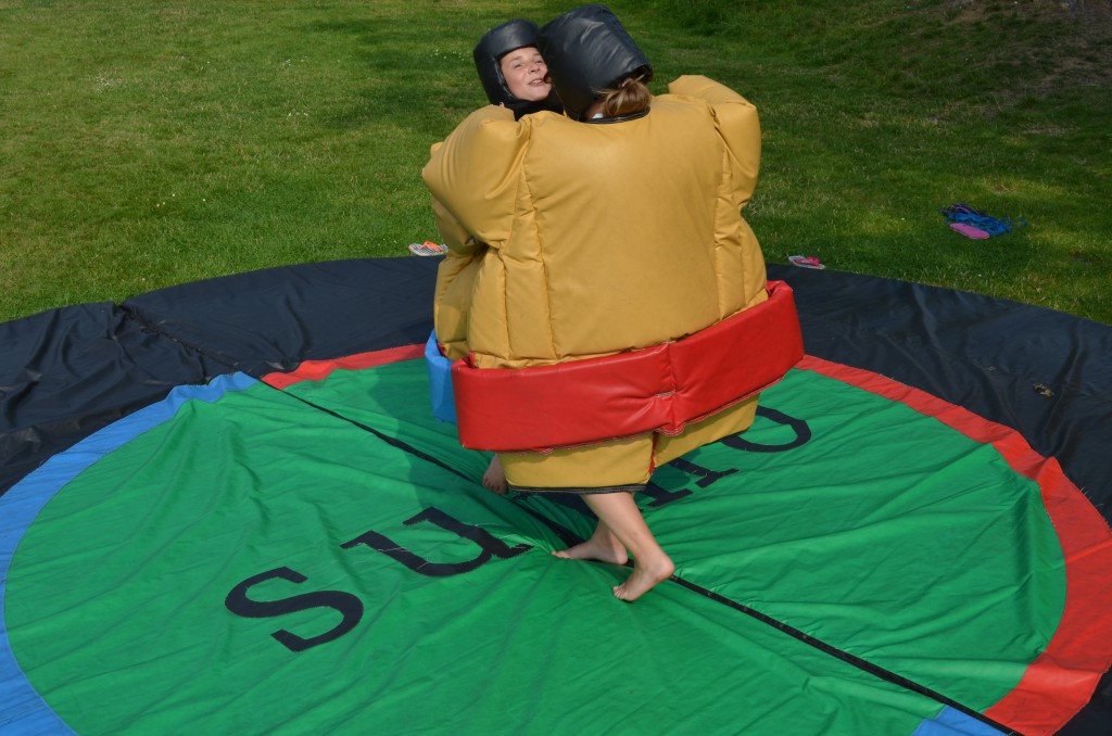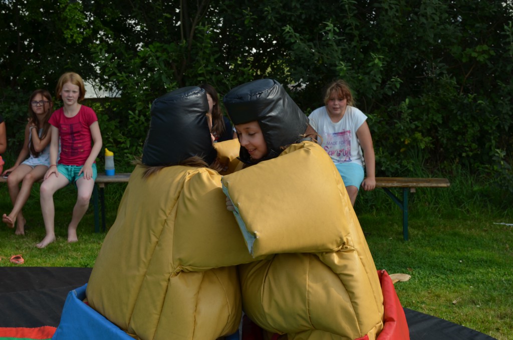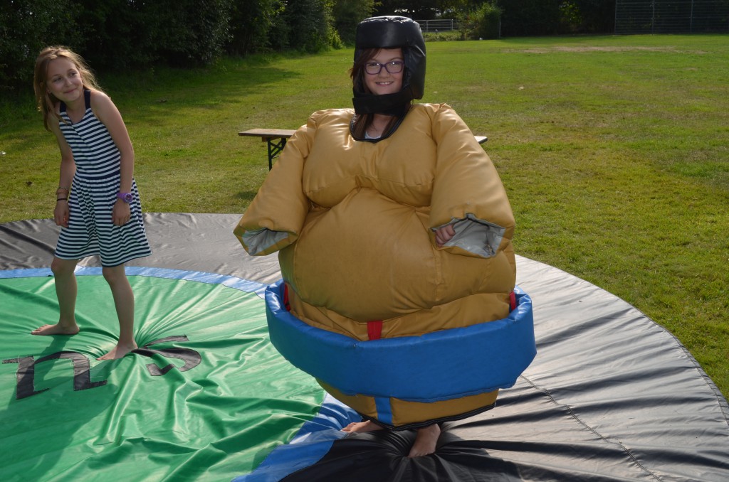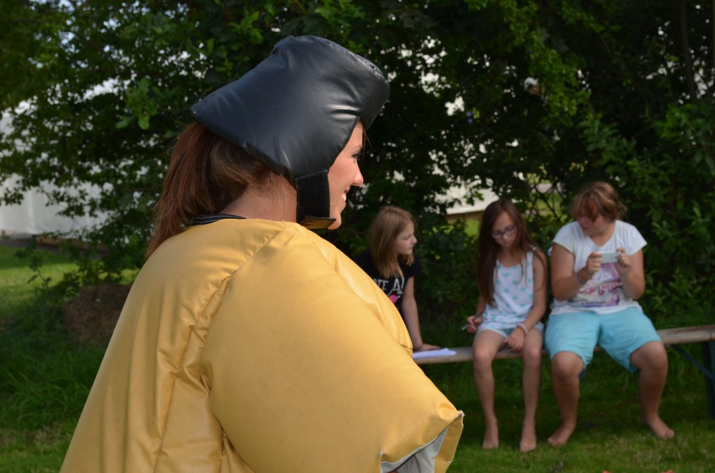 Bei uns werden die Kleinsten im Handumdrehen RIESENGROSS … Schwupp, in die Sumo-Anzüge geschlüpft, wird jeder Mattenplatscher zum RIESENSPASS. Am lustigsten ist es, wenn man dabei auch gleich mal die Betreuerin herumkugeln kann.