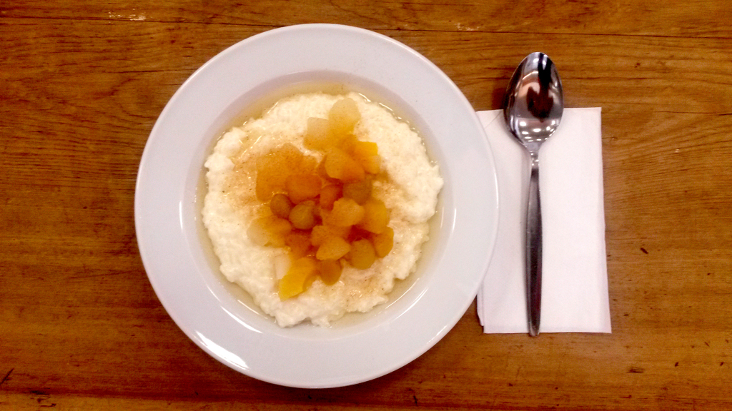 Unser Mittagessen: Milchreis mit Früchten, Zimt und Zucker