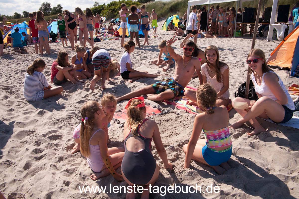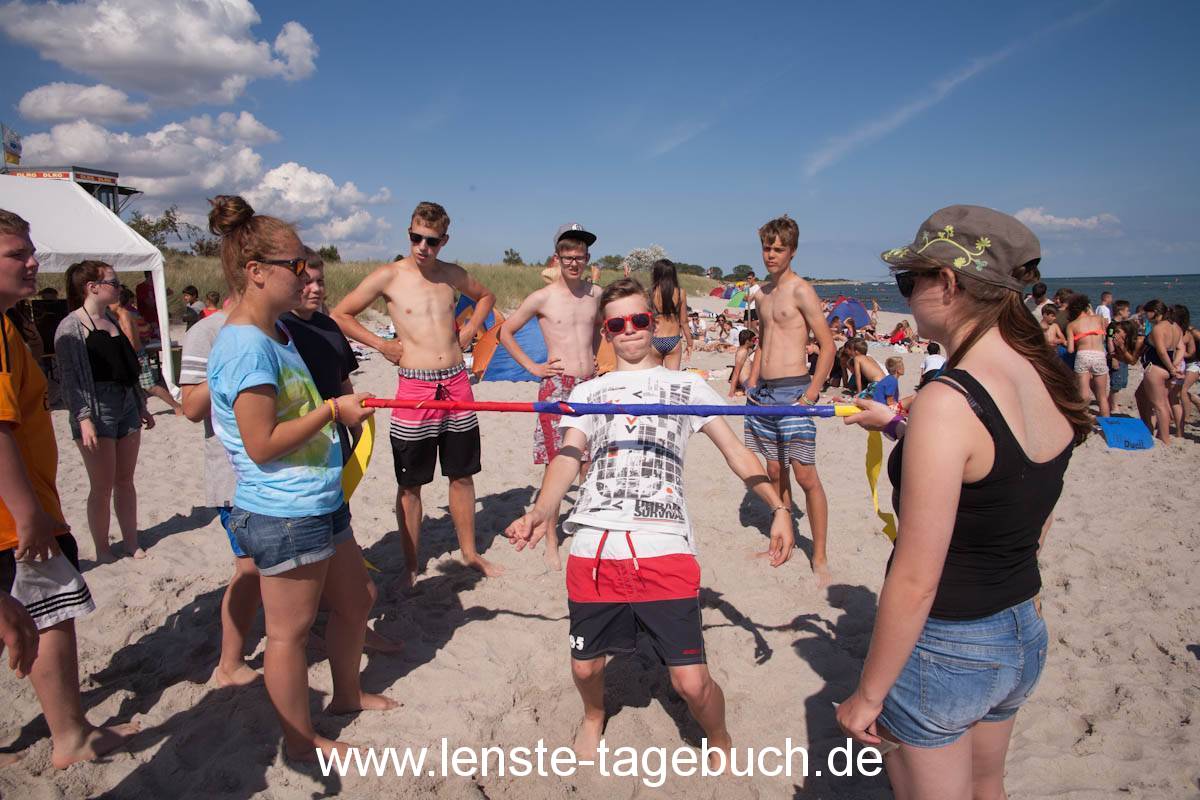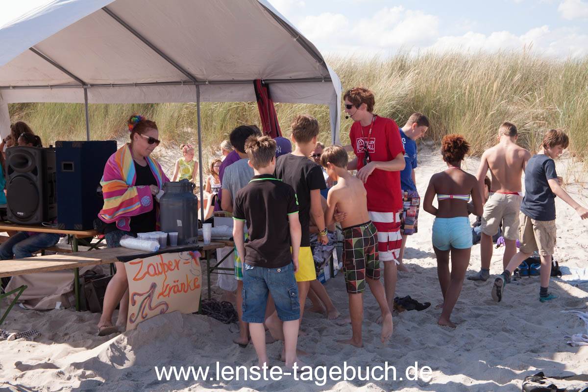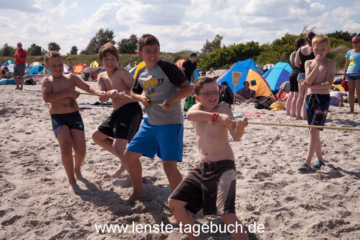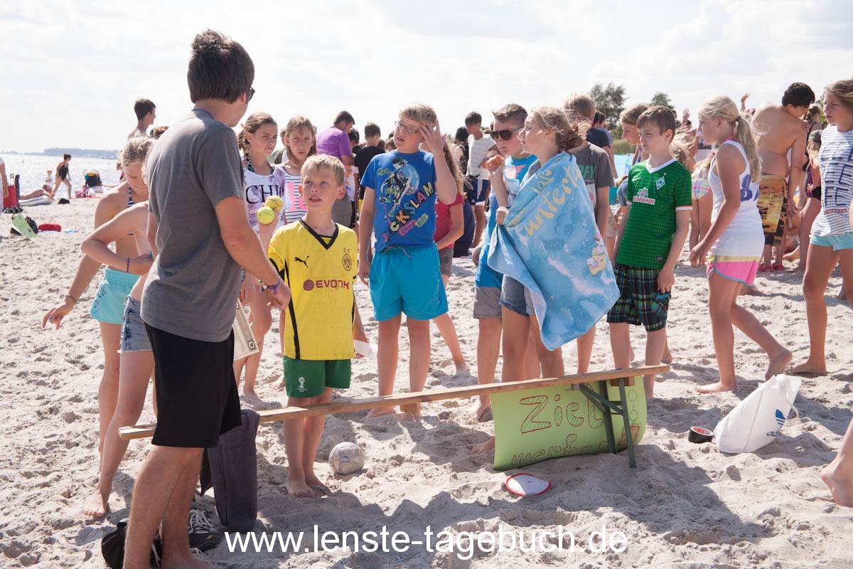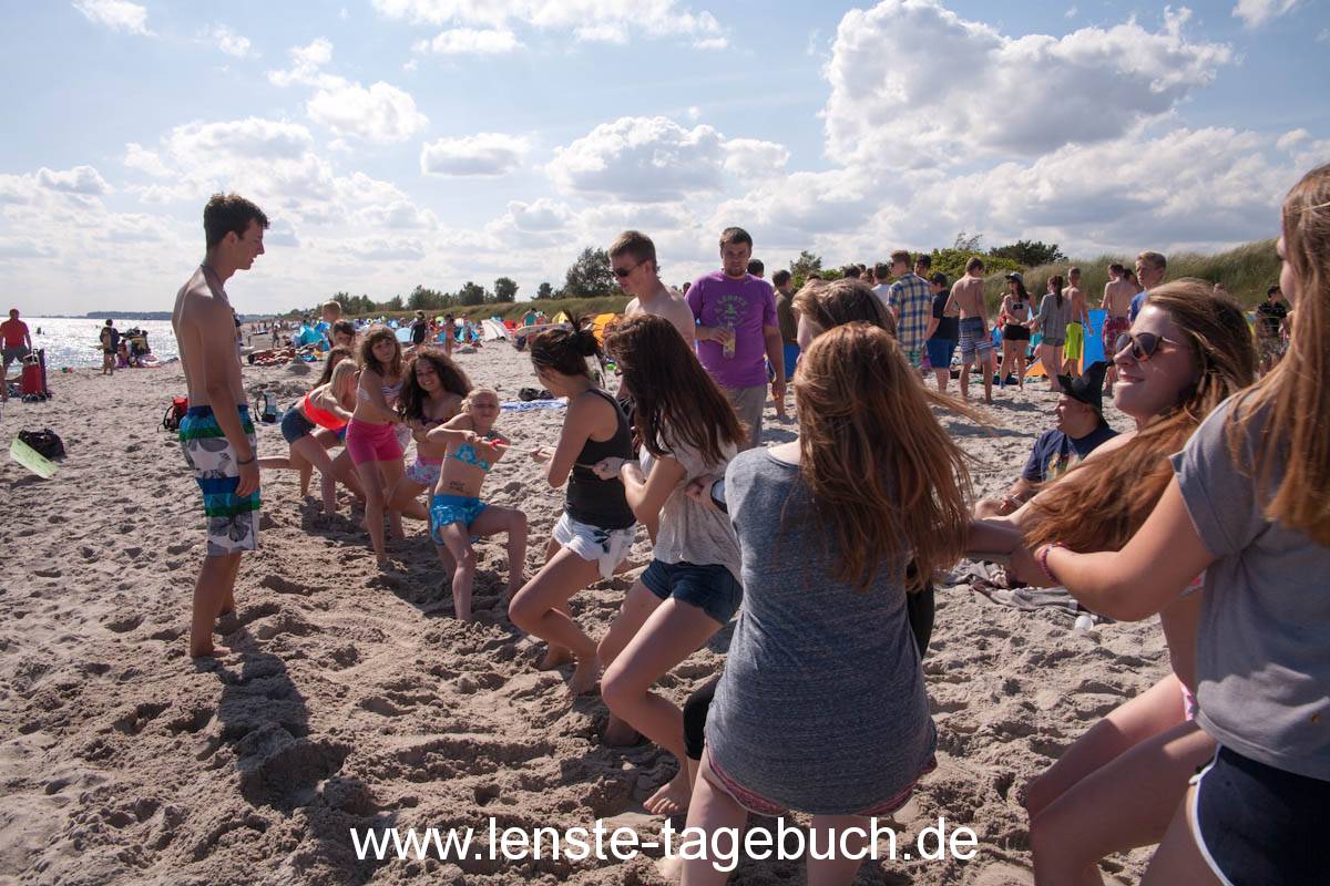 Die Strandparty war bei diesem Wetter genau das Richtige. Bei strahlendem Sonnenschein und 22 °C wurden den Kids viel Unterhaltung geboten. An sieben verschiedene Stationen traten die Teilis Zeltweise an um Punkte für ihr Haus zu holen.