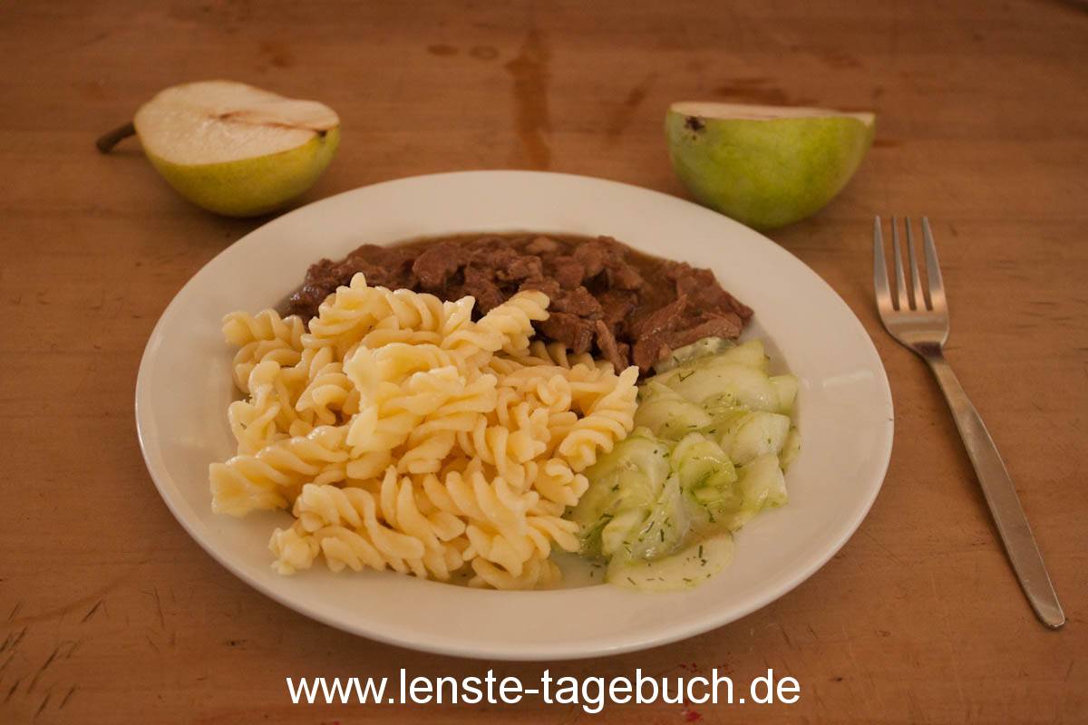 Nudeln mit Gulasch und Gurkensalat standen heute Mittag auf dem Speiseplan. Zum Nachtisch Obst als Erfrischung.