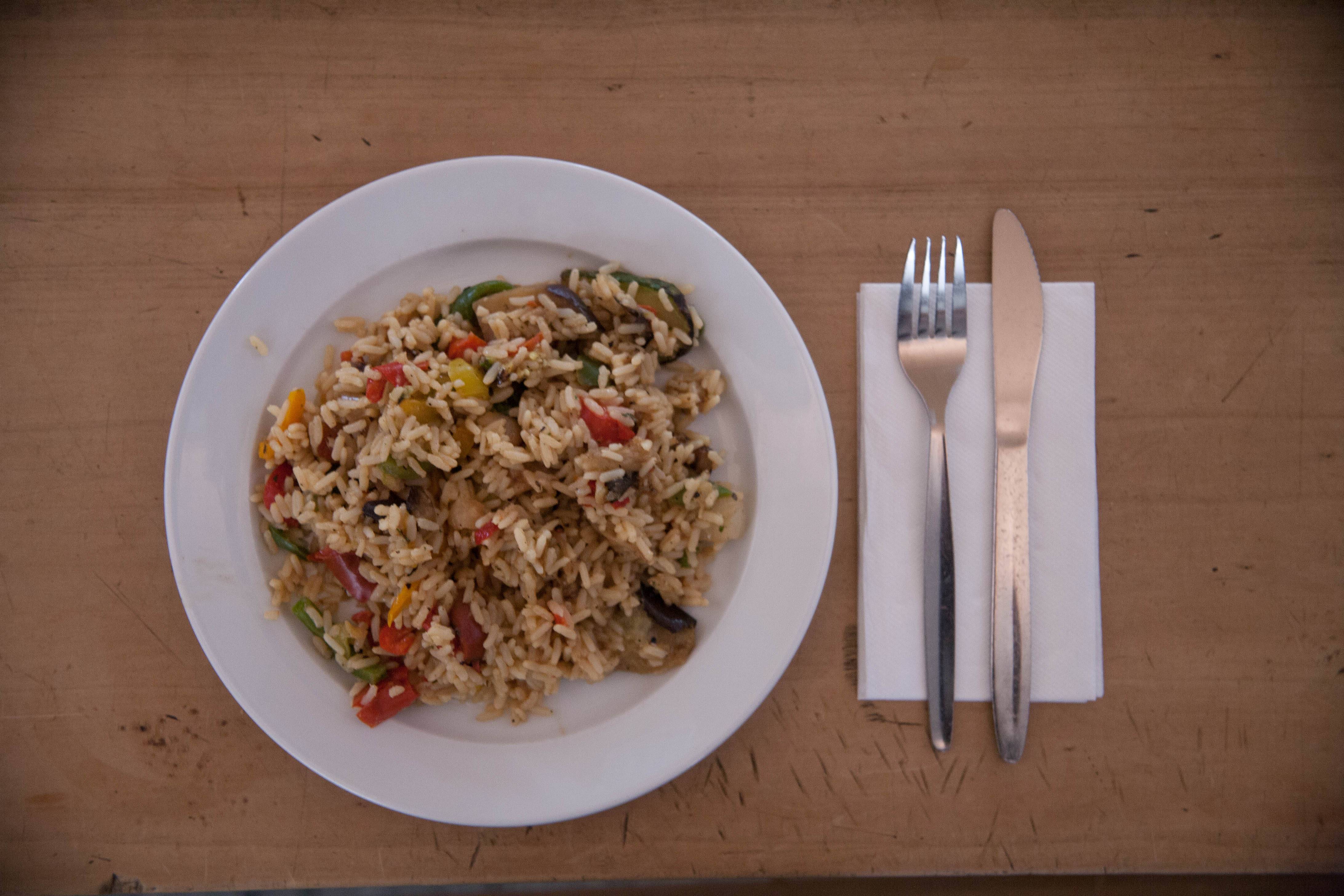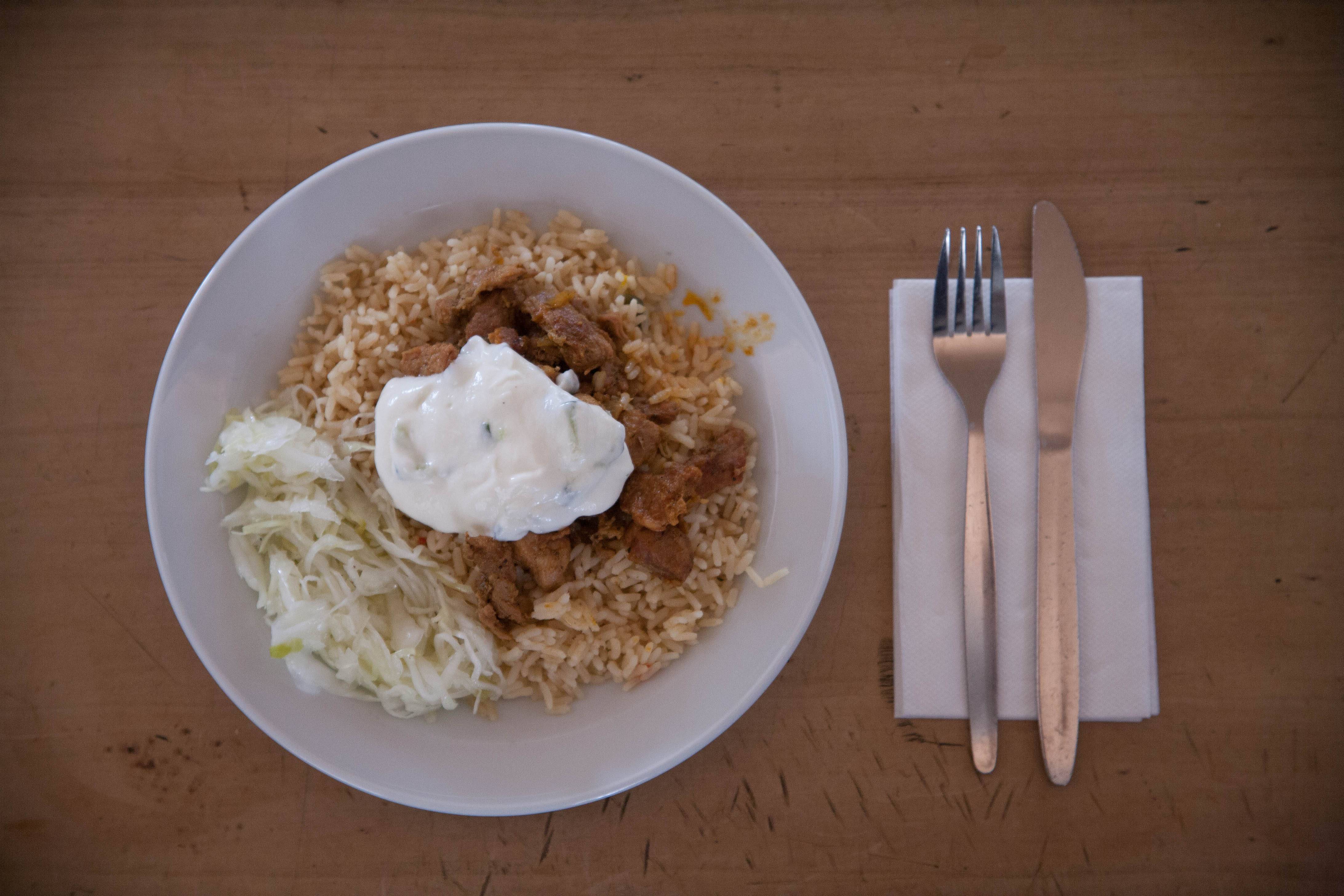 Zum Mittagessen gab es heute Gyros mit Reis und Tsatsiki, die vegetarische Alternative Reispfanne mit Gemüse.