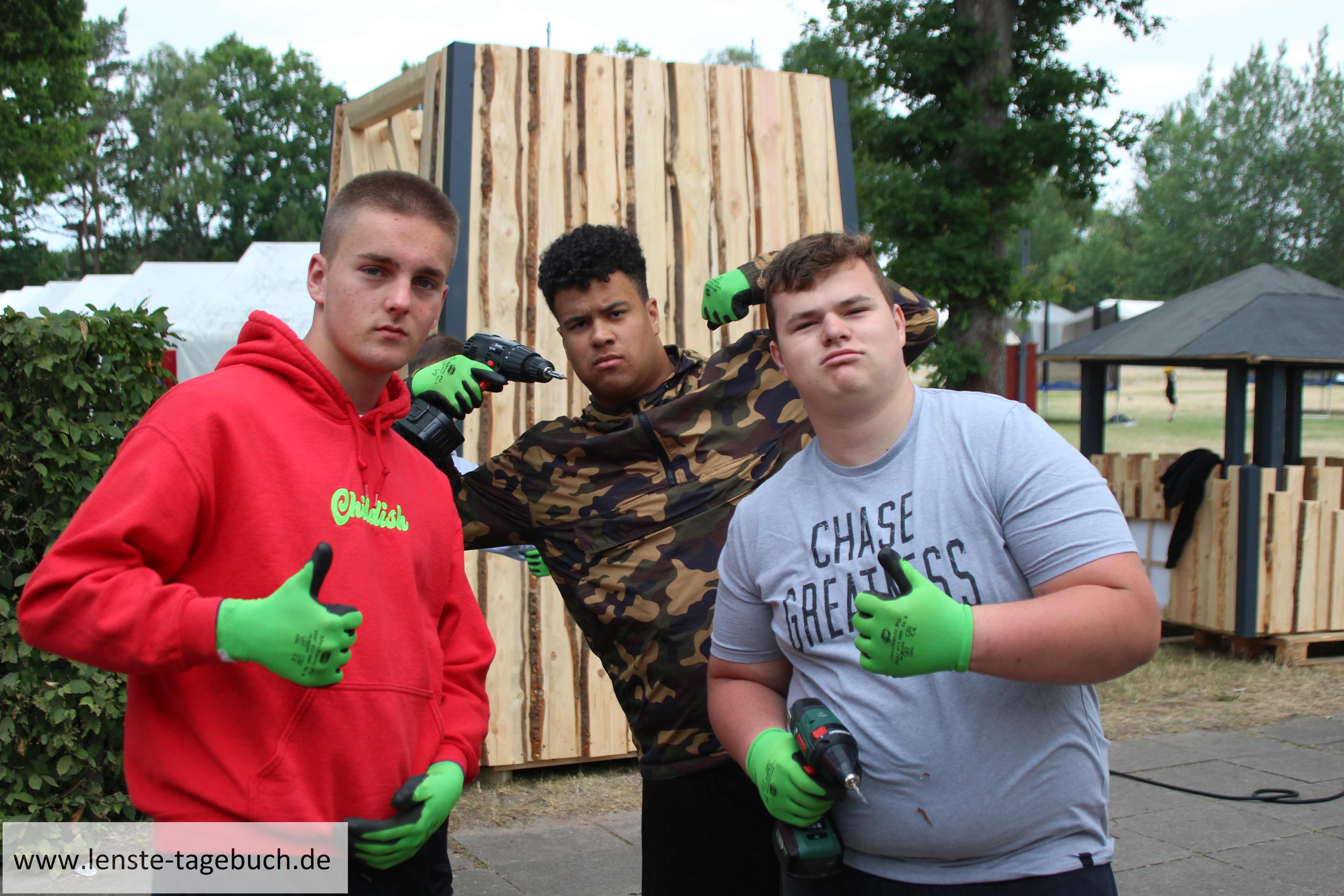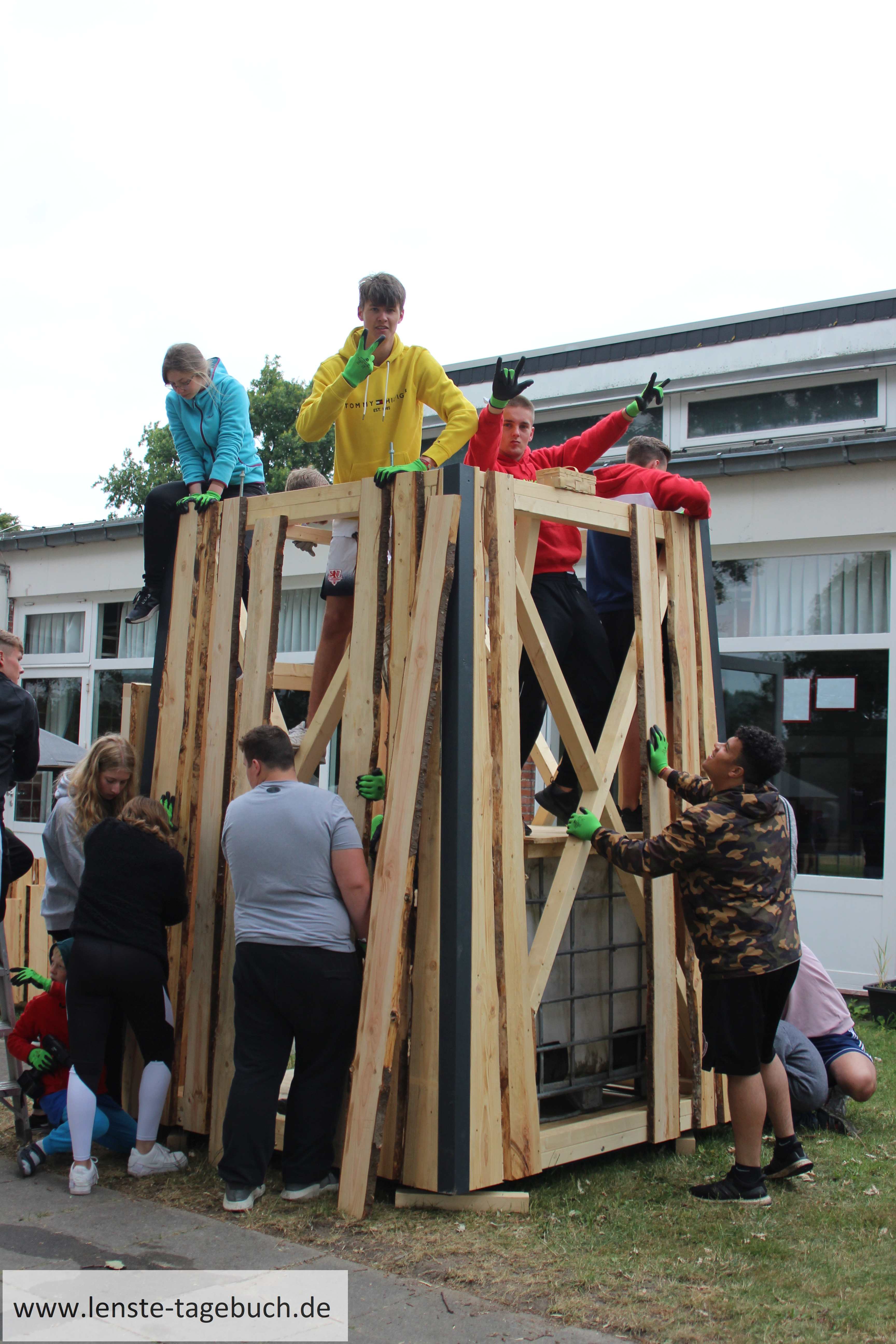 Auch wurde weiter an den Eingangstürmen des Lagers bebaut. Hier beteiligten sich viele Baumeister fleißig und halfen bei der Außenwandkonstruktion.