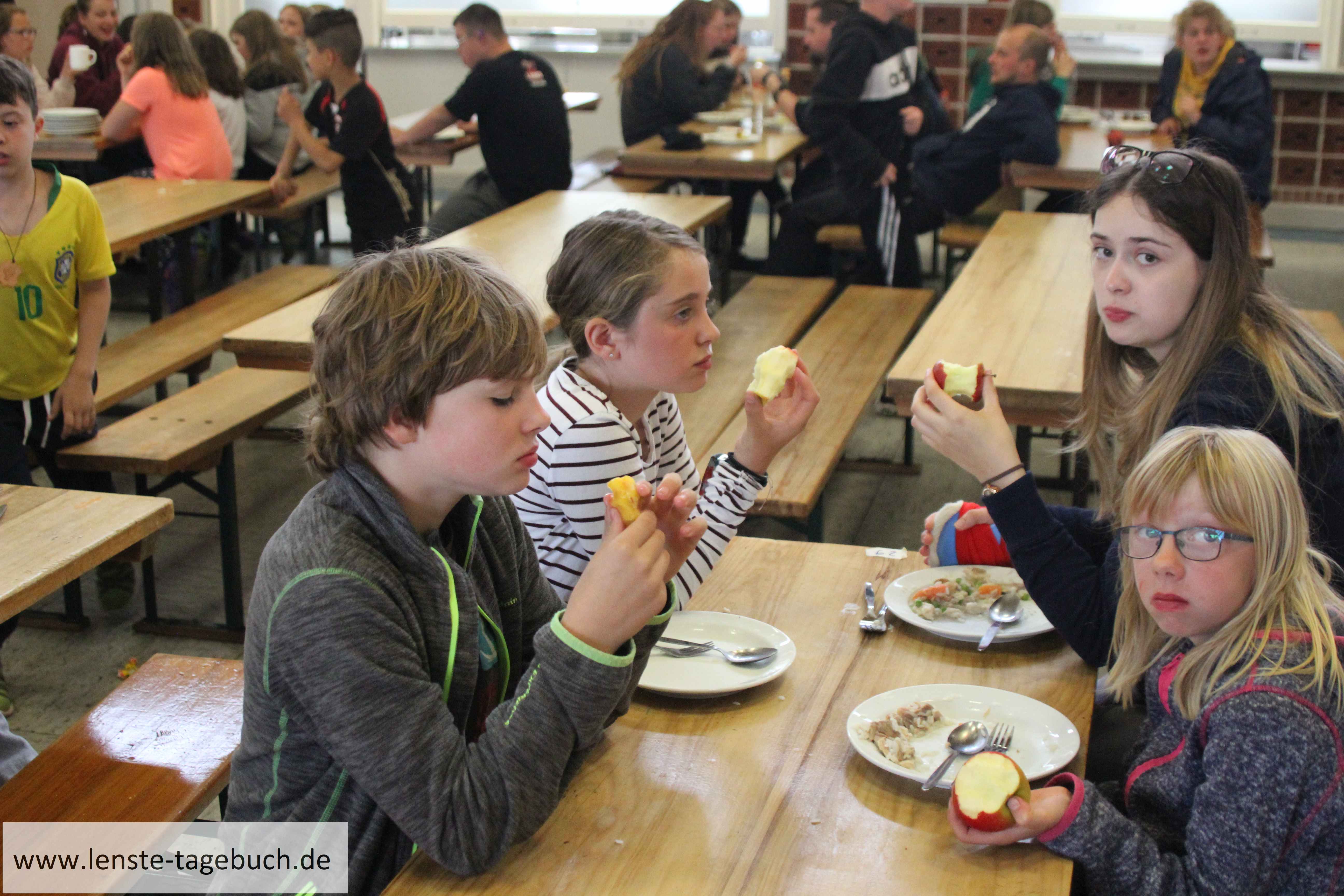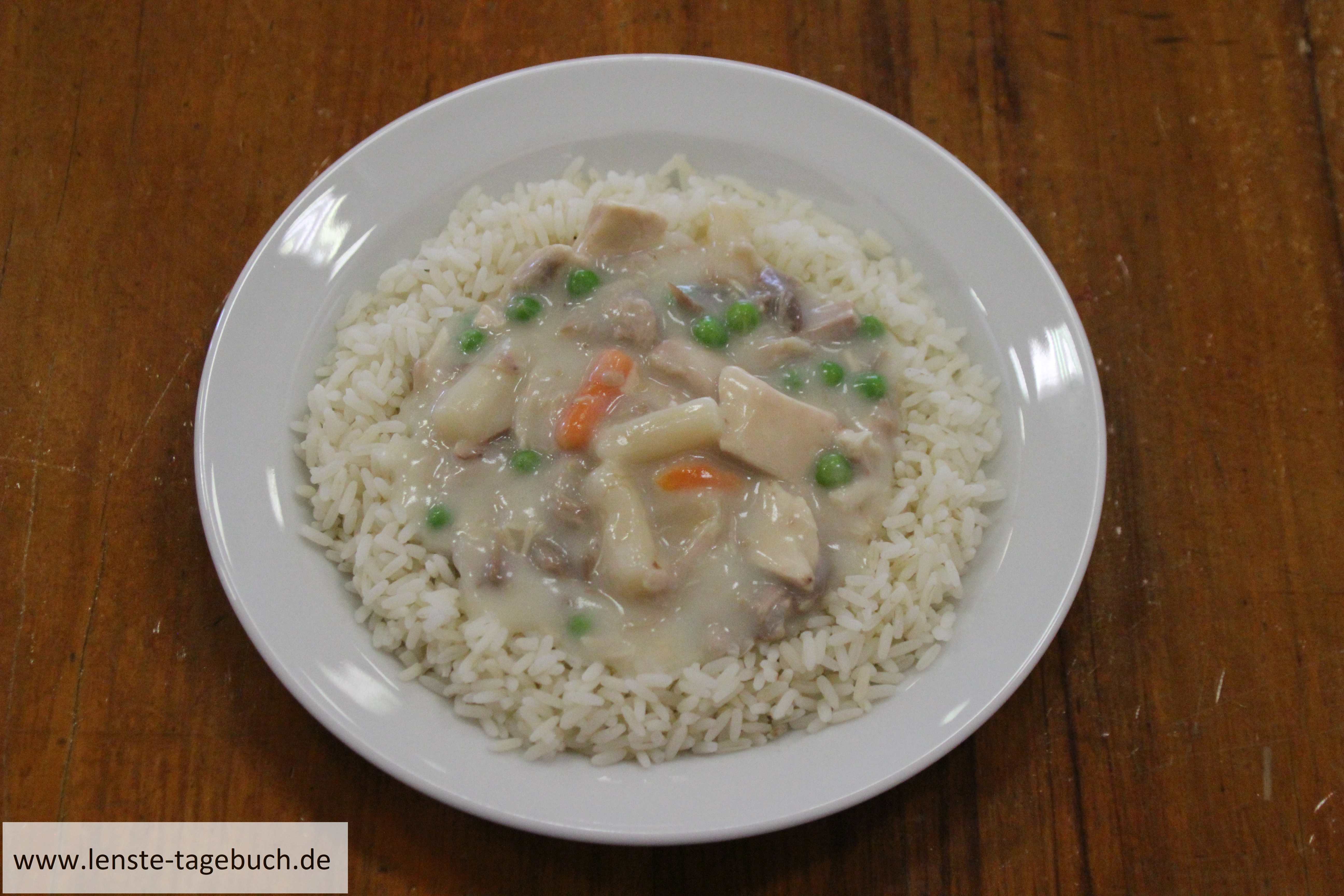 Zur Mittagsstunde lauteten die Glocken und riefen zum Mittagessen. Heute wurde Hühnerfrikassee an Reis mit einem Salat gereicht.