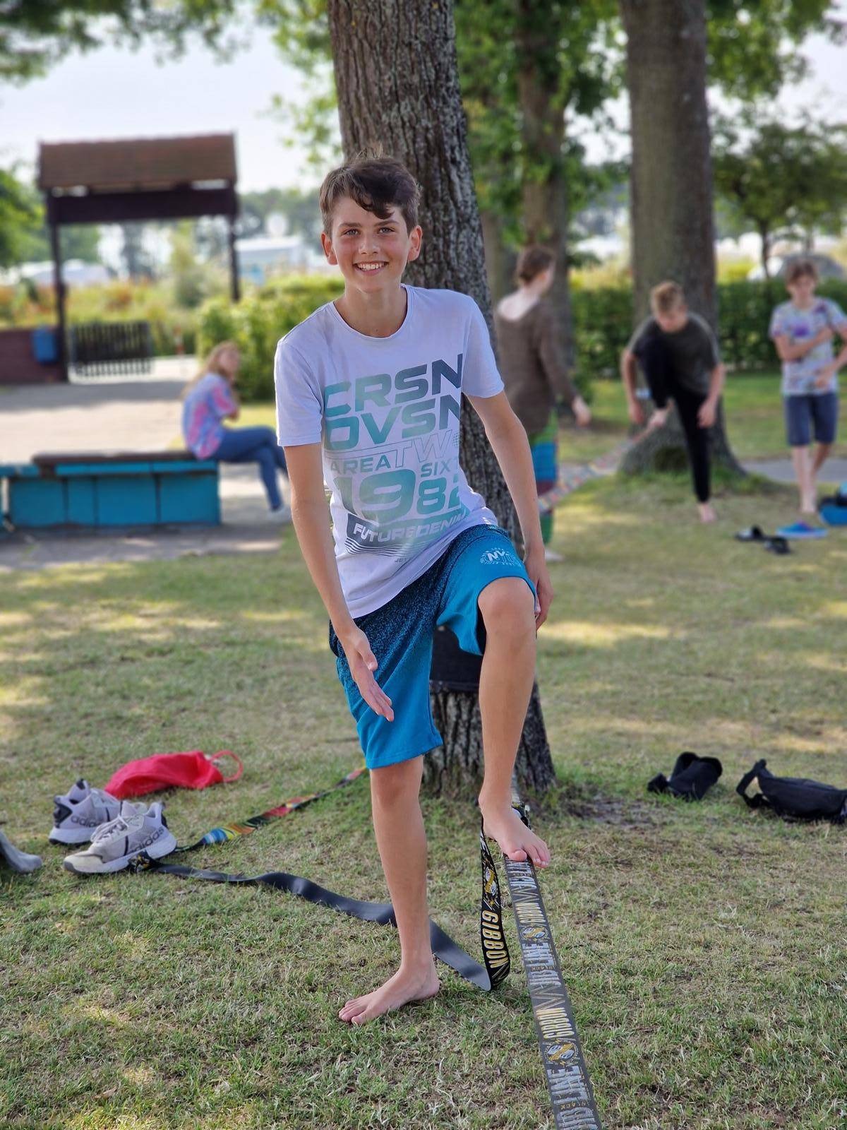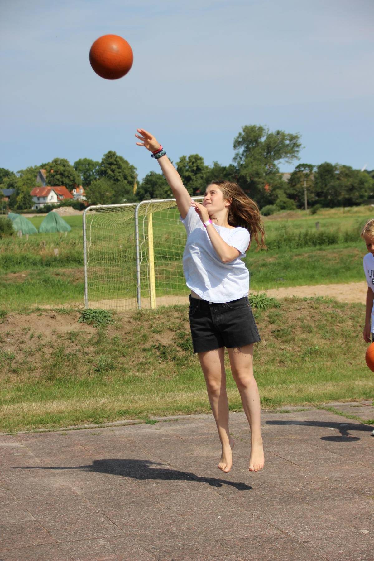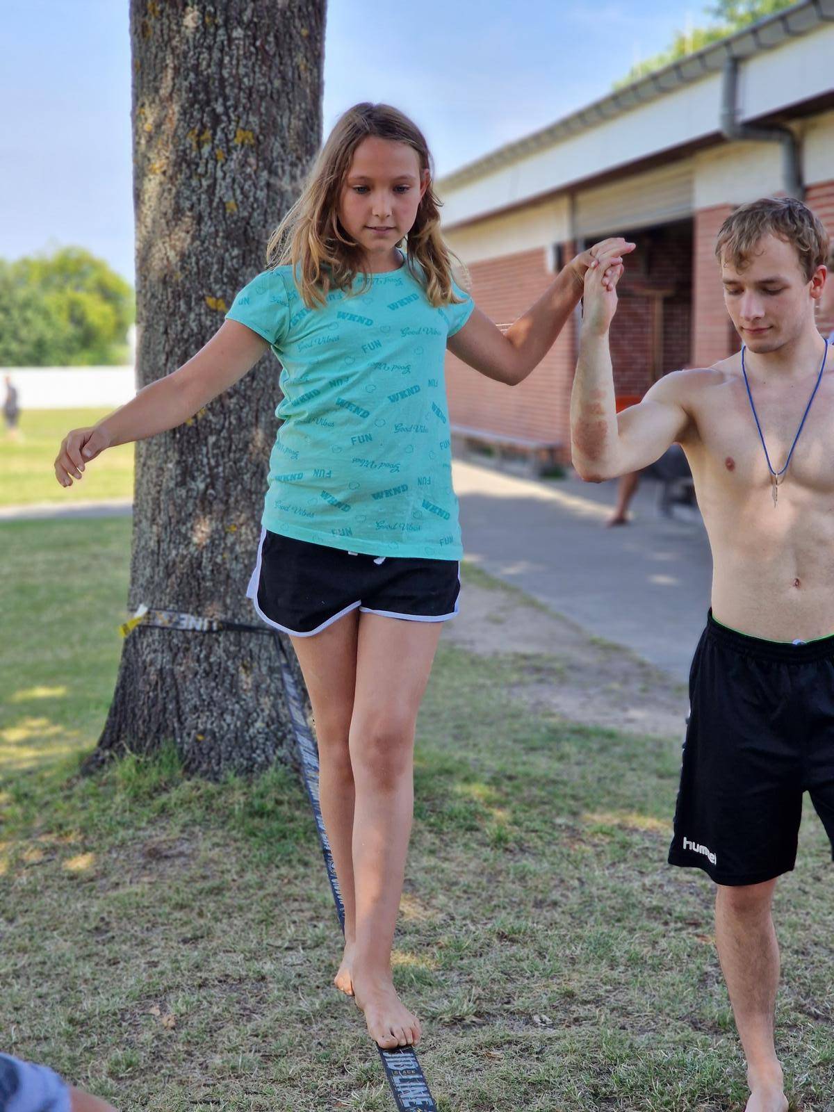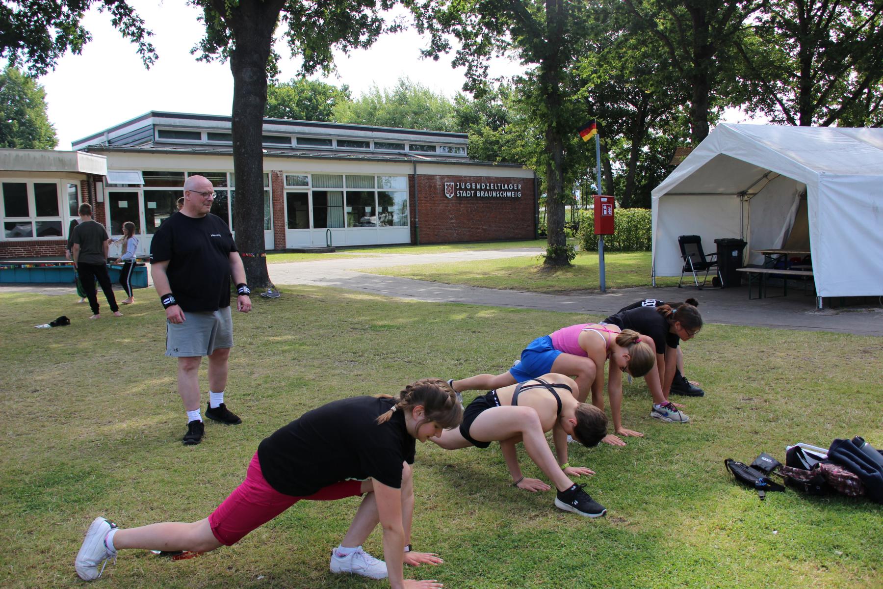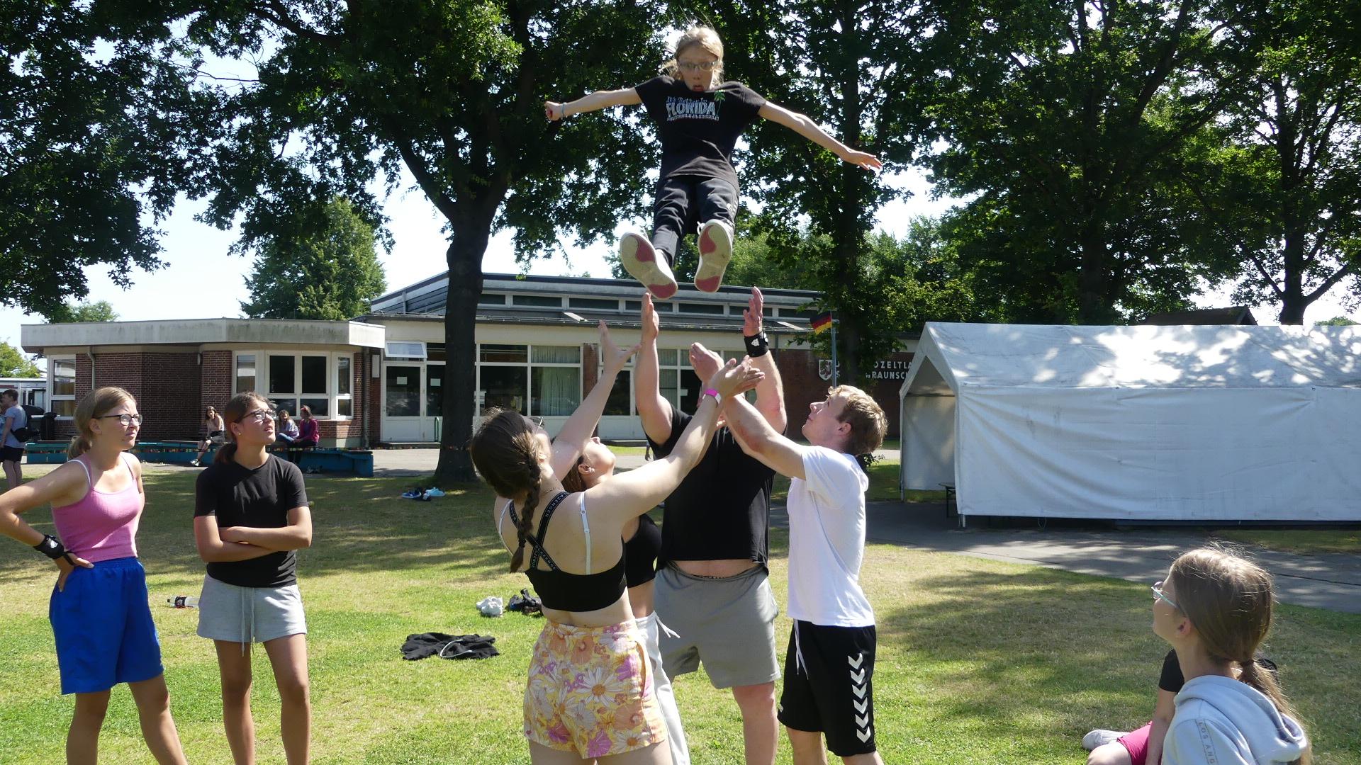 Nach dem Frühstück begann das Sporttraining. Das Gleichgewicht konnte auf der Slagline geschult werden. Auch beim Cheerleading war es möglich sein Gleichgewicht, den festen Stand und das verhalten in der Luft zu optimieren. Durch Fußball, Basketball, Badminton und Volleyball konnte man seine Agilität, Geschwindigkeit und Geschicklichkeit verbessern.