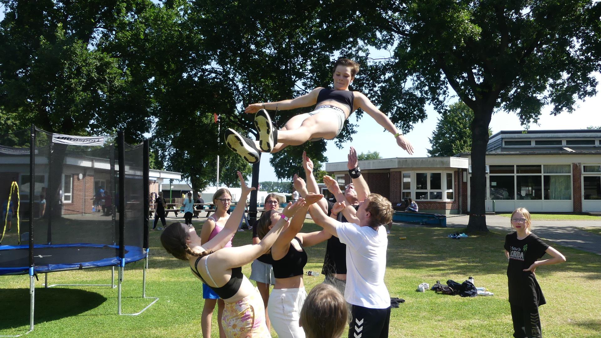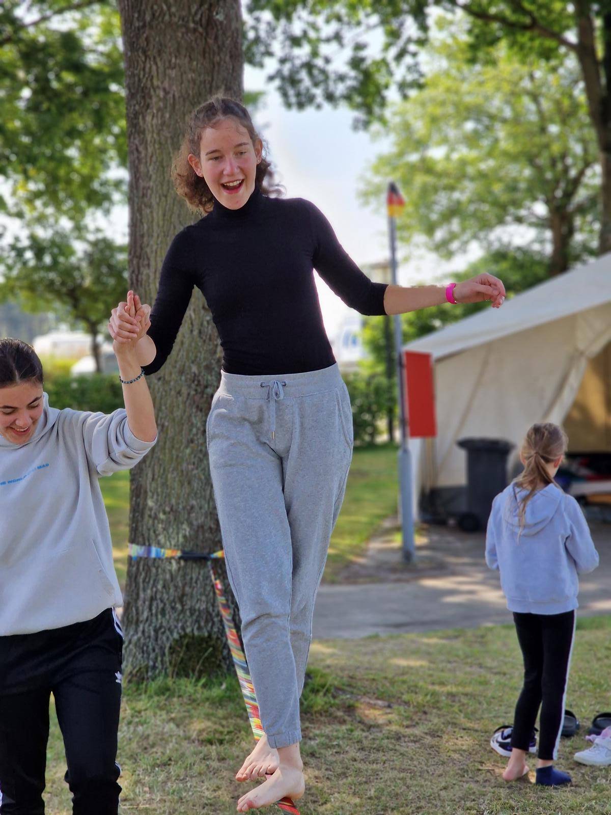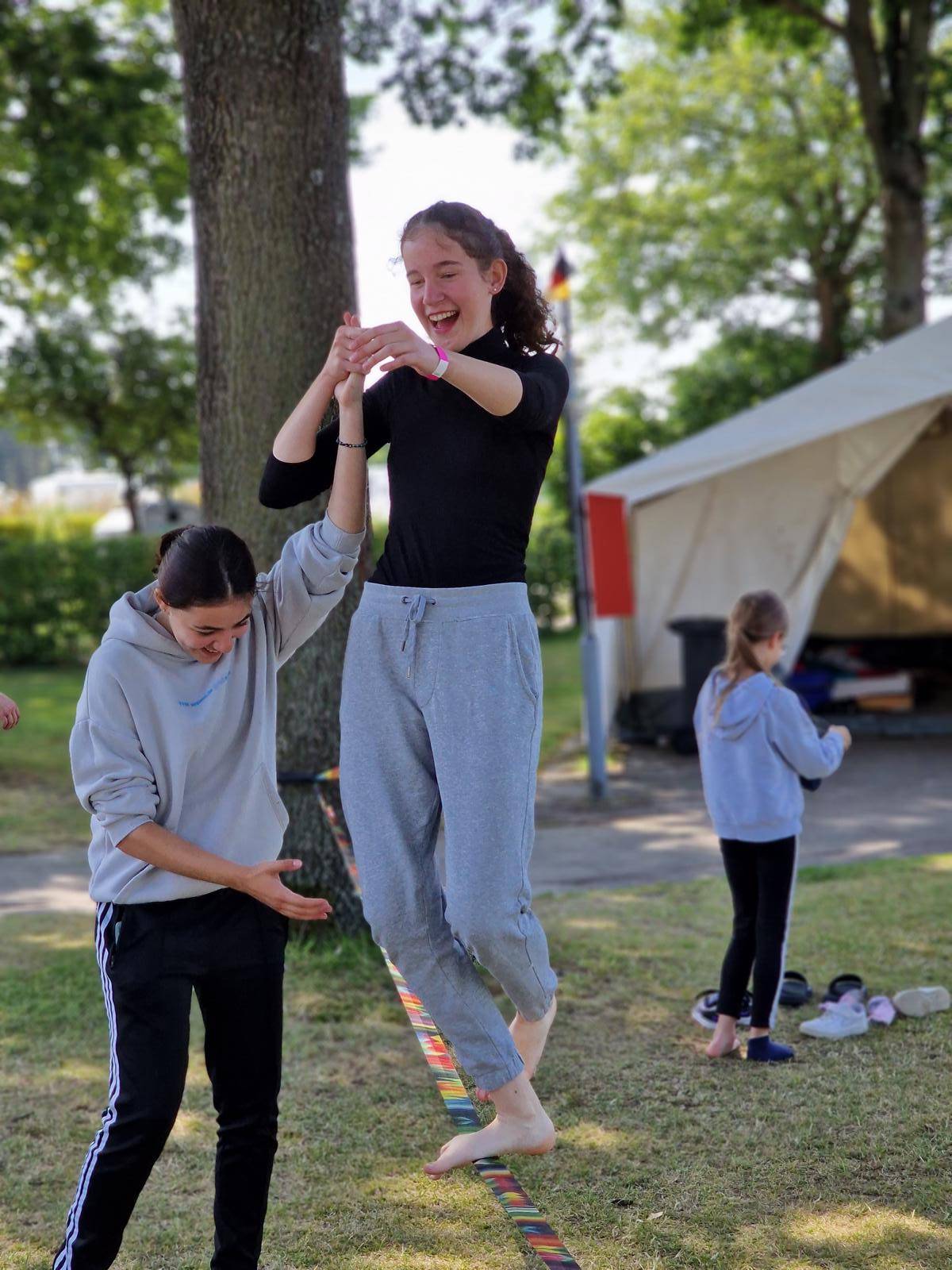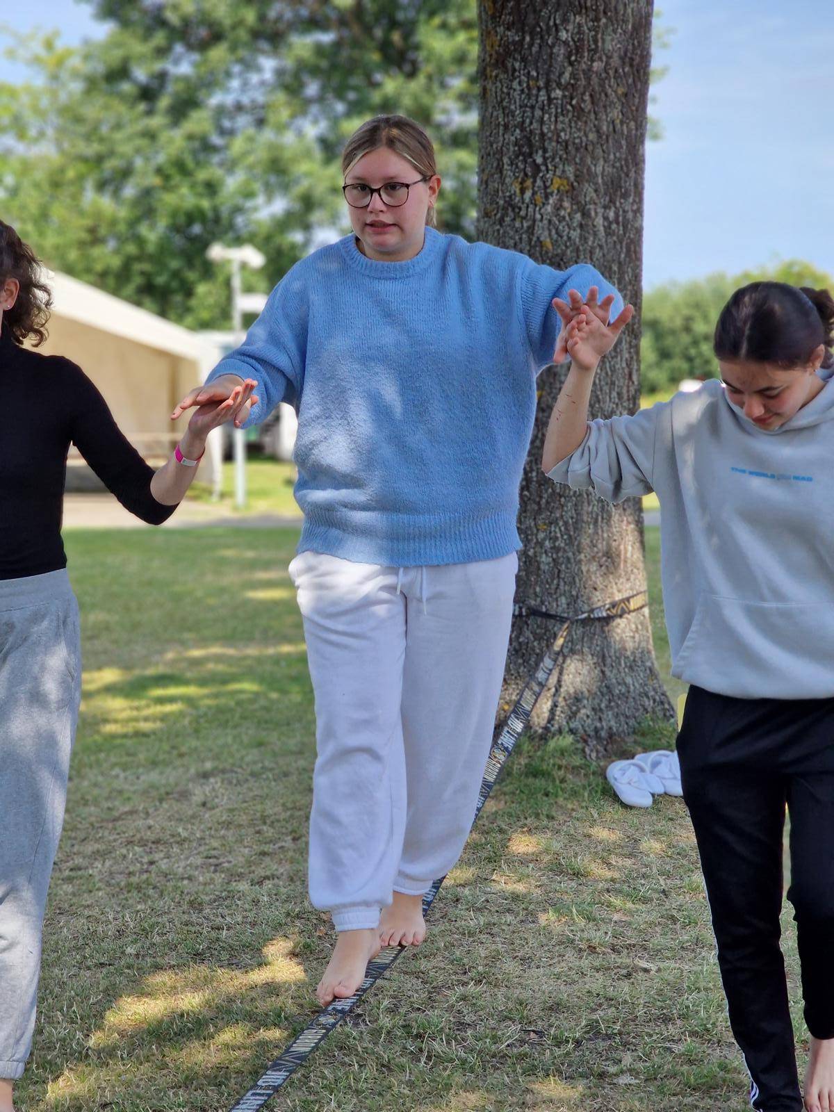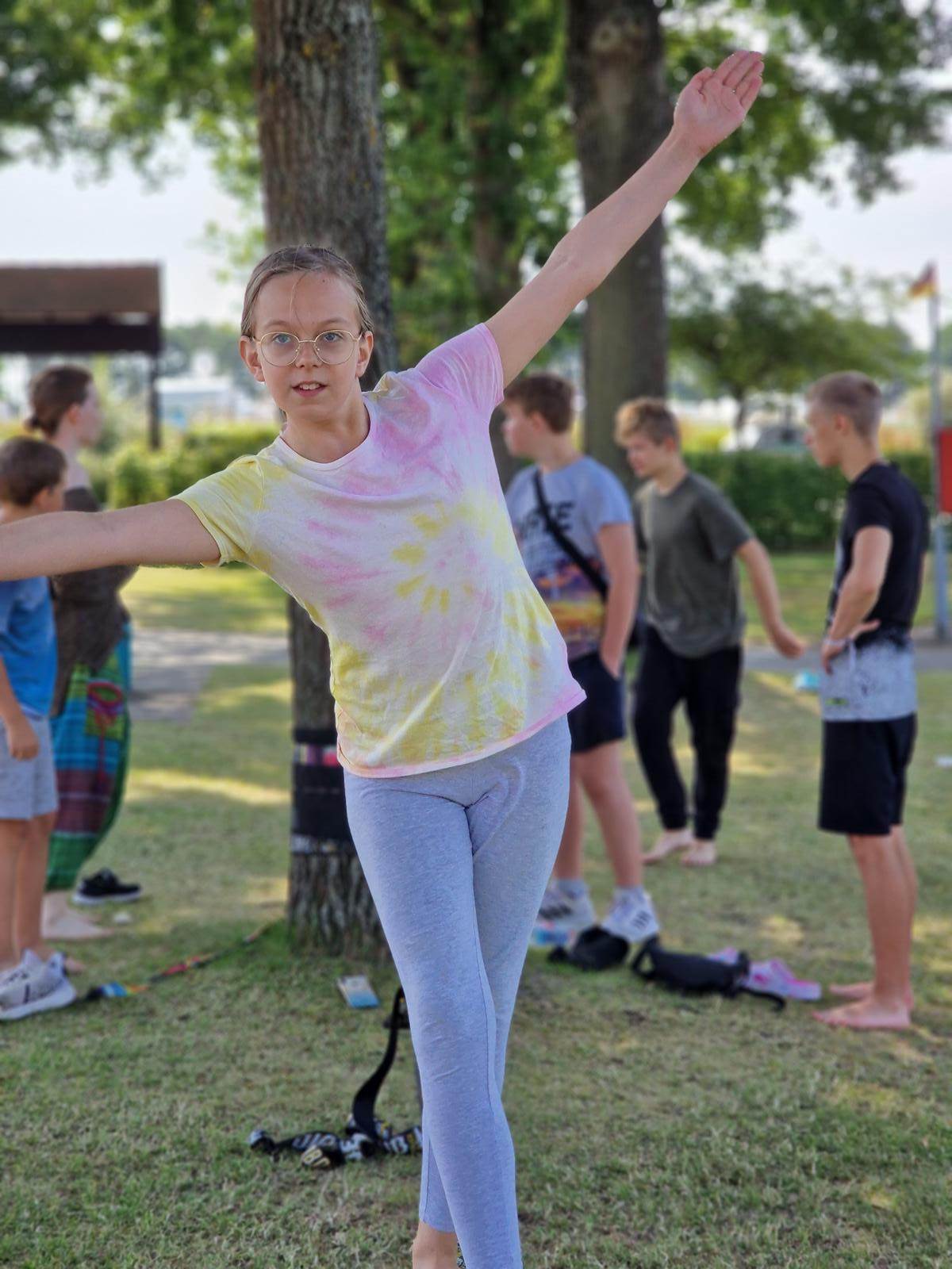 Nach dem Frühstück begann das Sporttraining. Das Gleichgewicht konnte auf der Slagline geschult werden. Auch beim Cheerleading war es möglich sein Gleichgewicht, den festen Stand und das verhalten in der Luft zu optimieren. Durch Fußball, Basketball, Badminton und Volleyball konnte man seine Agilität, Geschwindigkeit und Geschicklichkeit verbessern.