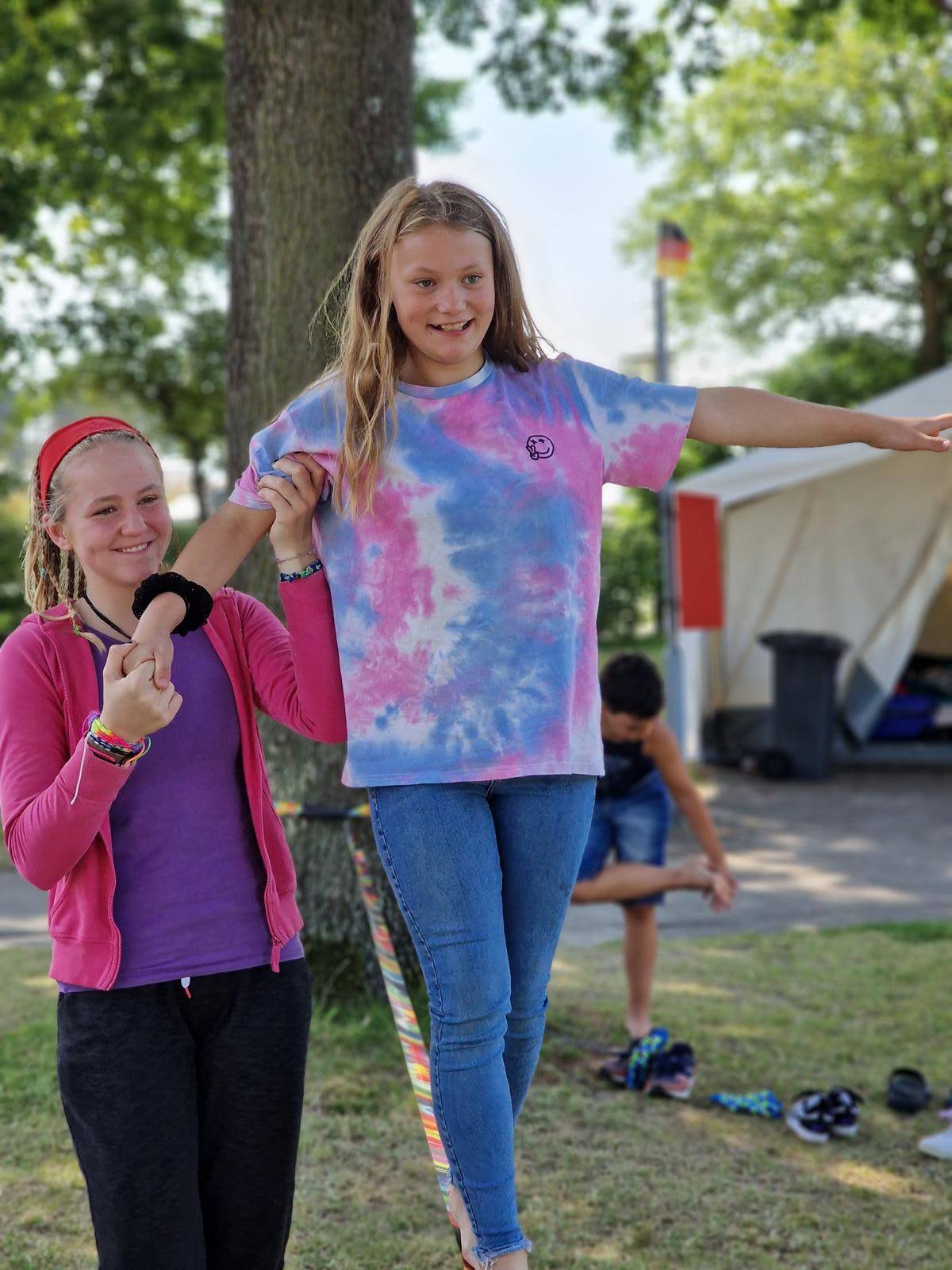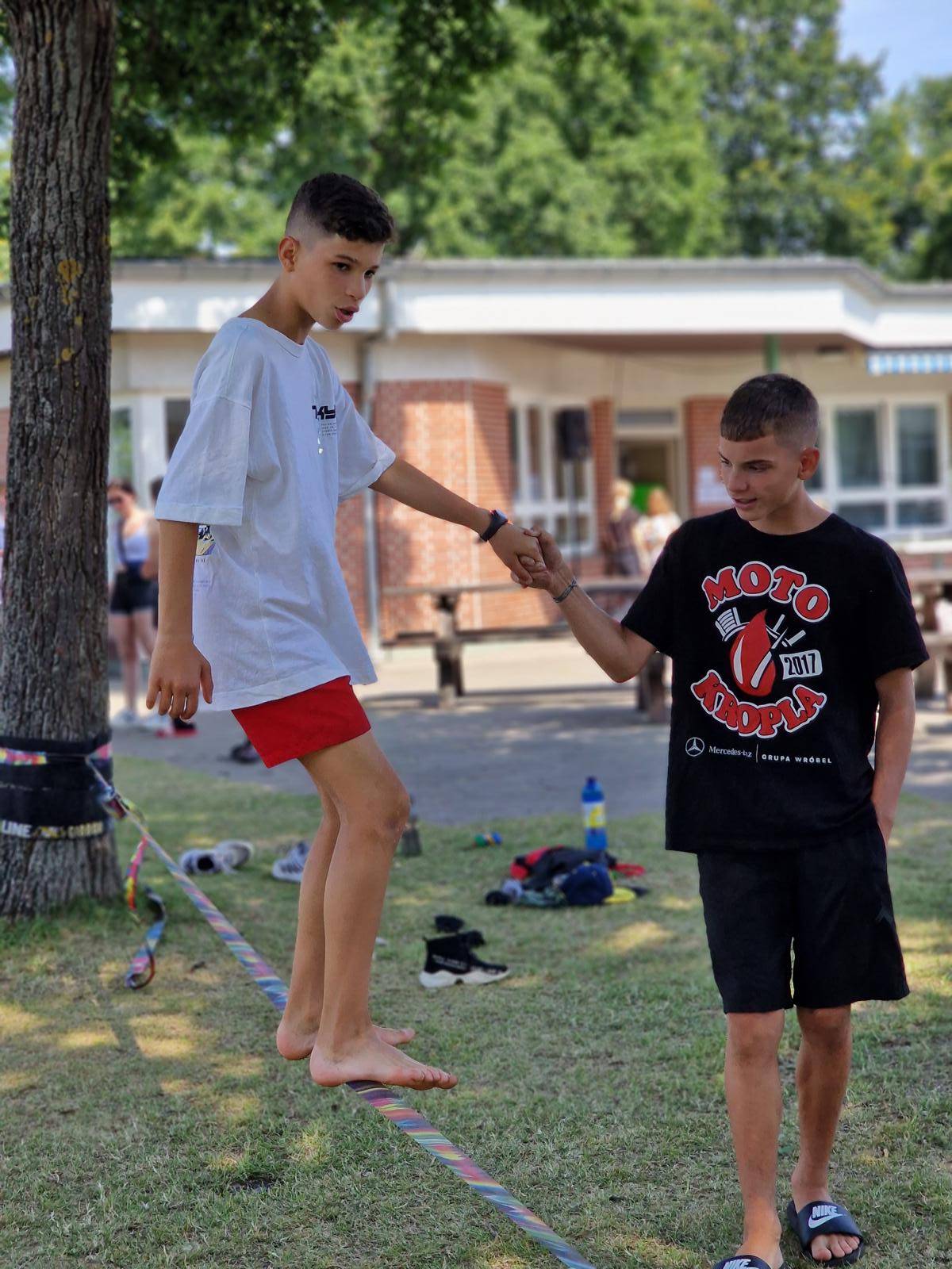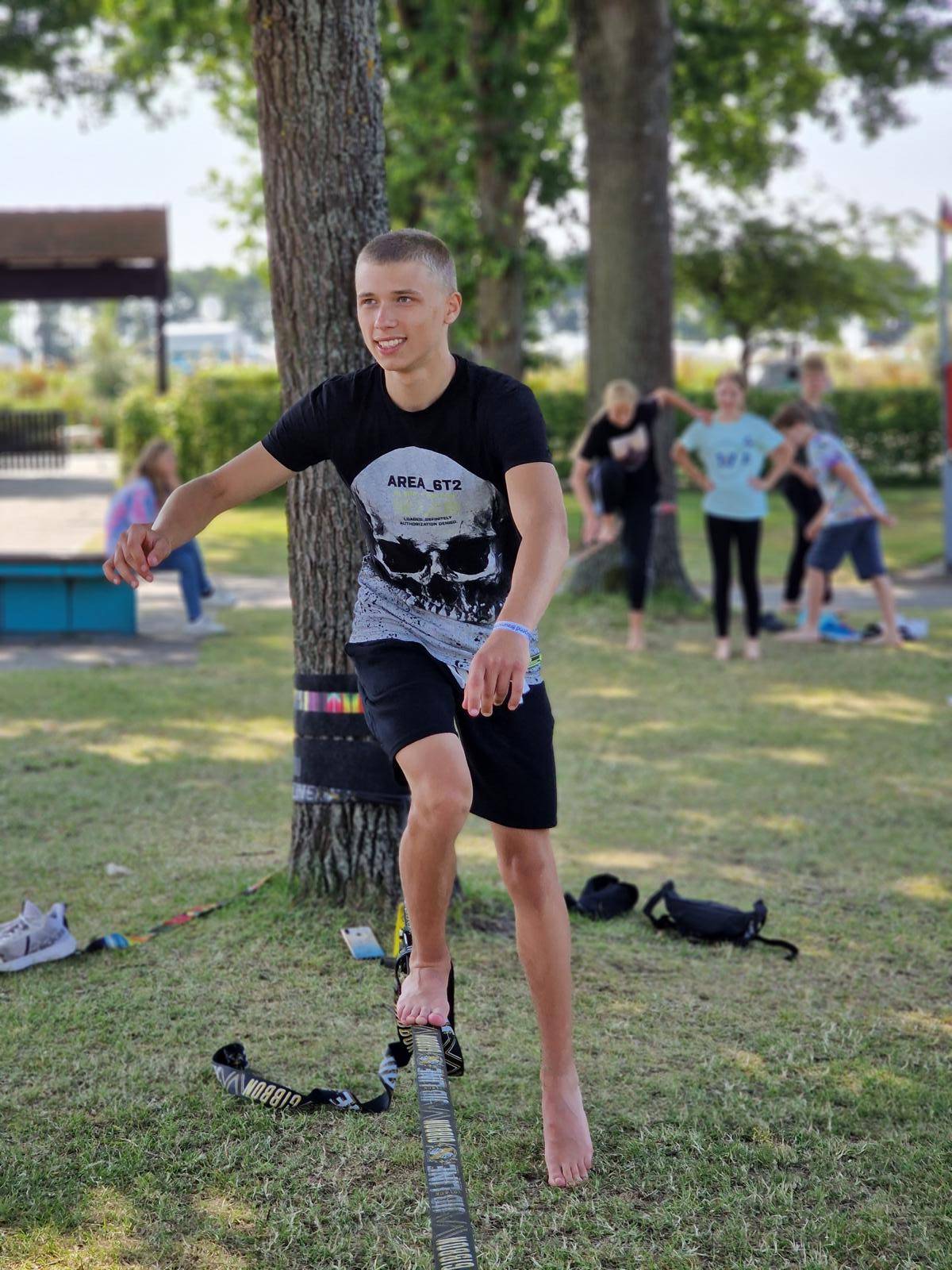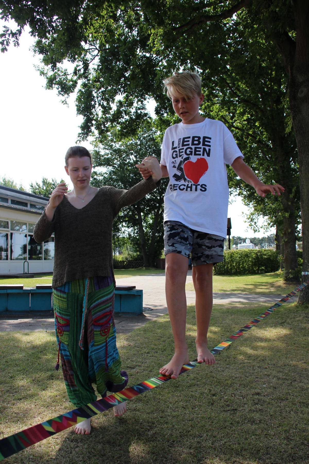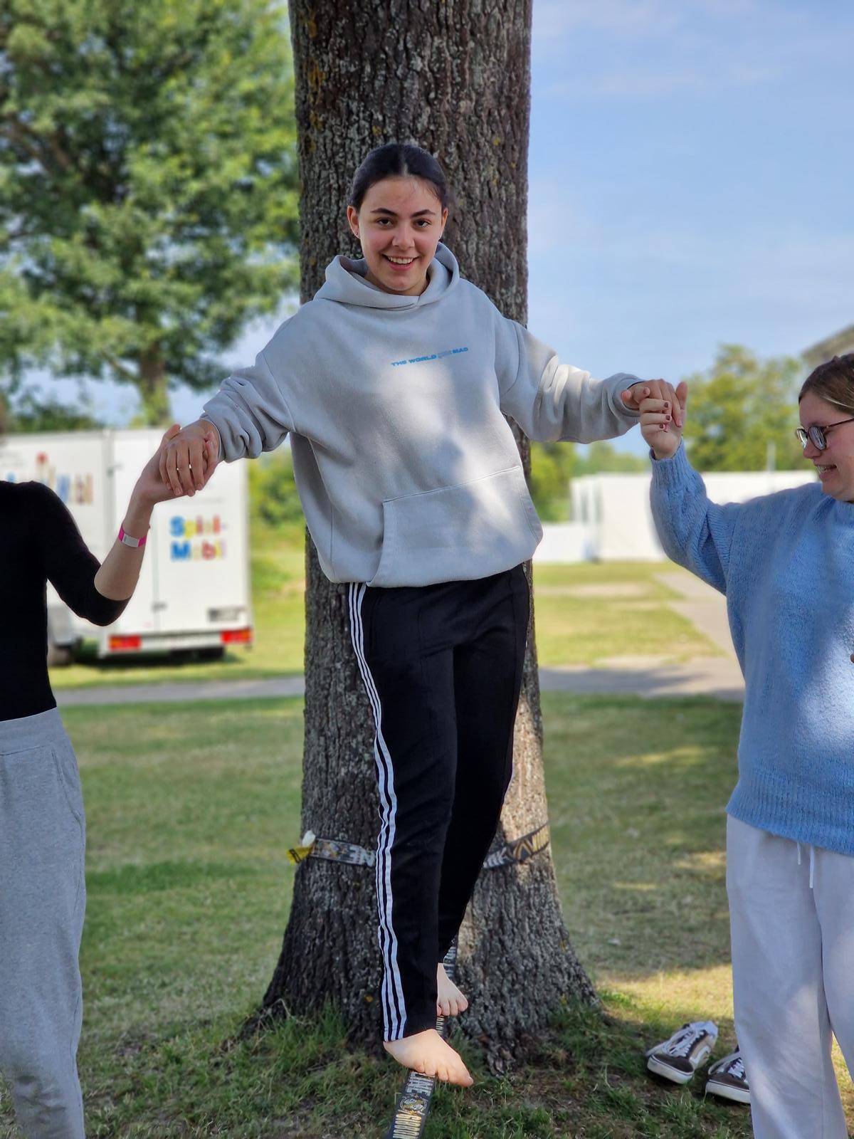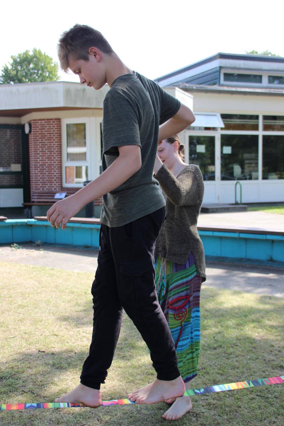 Nach dem Frühstück begann das Sporttraining. Das Gleichgewicht konnte auf der Slagline geschult werden. Auch beim Cheerleading war es möglich sein Gleichgewicht, den festen Stand und das verhalten in der Luft zu optimieren. Durch Fußball, Basketball, Badminton und Volleyball konnte man seine Agilität, Geschwindigkeit und Geschicklichkeit verbessern.