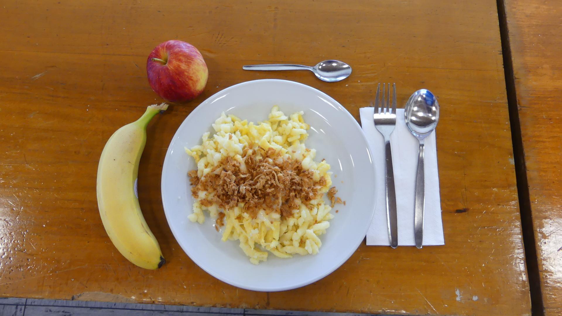 Zum Mittagessen gab es Allgäuer Käsespätzle mit Béchamelsauce und frischem Obst zum Nachtisch.