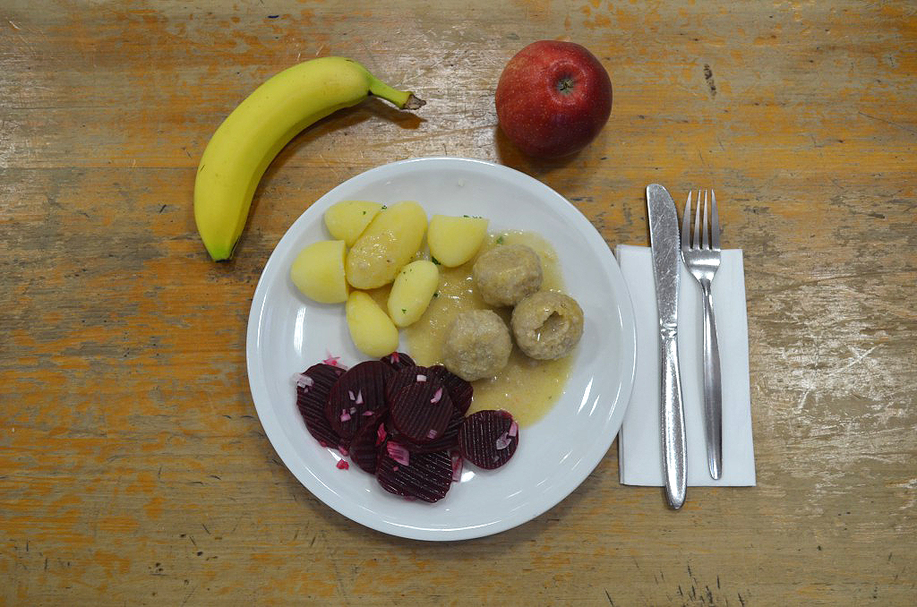Unser Mittagessen: Kartoffeln, Königsberger Klopse und Rote Beete.