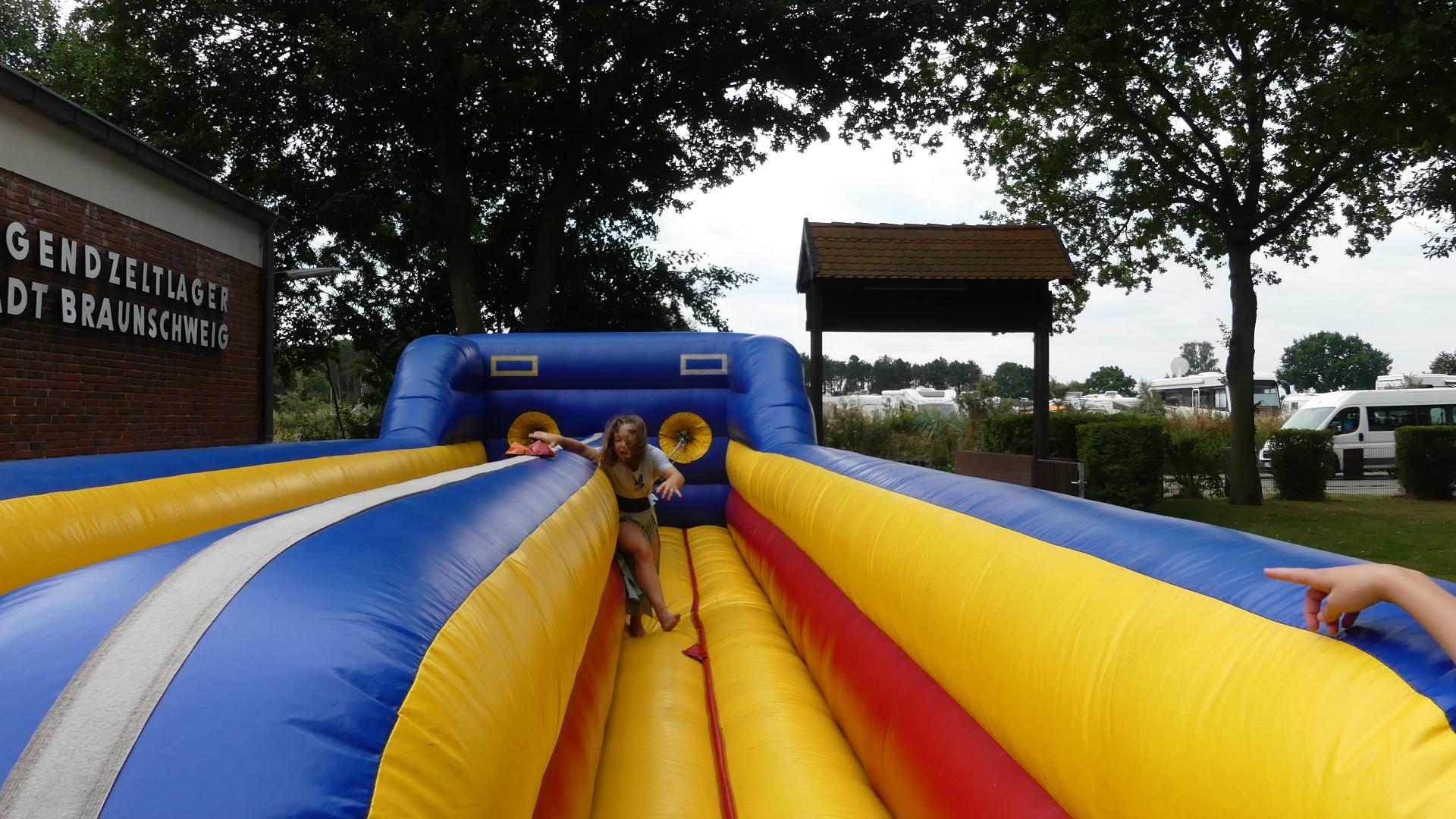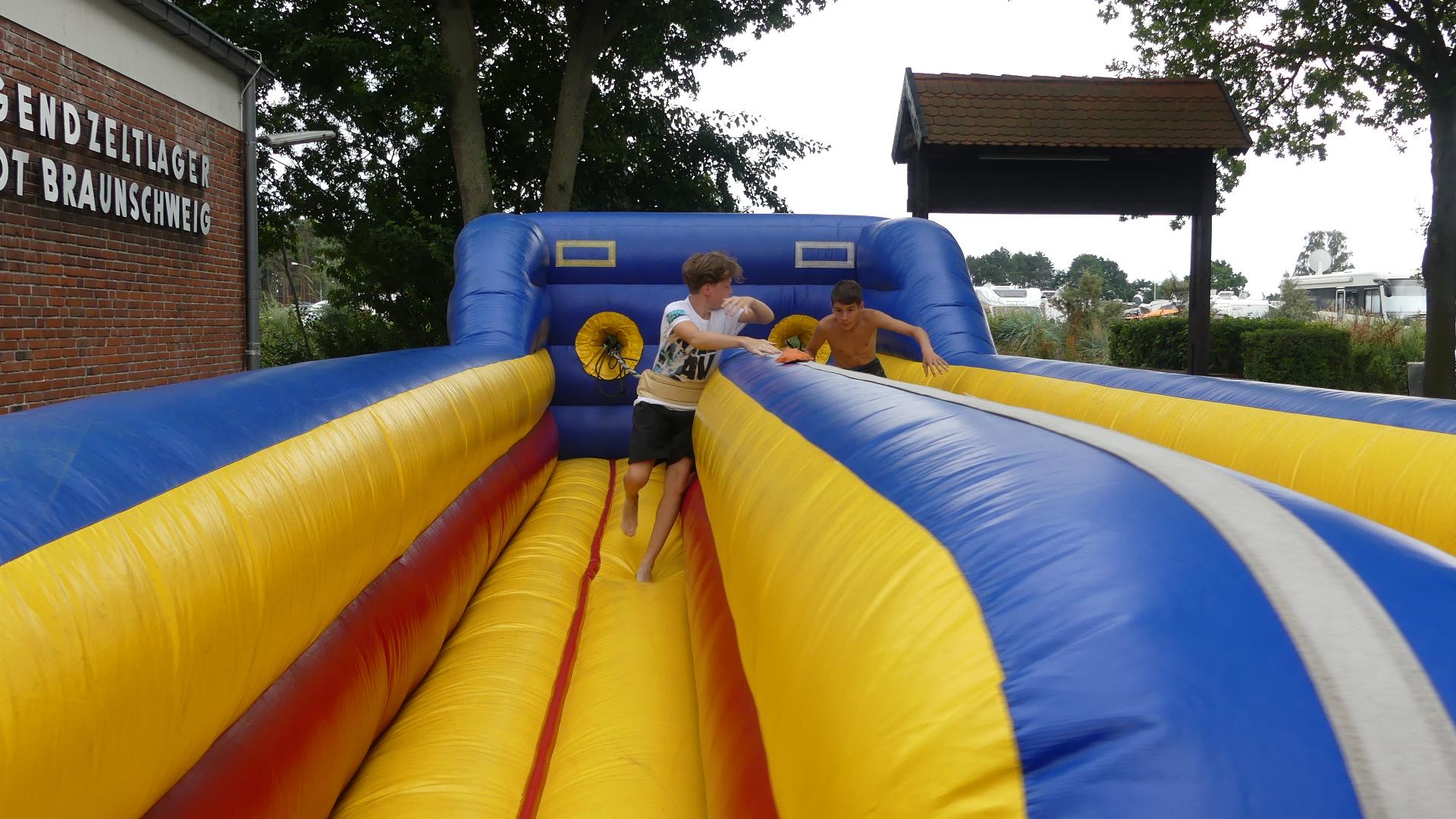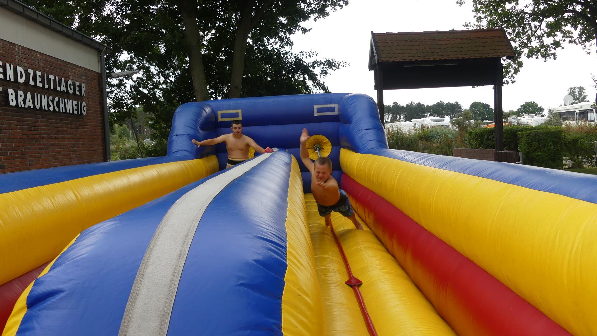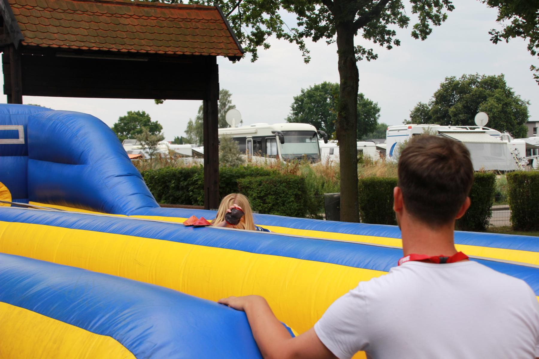 Beim Bungeerun ging es darum, ein Kissen so weit vorne zu platzieren wie möglich. Dabei wurden die Spieler am Bauch von einem Gummiseil zurückgehalten.