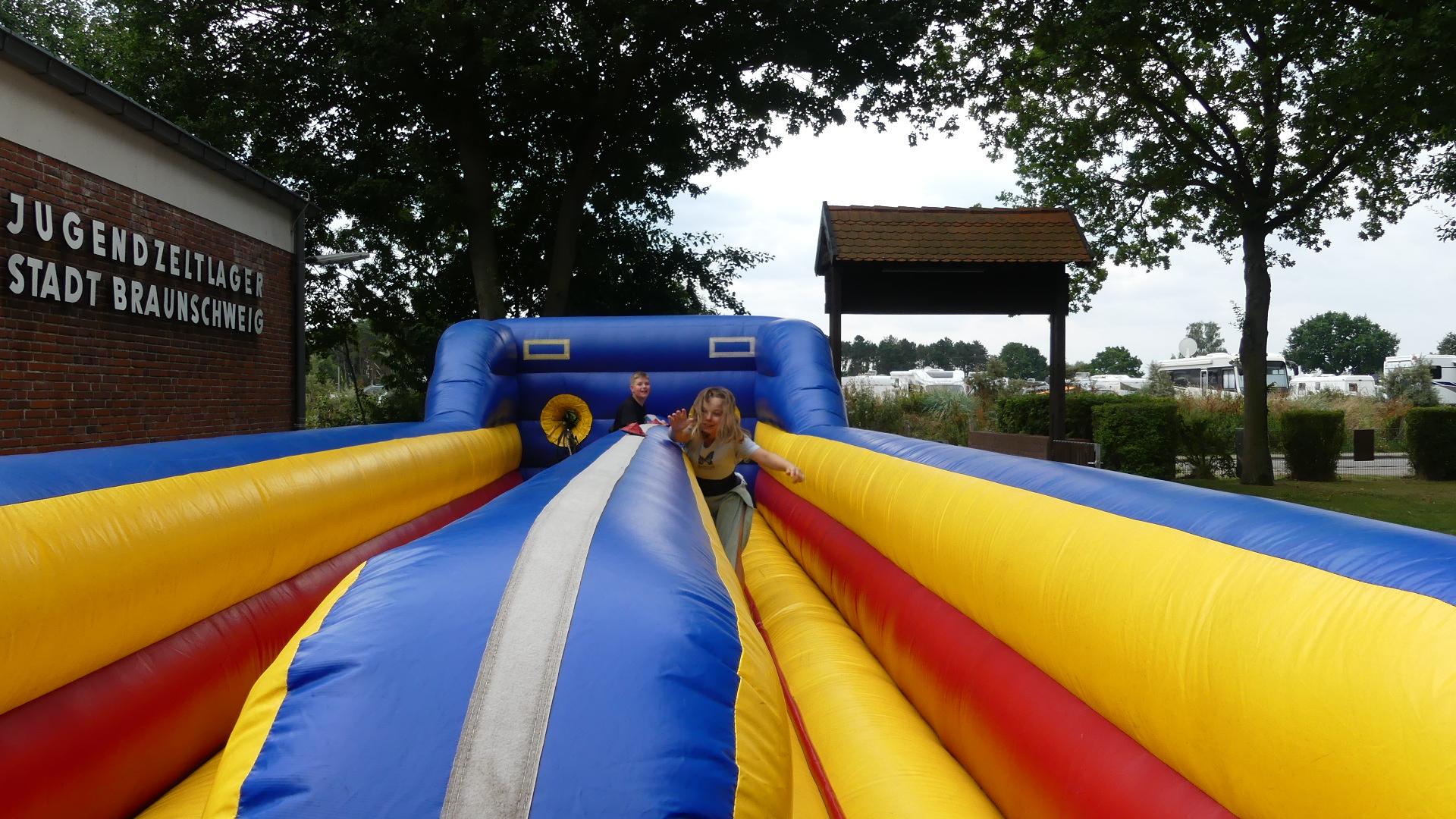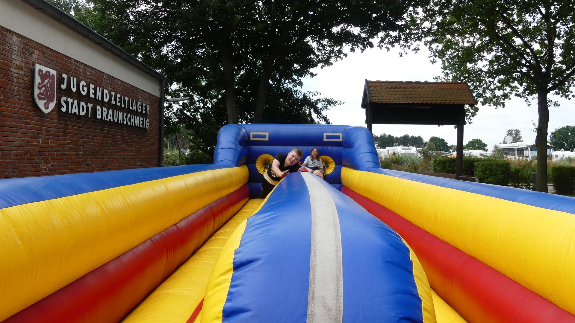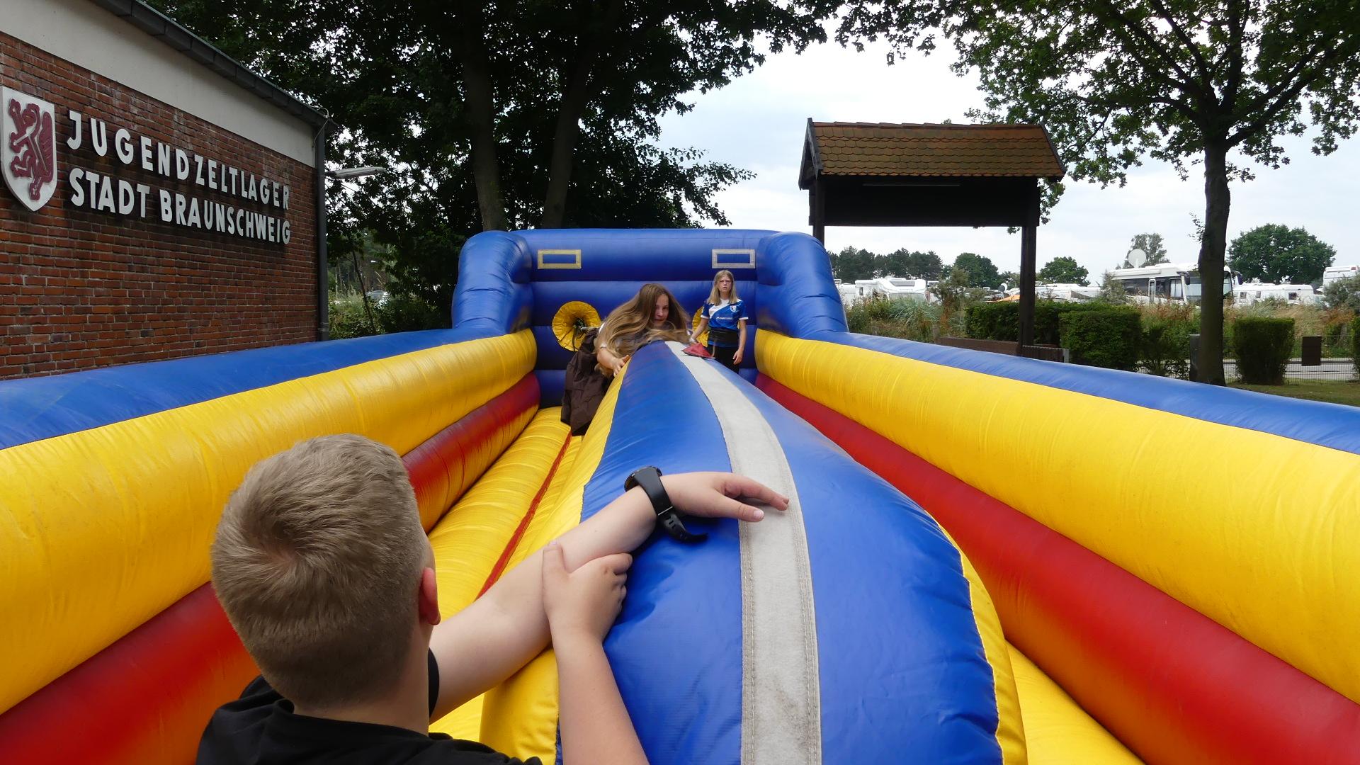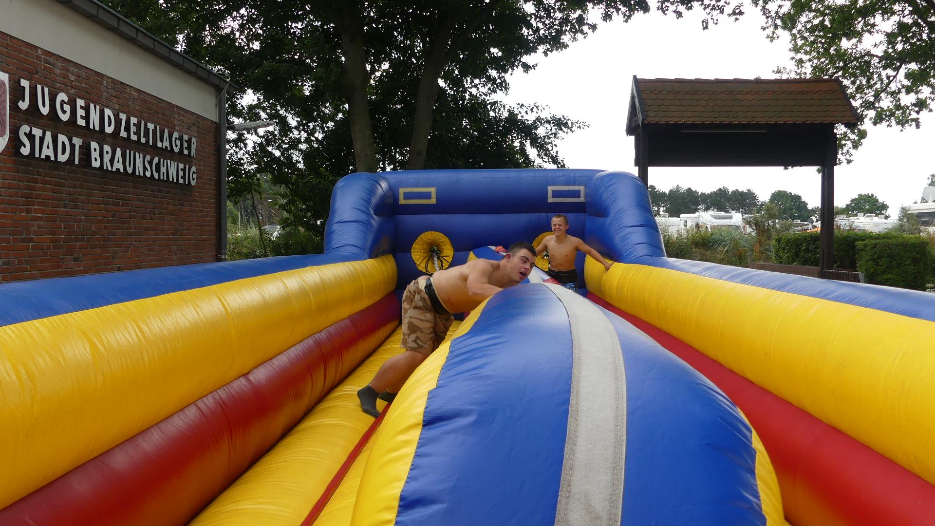 Beim Bungeerun ging es darum, ein Kissen so weit vorne zu platzieren wie möglich. Dabei wurden die Spieler am Bauch von einem Gummiseil zurückgehalten.