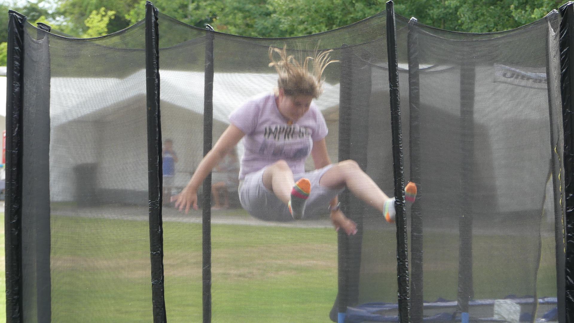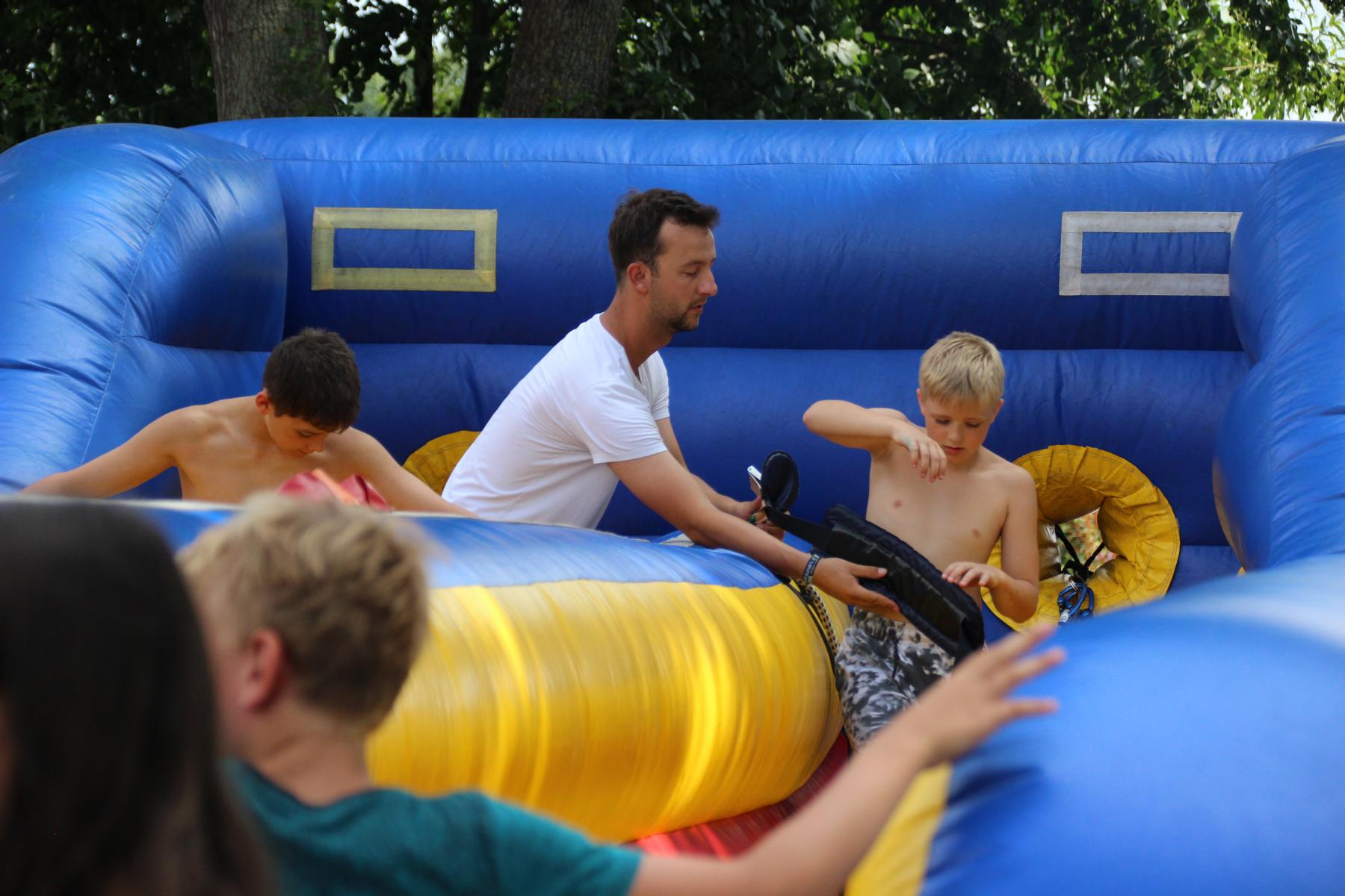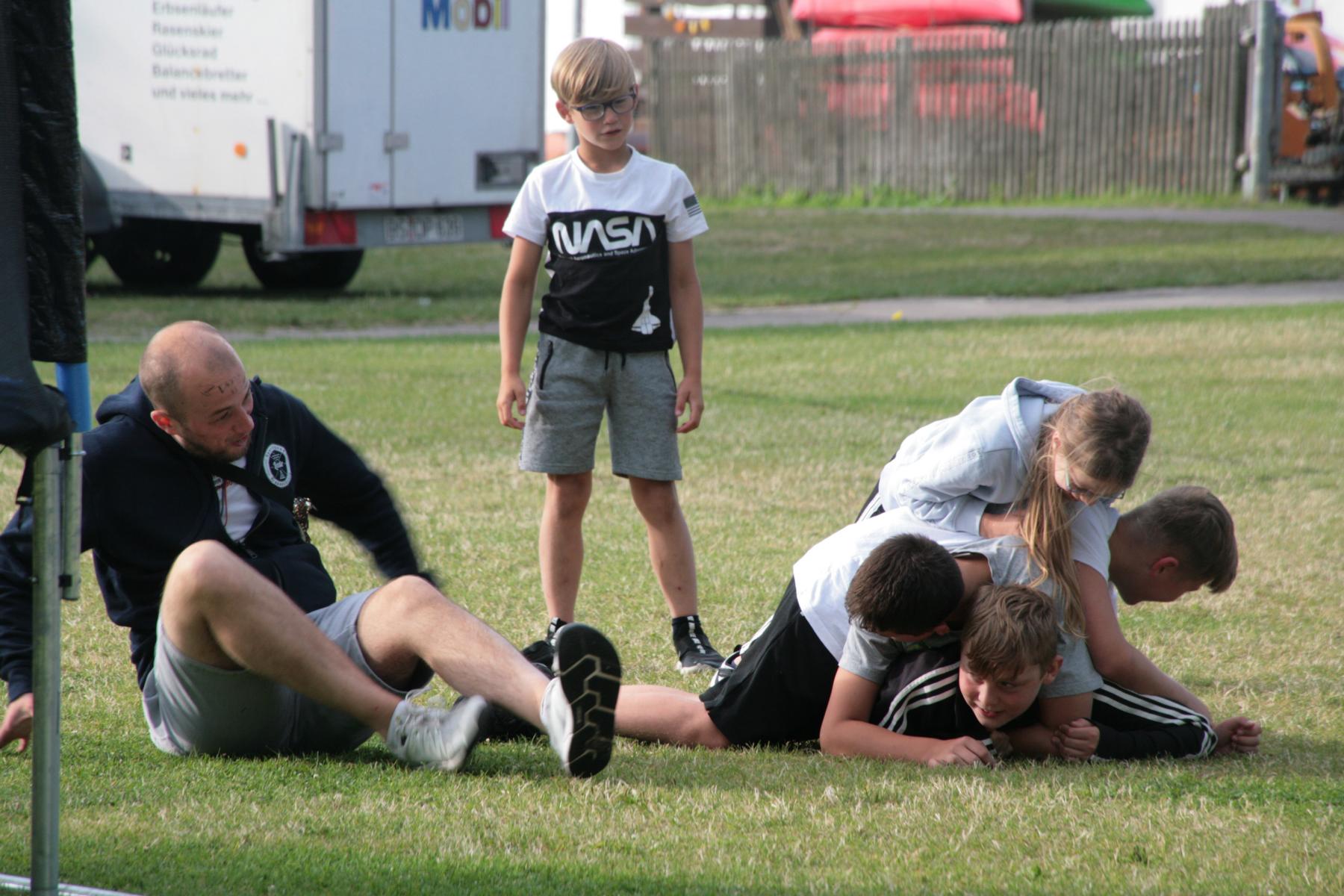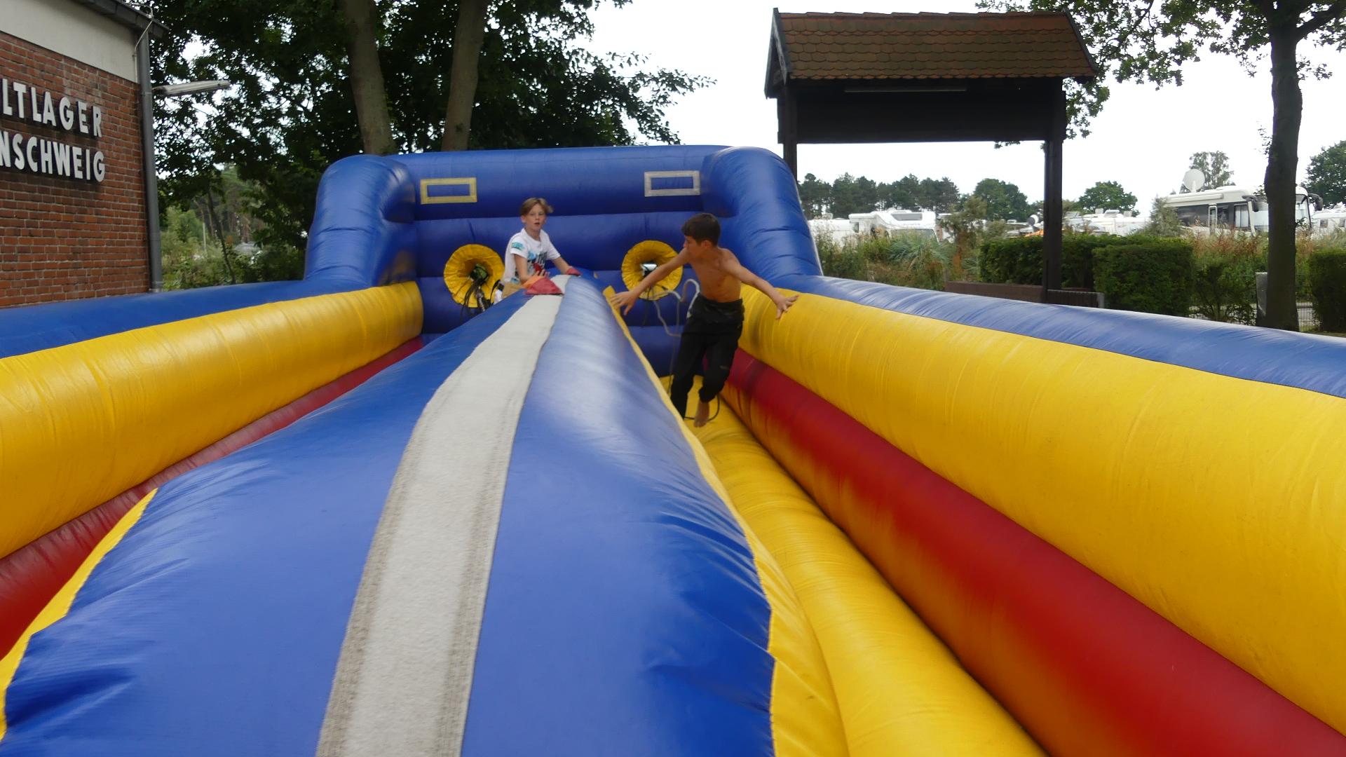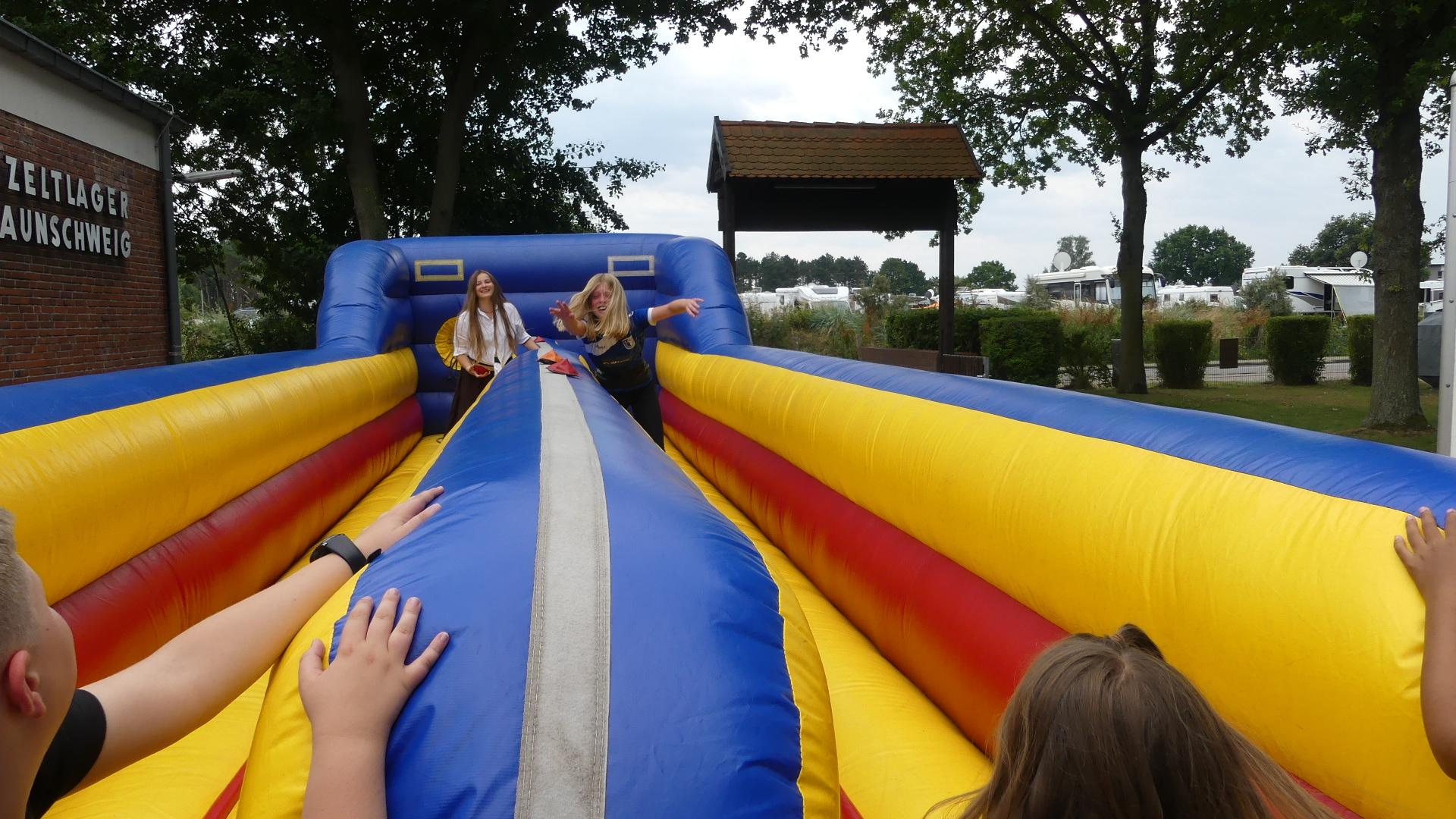 Beim Bungeerun ging es darum, ein Kissen so weit vorne zu platzieren wie möglich. Dabei wurden die Spieler am Bauch von einem Gummiseil zurückgehalten.