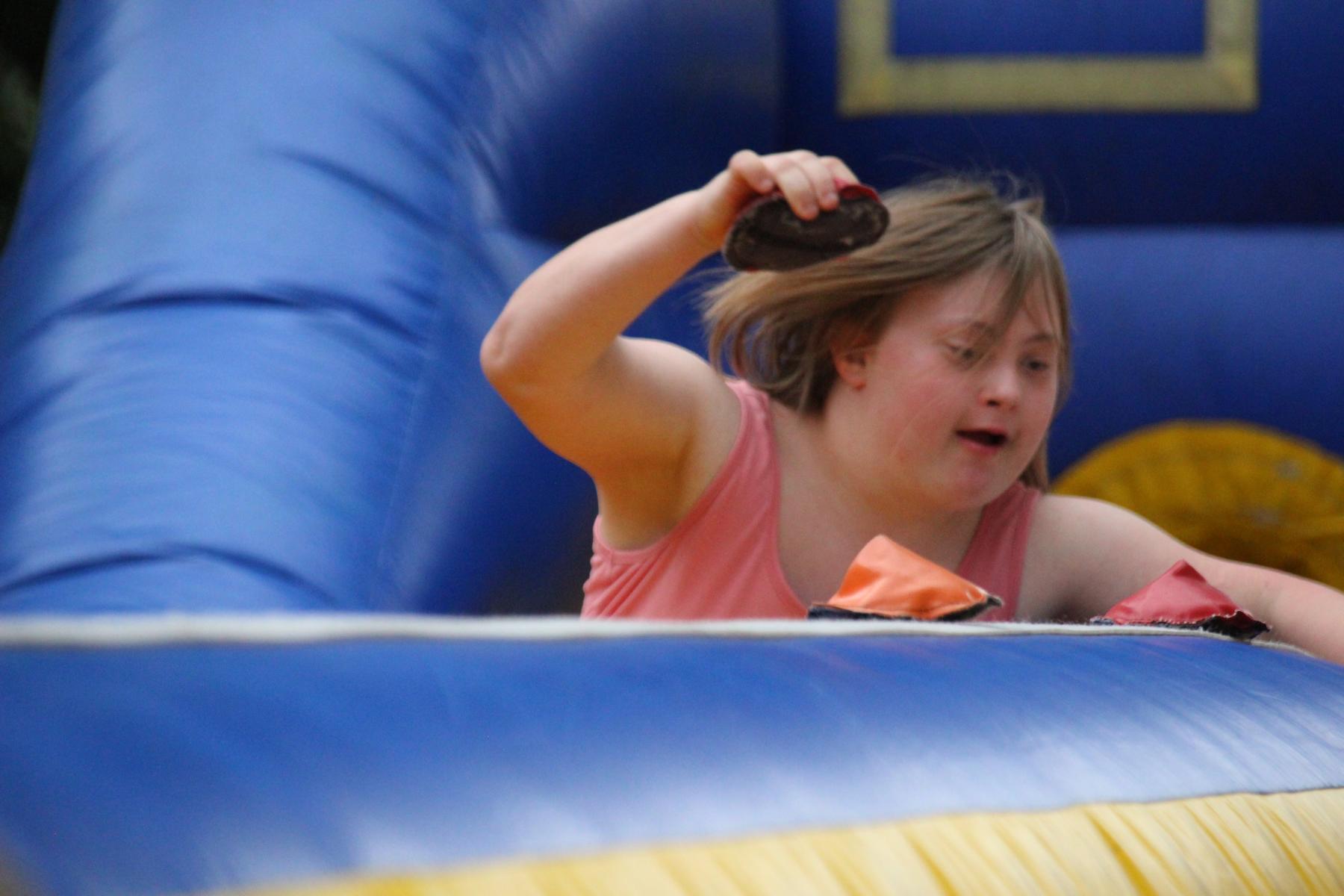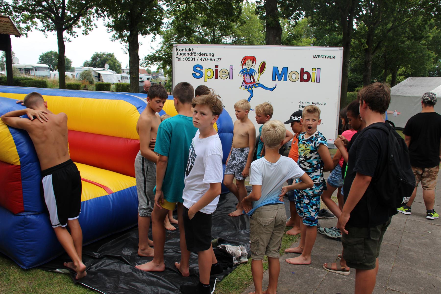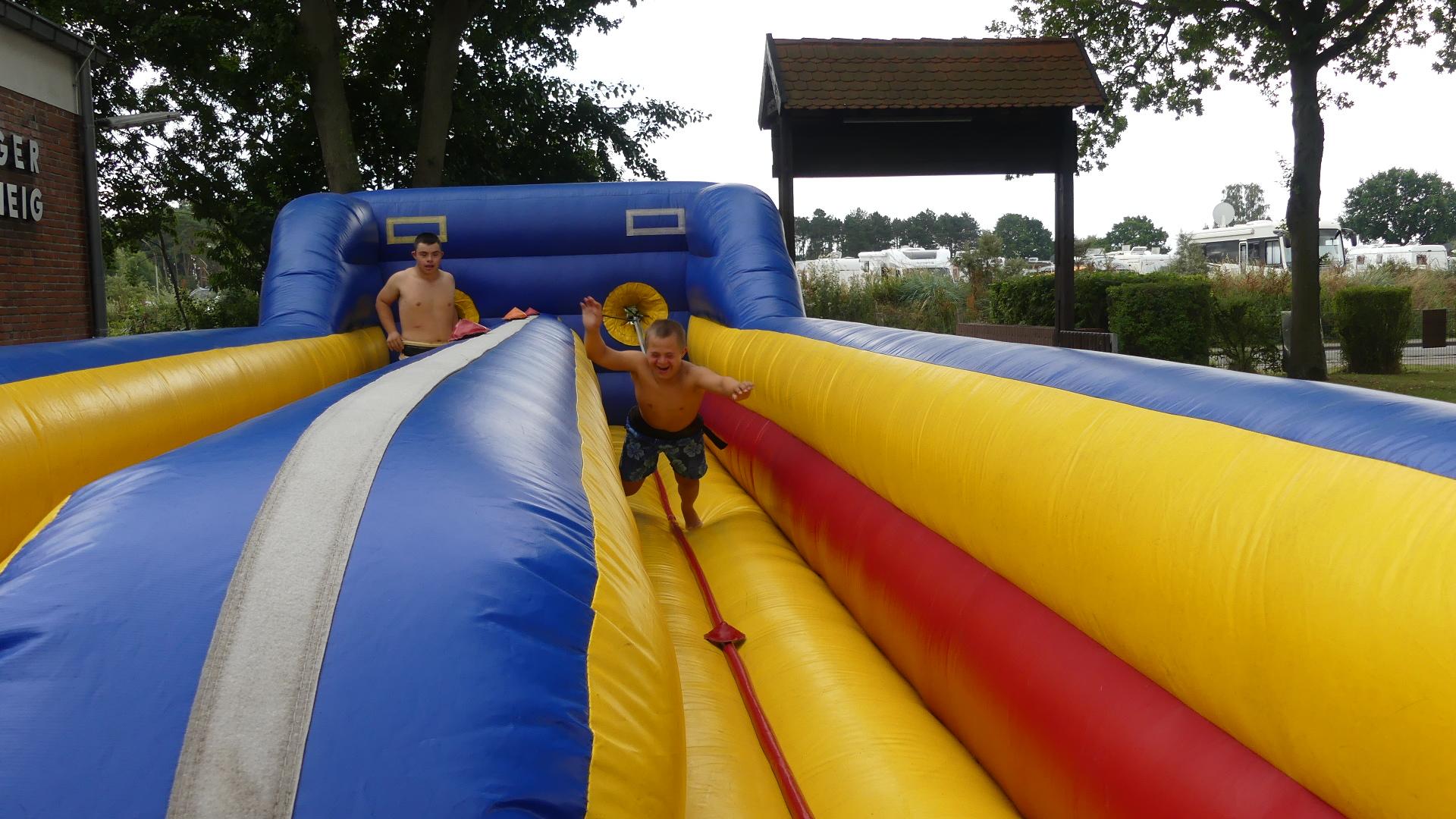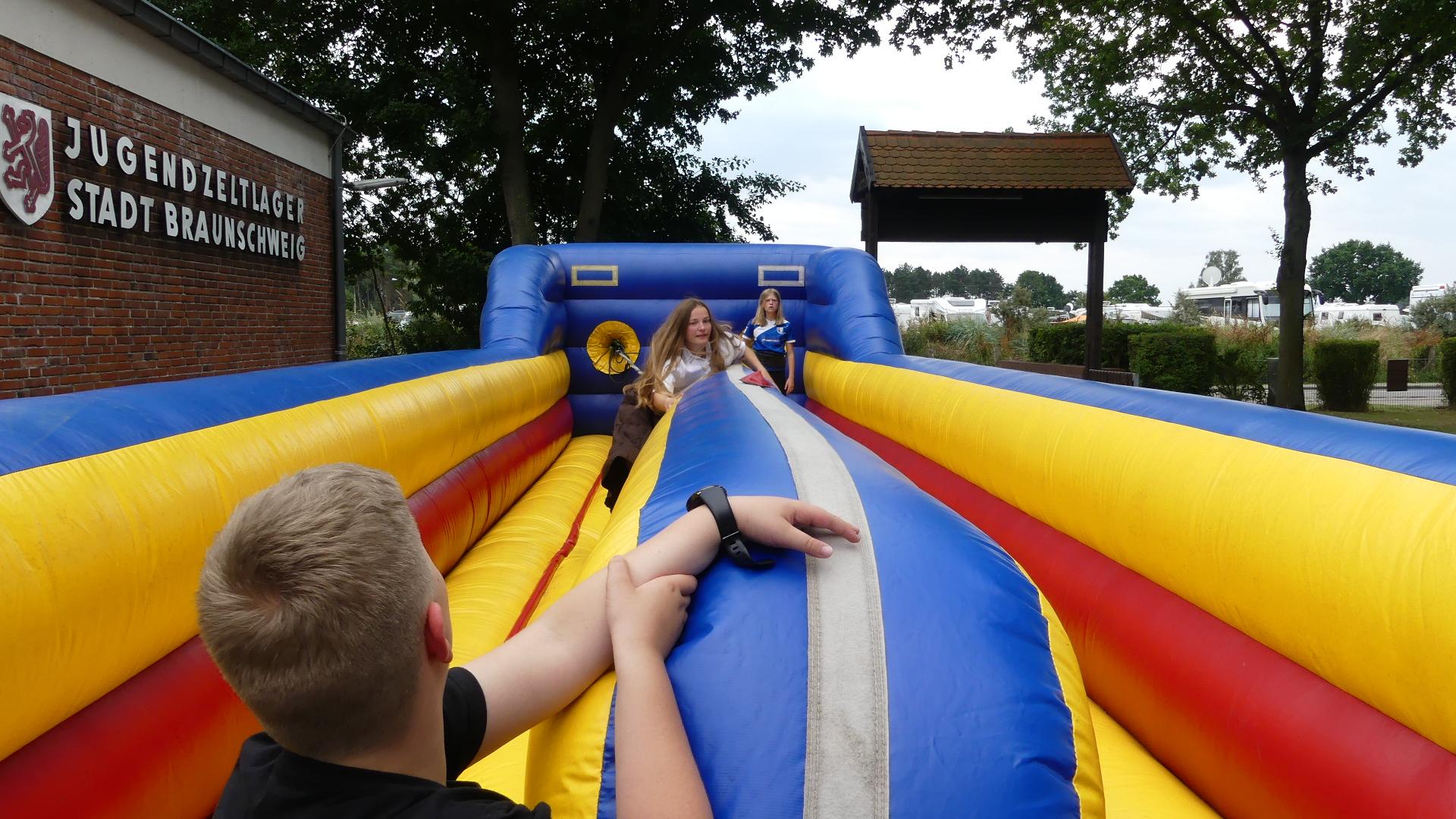 Beim Bungeerun ging es darum, ein Kissen so weit vorne zu platzieren wie möglich. Dabei wurden die Spieler am Bauch von einem Gummiseil zurückgehalten.