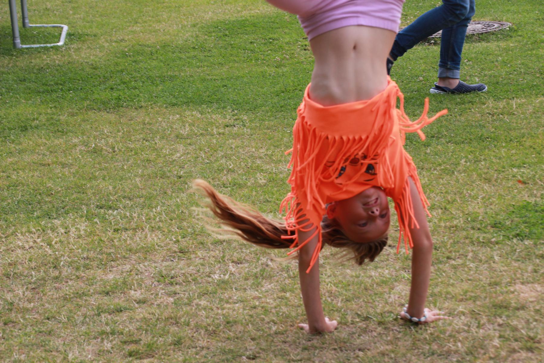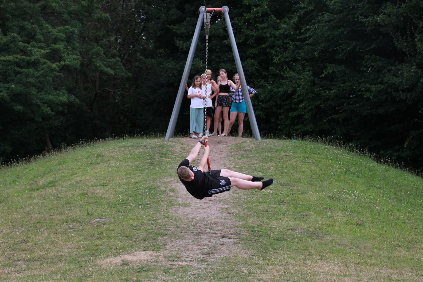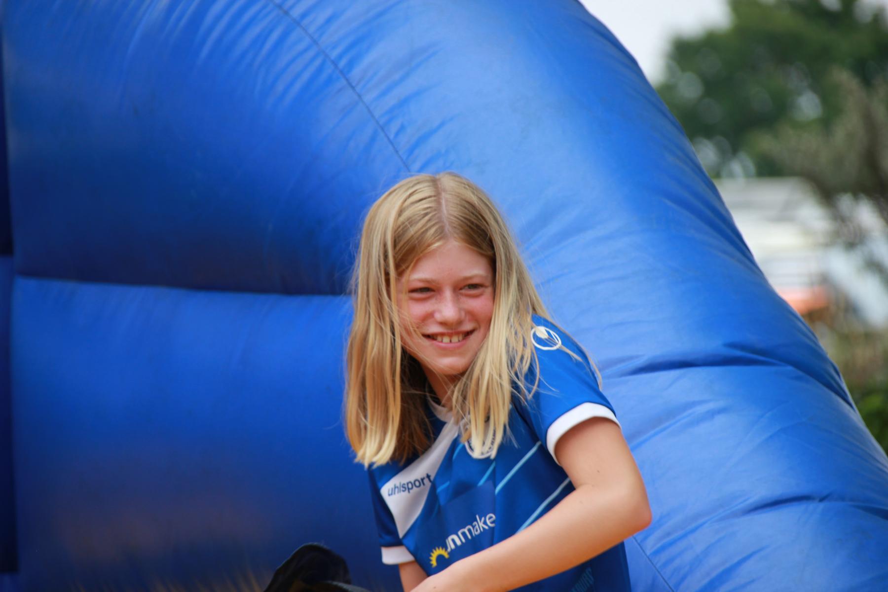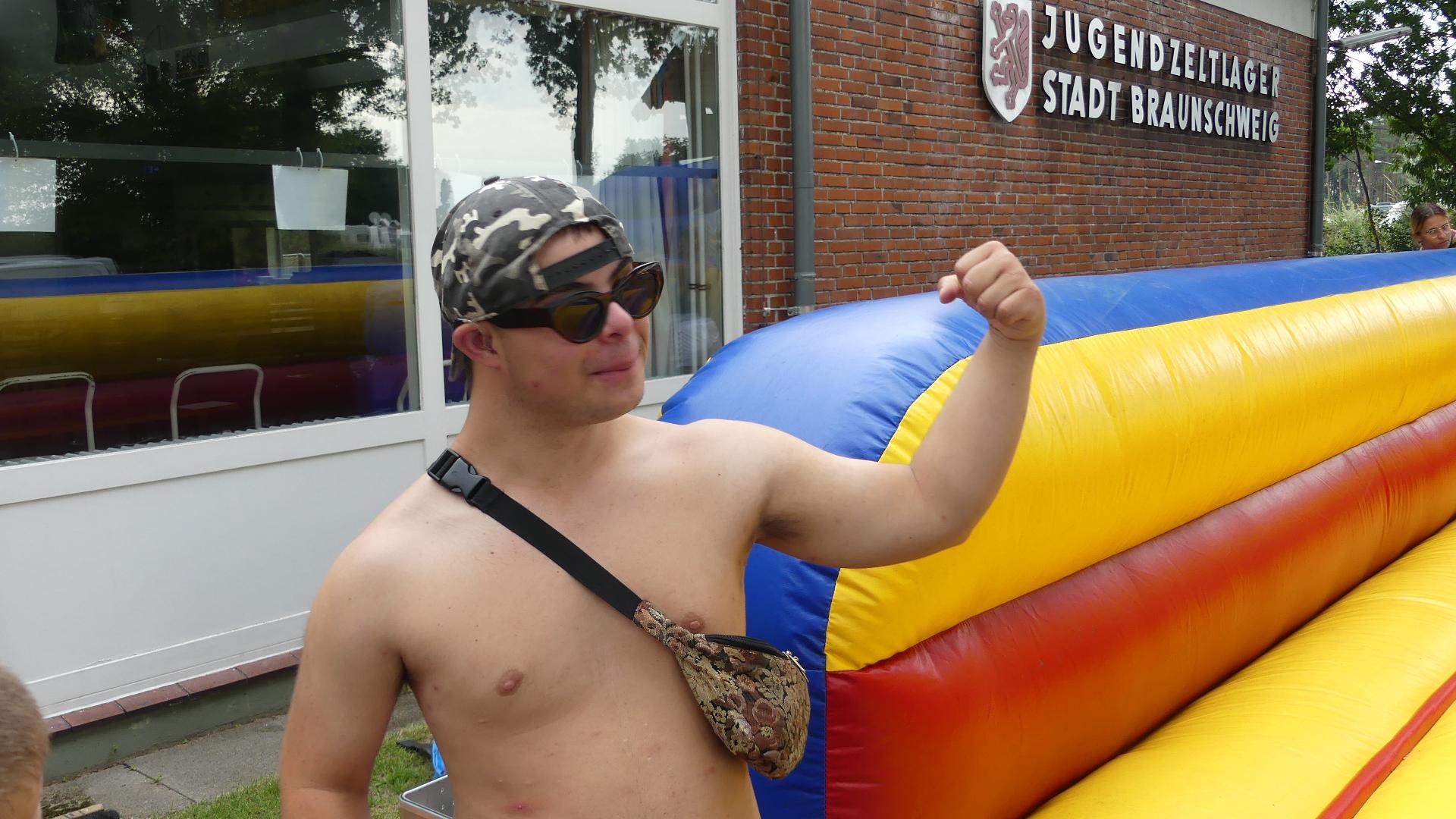 Beim Bungeerun ging es darum, ein Kissen so weit vorne zu platzieren wie möglich. Dabei wurden die Spieler am Bauch von einem Gummiseil zurückgehalten.