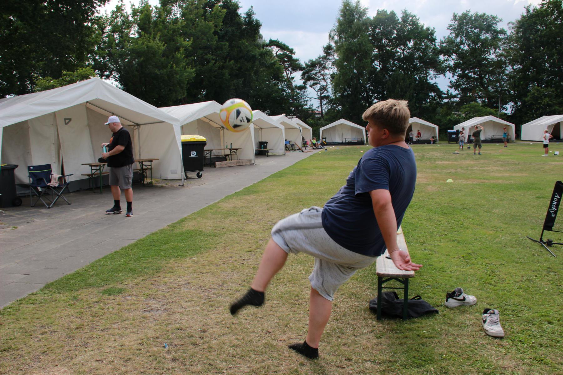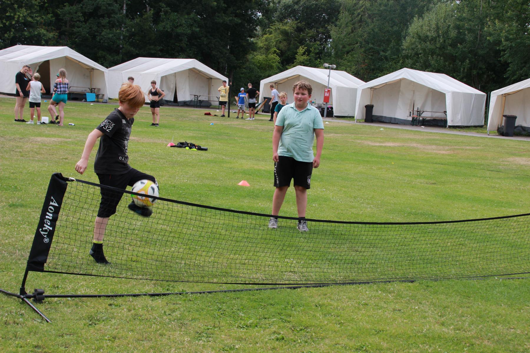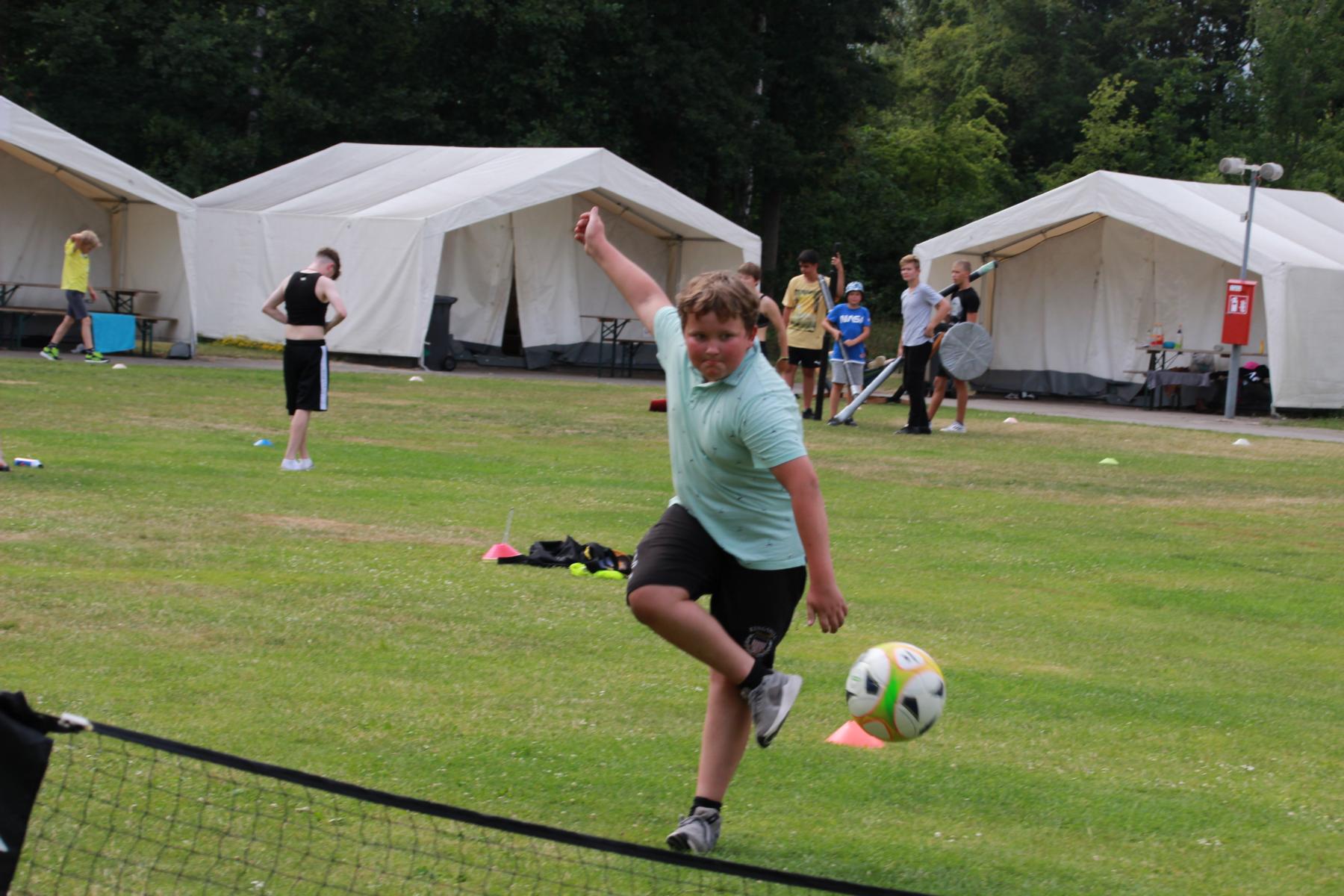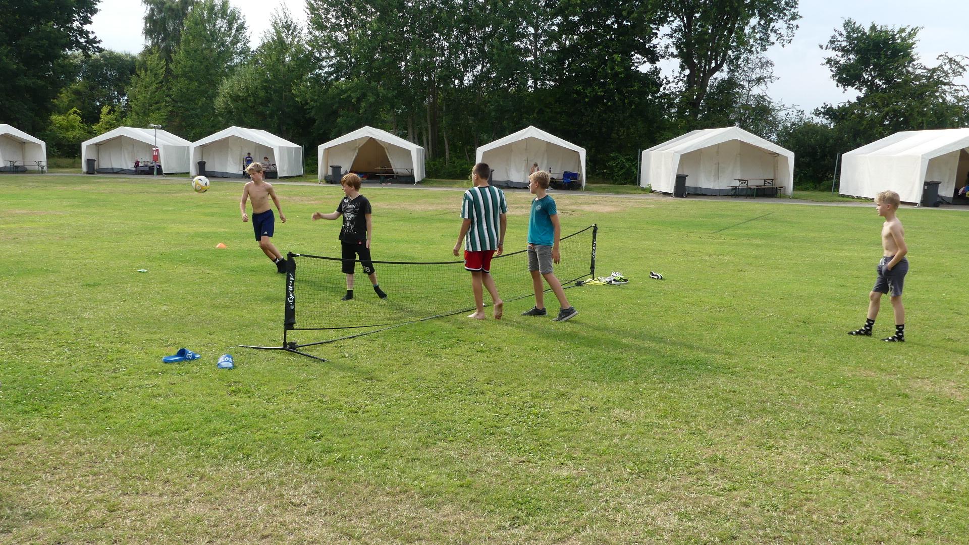 Mit dem Fuß einen Ball über das Netz zu bringen, ist die Aufgabe beim Fußballtennis gewesen.