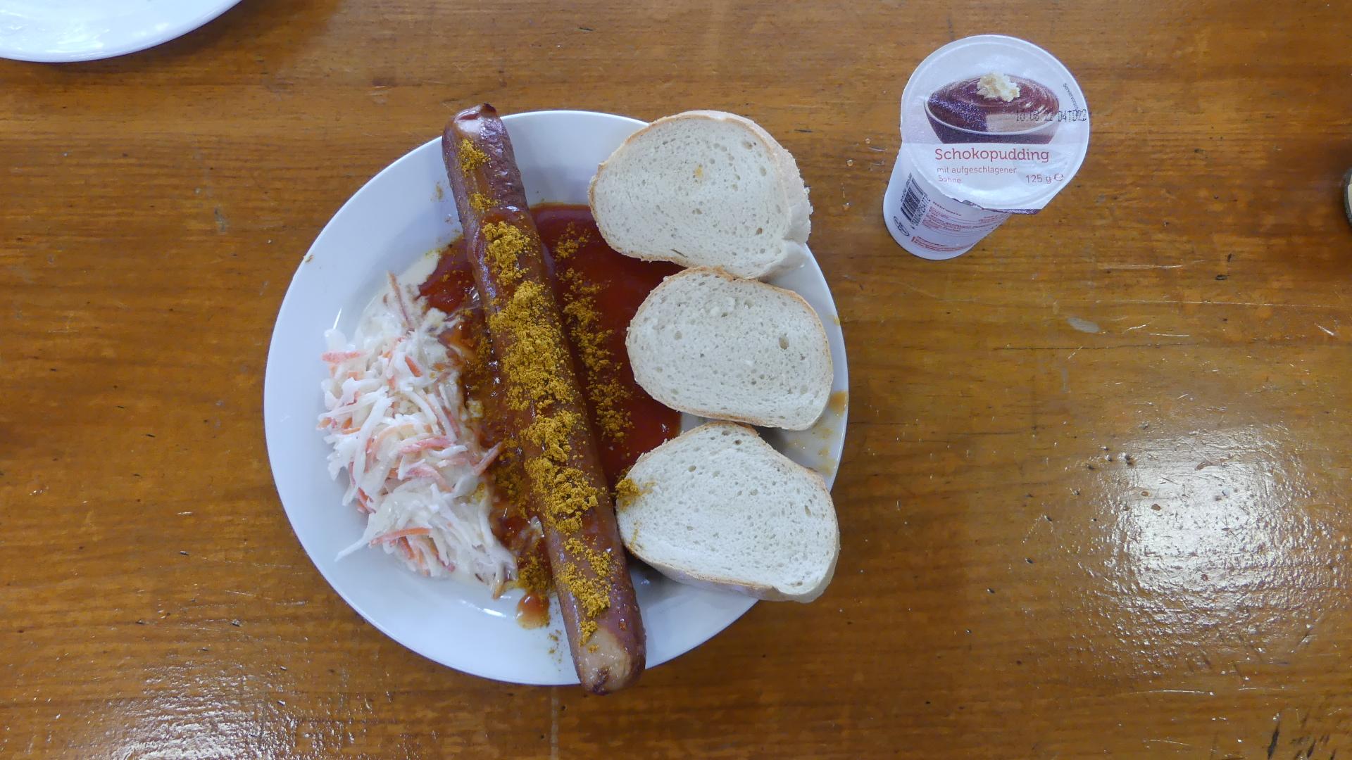 Um 12:30 erklang die Musik, die zum Mittagessen rief. Hier konnte man Currywurst mit Baguette und Salat bekommen. Zum Nachtisch gab es noch einen Pudding.