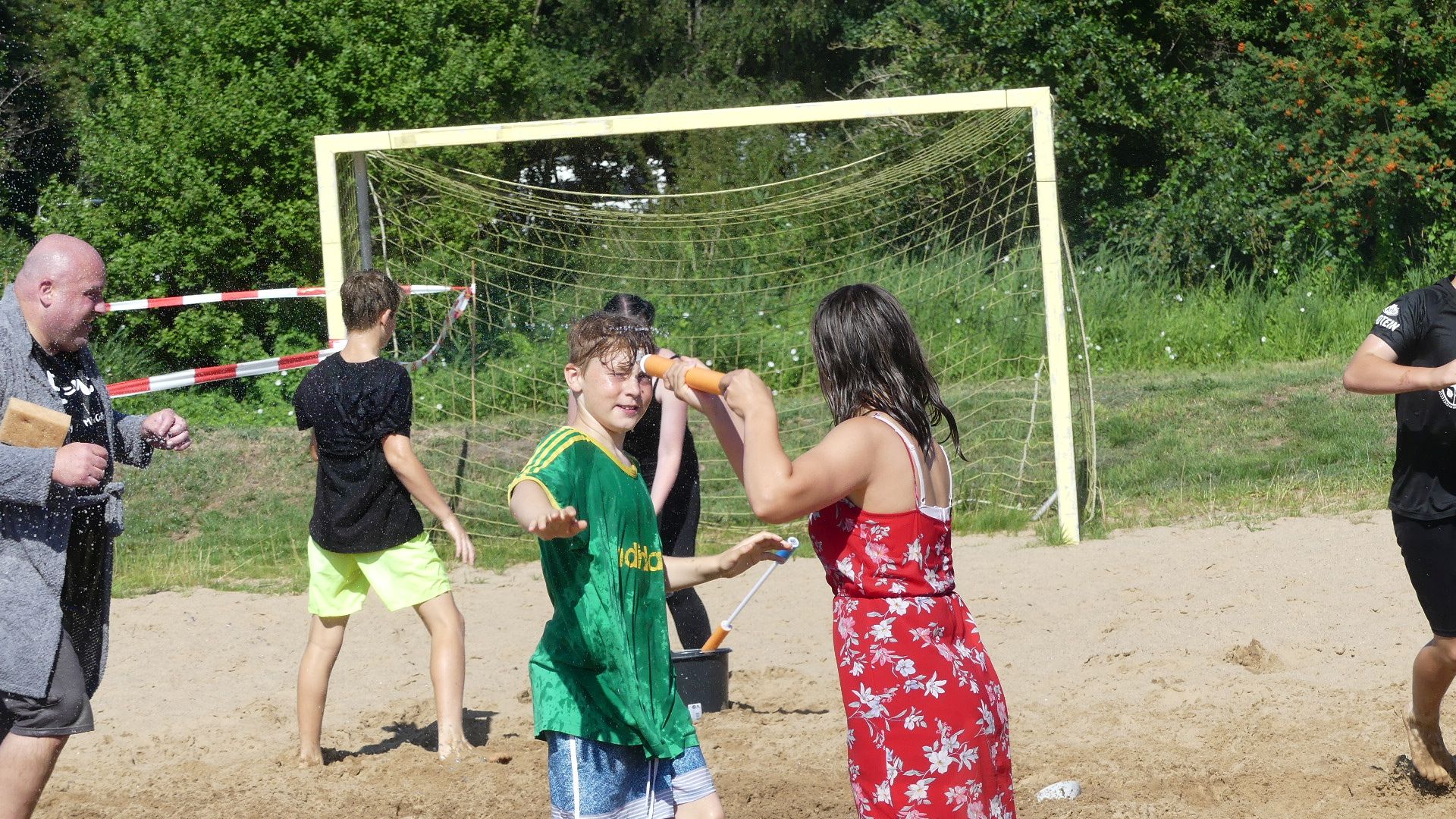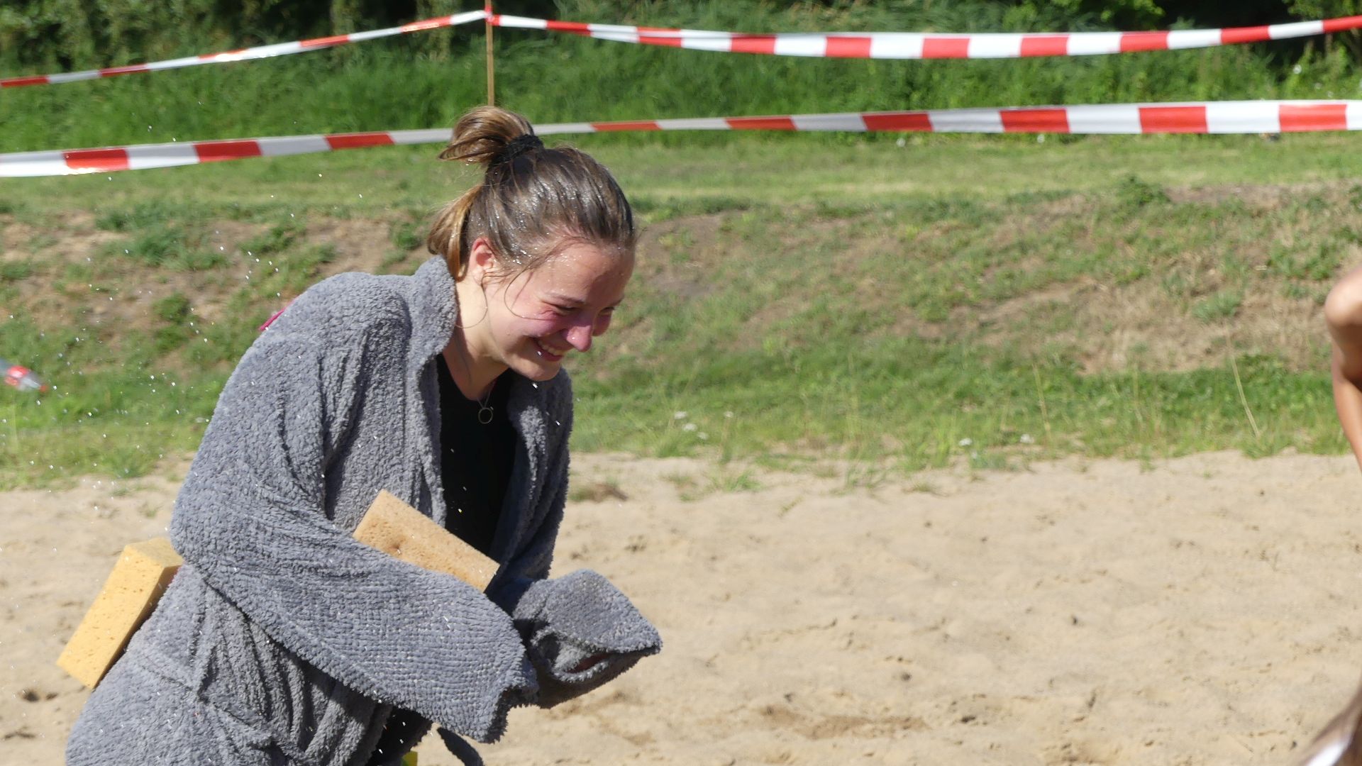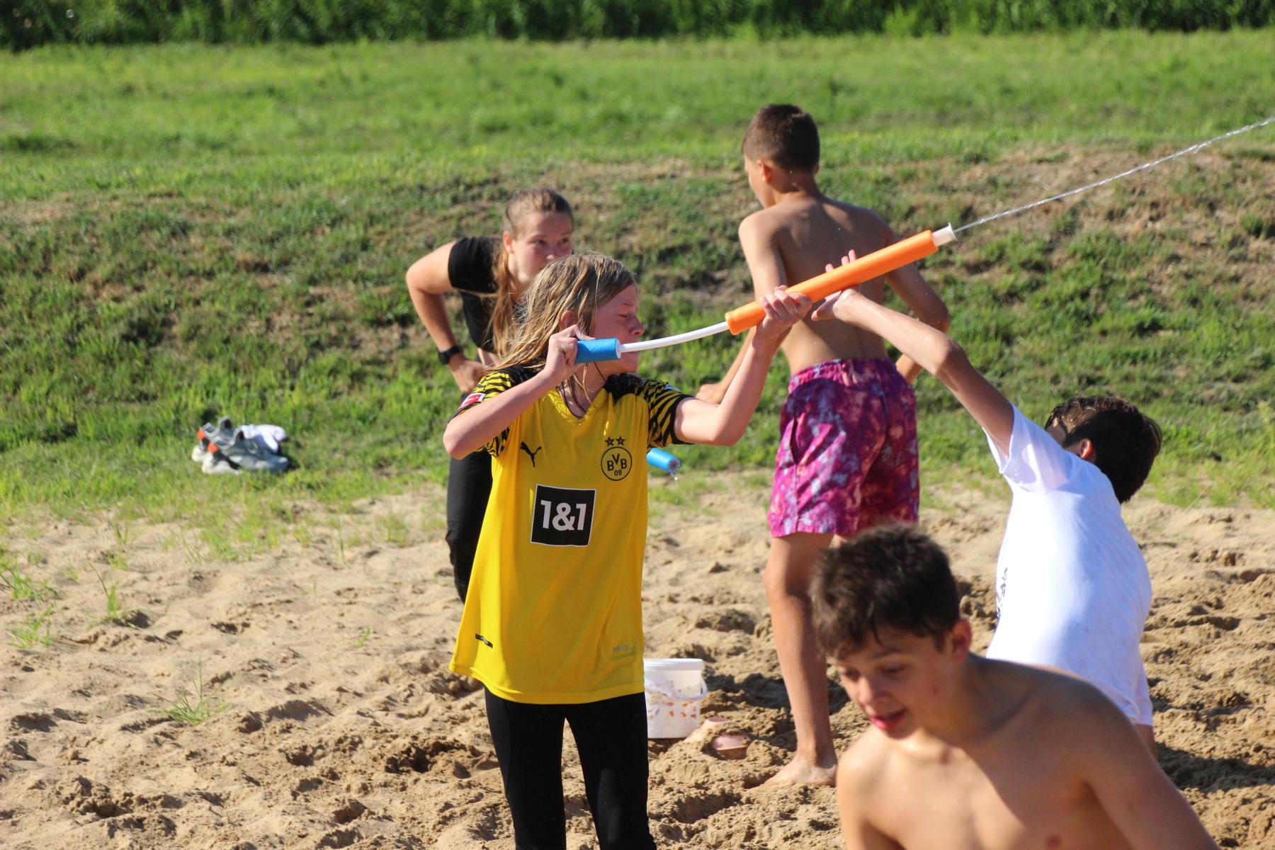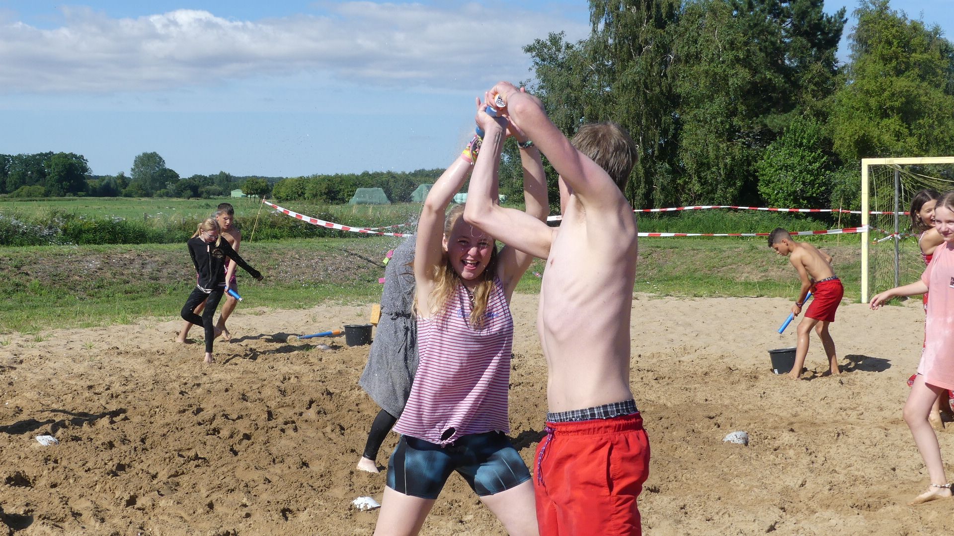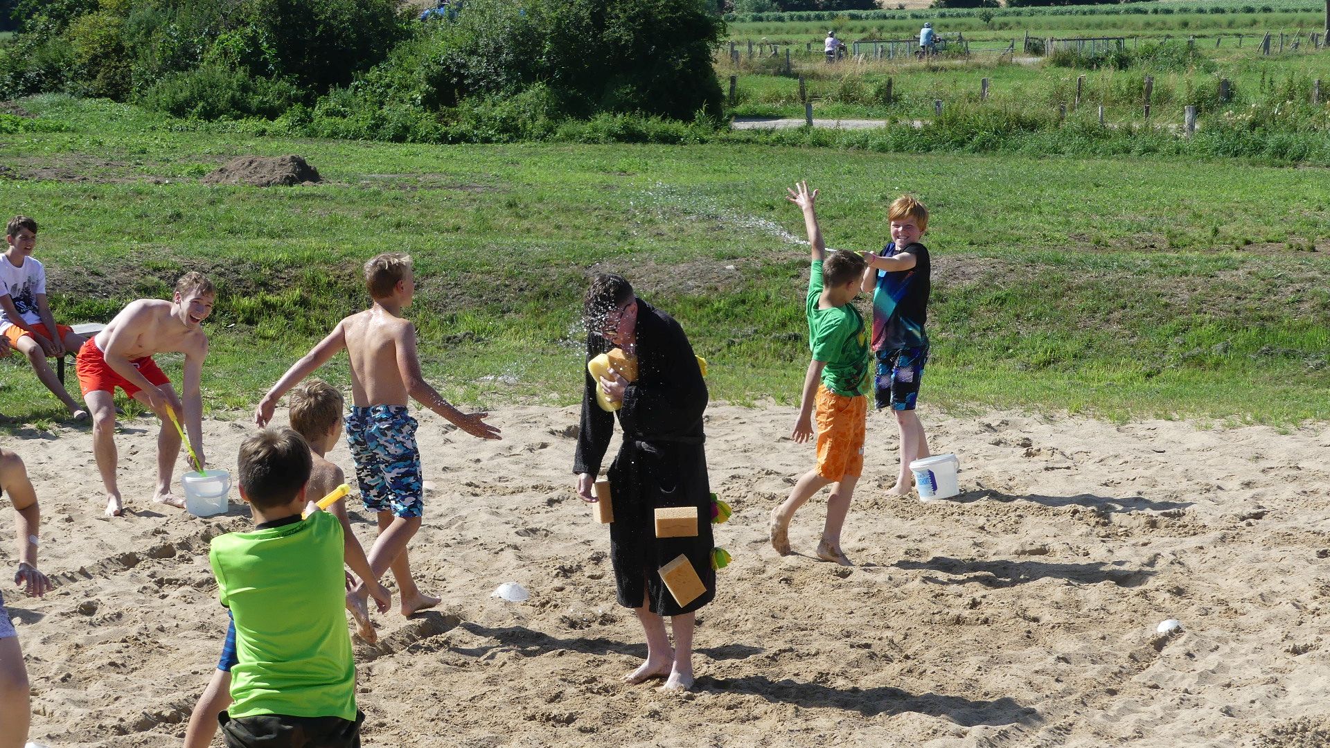 Der Nachmittag stand ganz im Zeichen der Beachparty. Diese fand dieses Jahr auf dem Beachhandballfeld statt. Hier wurde ein Spiel gespielt, bei dem es darum ging, die Betreuer eines anderen Zeltes möglichst nass zu machen. Das Zelt des Betreuers hatte die Aufgabe, ihren Betreuer möglichst gut vor dem Wasser zu schützen. Nach 90 Sekunden wurde der Bademantel des Betreuers ausgewrungen und die Rollen der Zelte wurden getauscht. Dies hat allen Kids sehr viel Spaß gemacht.