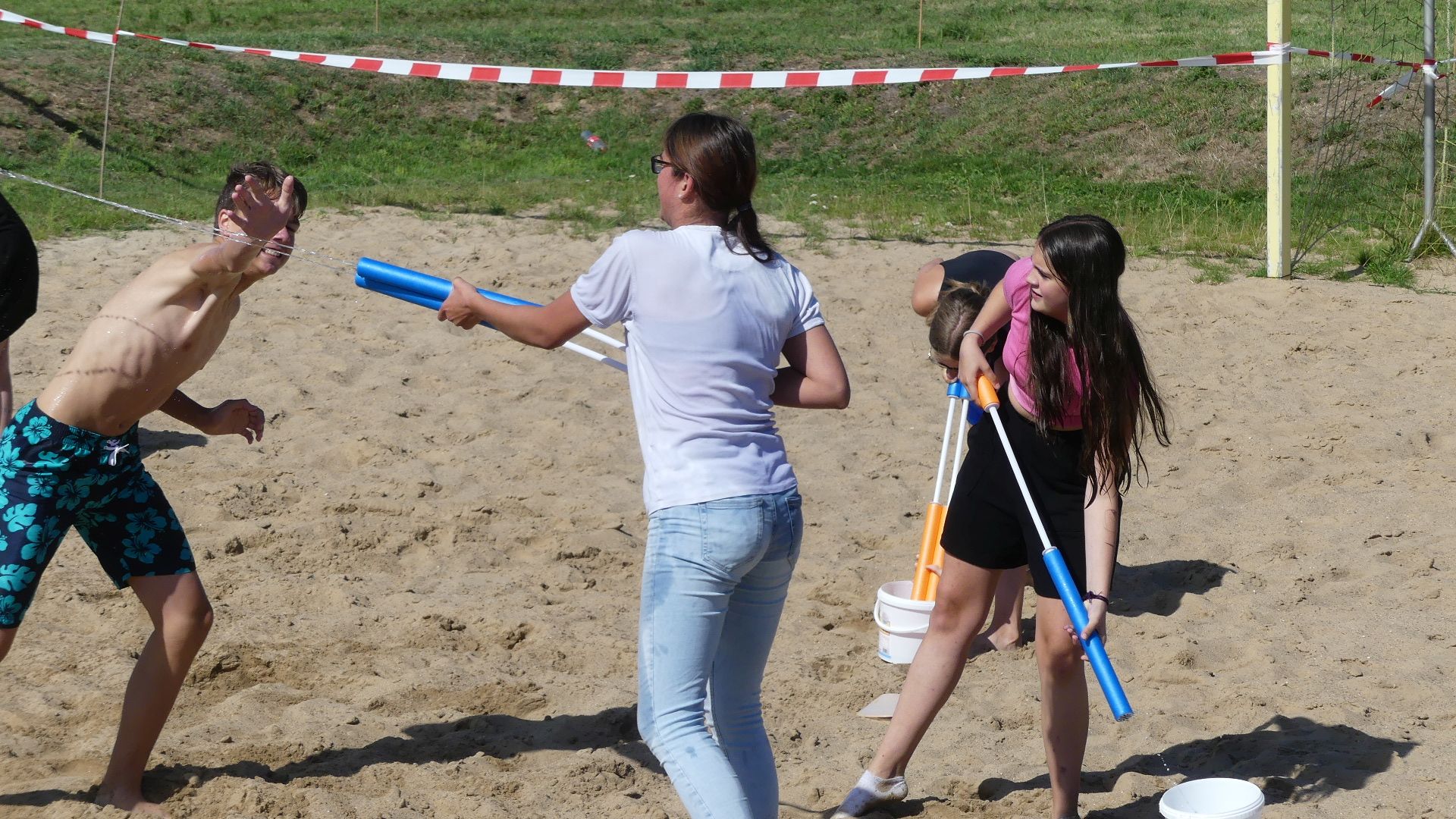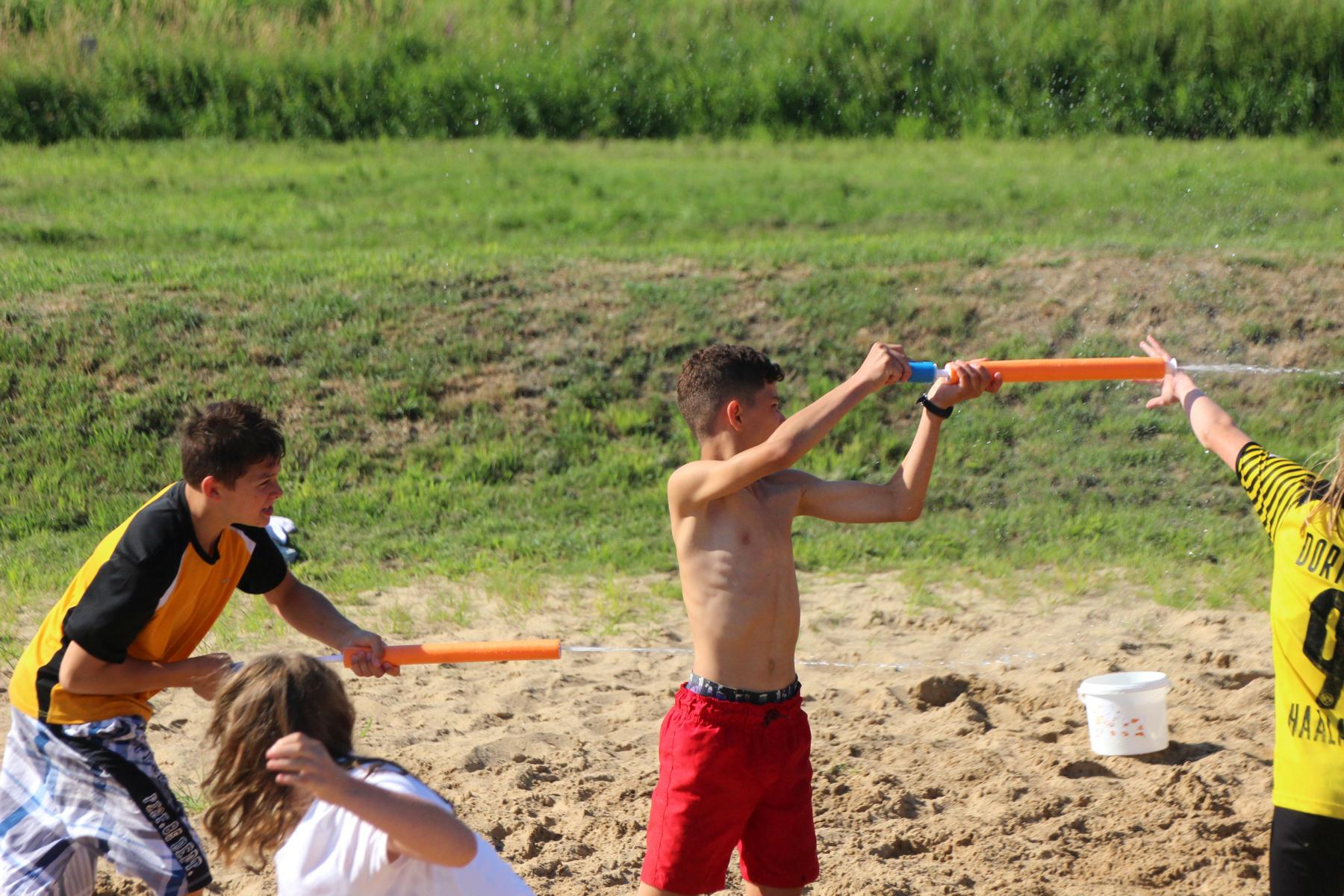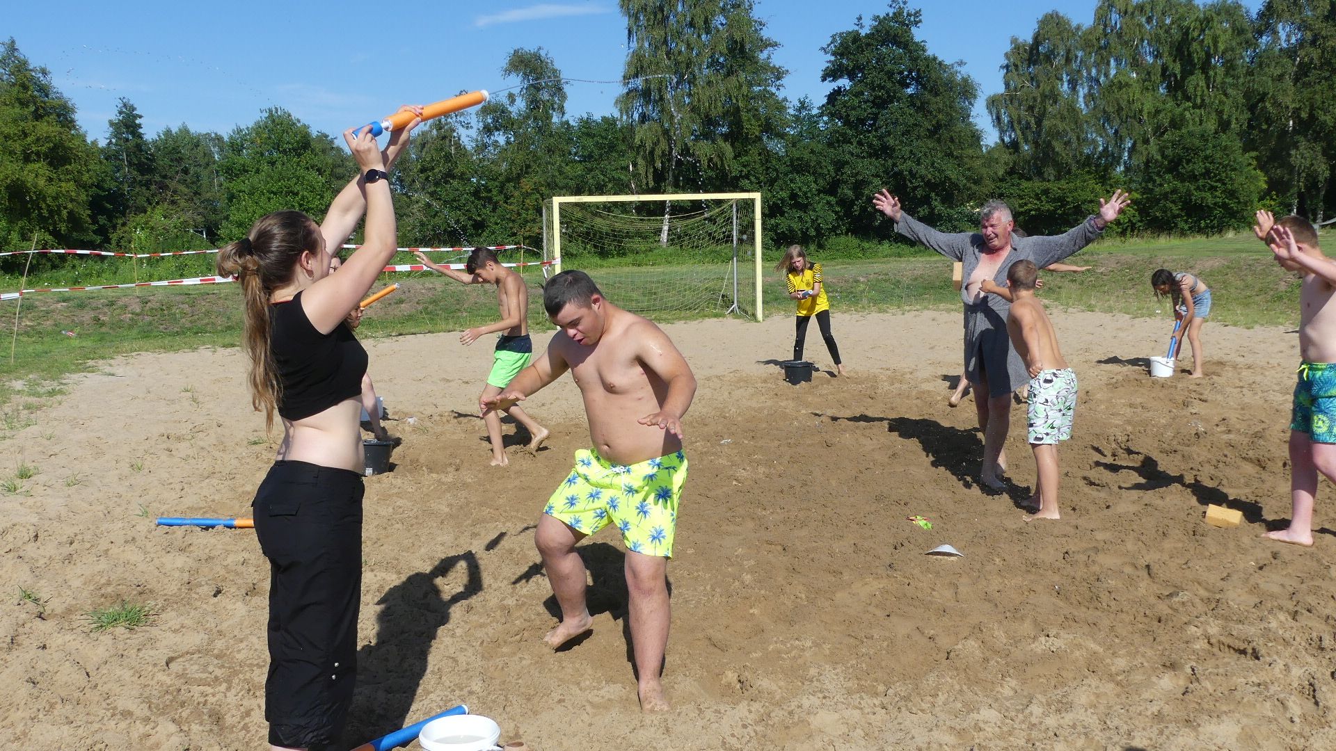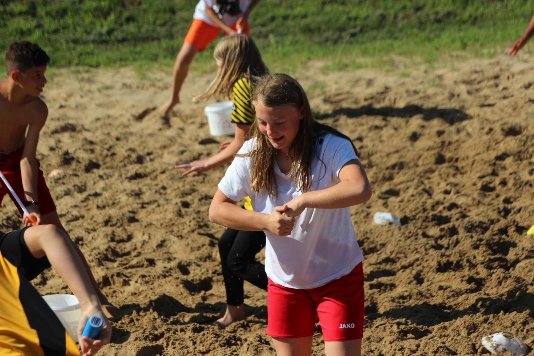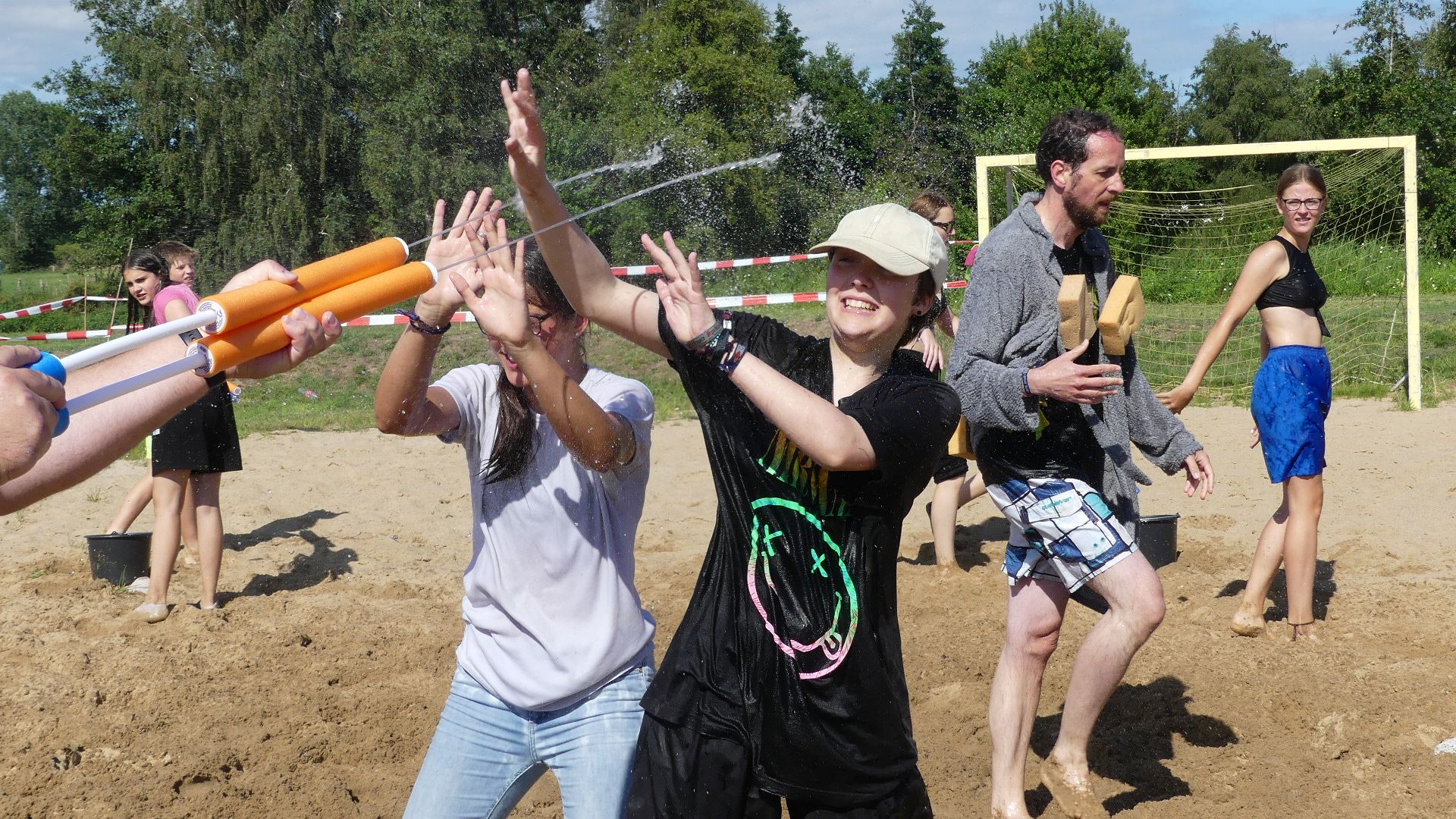 Der Nachmittag stand ganz im Zeichen der Beachparty. Diese fand dieses Jahr auf dem Beachhandballfeld statt. Hier wurde ein Spiel gespielt, bei dem es darum ging, die Betreuer eines anderen Zeltes möglichst nass zu machen. Das Zelt des Betreuers hatte die Aufgabe, ihren Betreuer möglichst gut vor dem Wasser zu schützen. Nach 90 Sekunden wurde der Bademantel des Betreuers ausgewrungen und die Rollen der Zelte wurden getauscht. Dies hat allen Kids sehr viel Spaß gemacht.