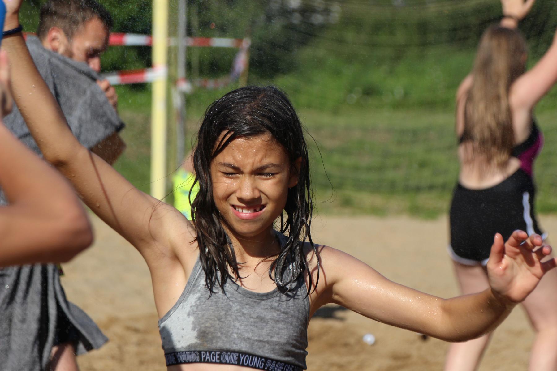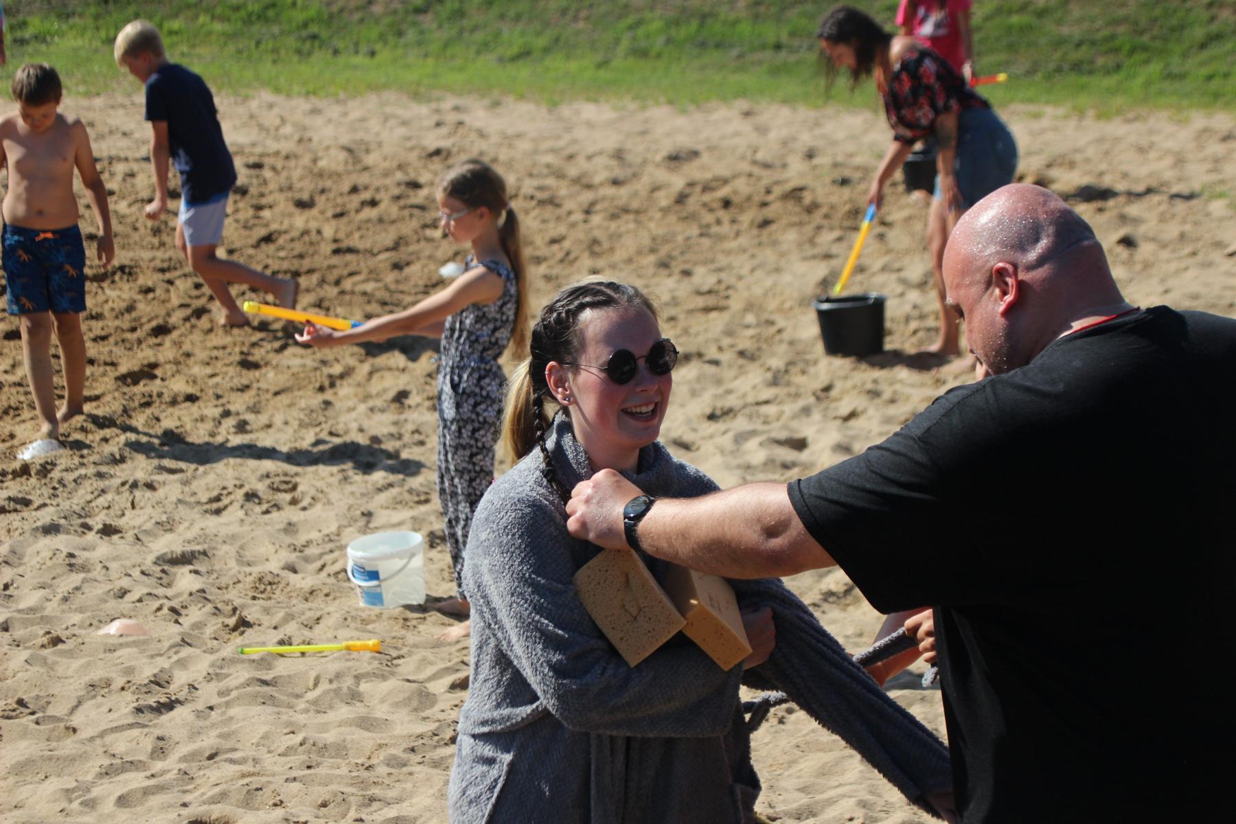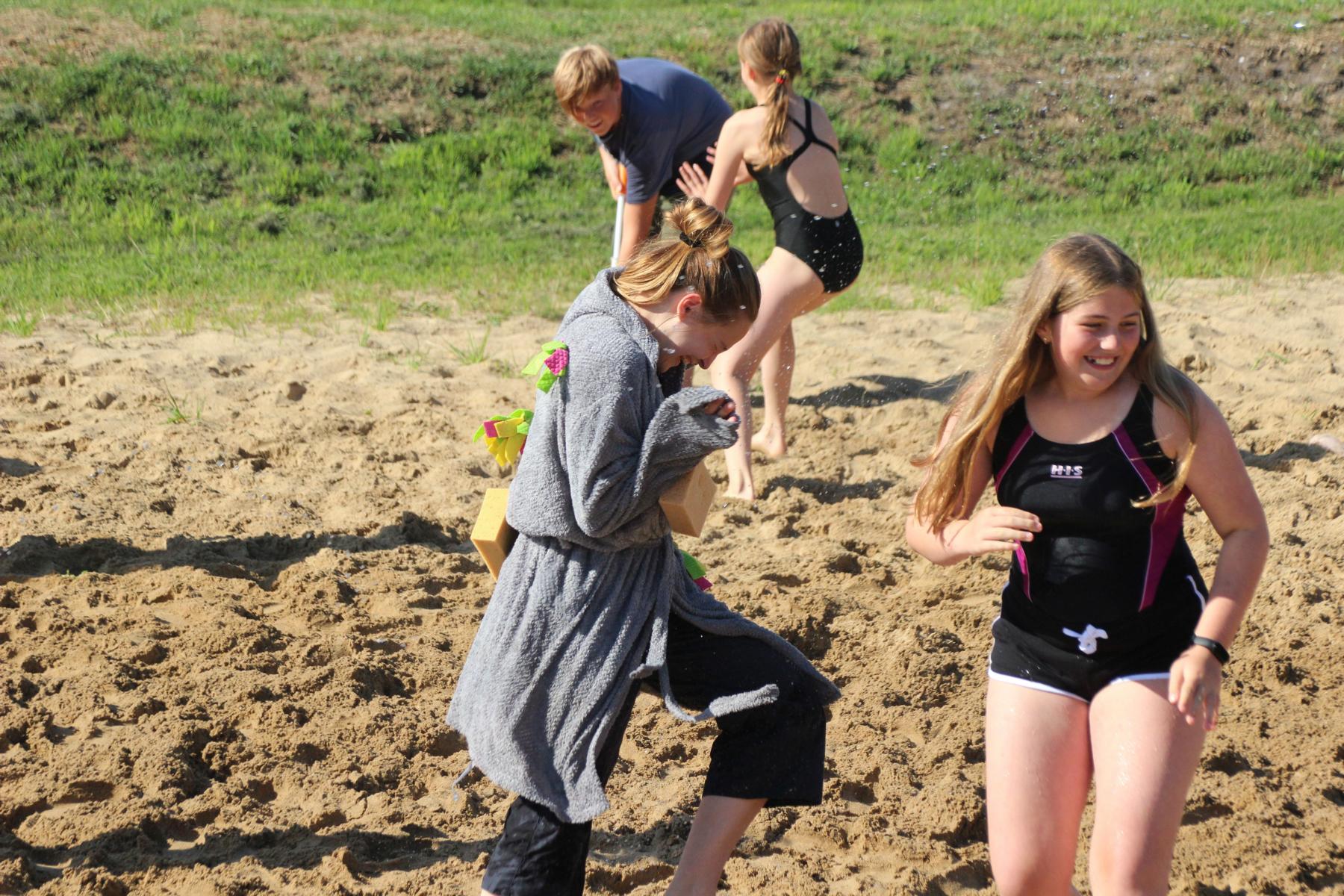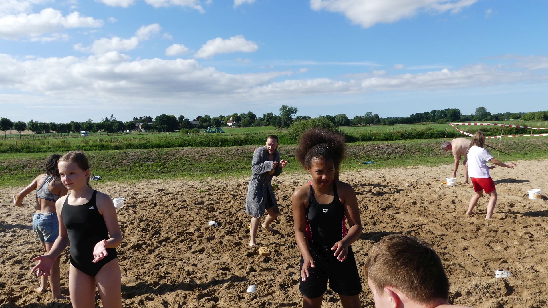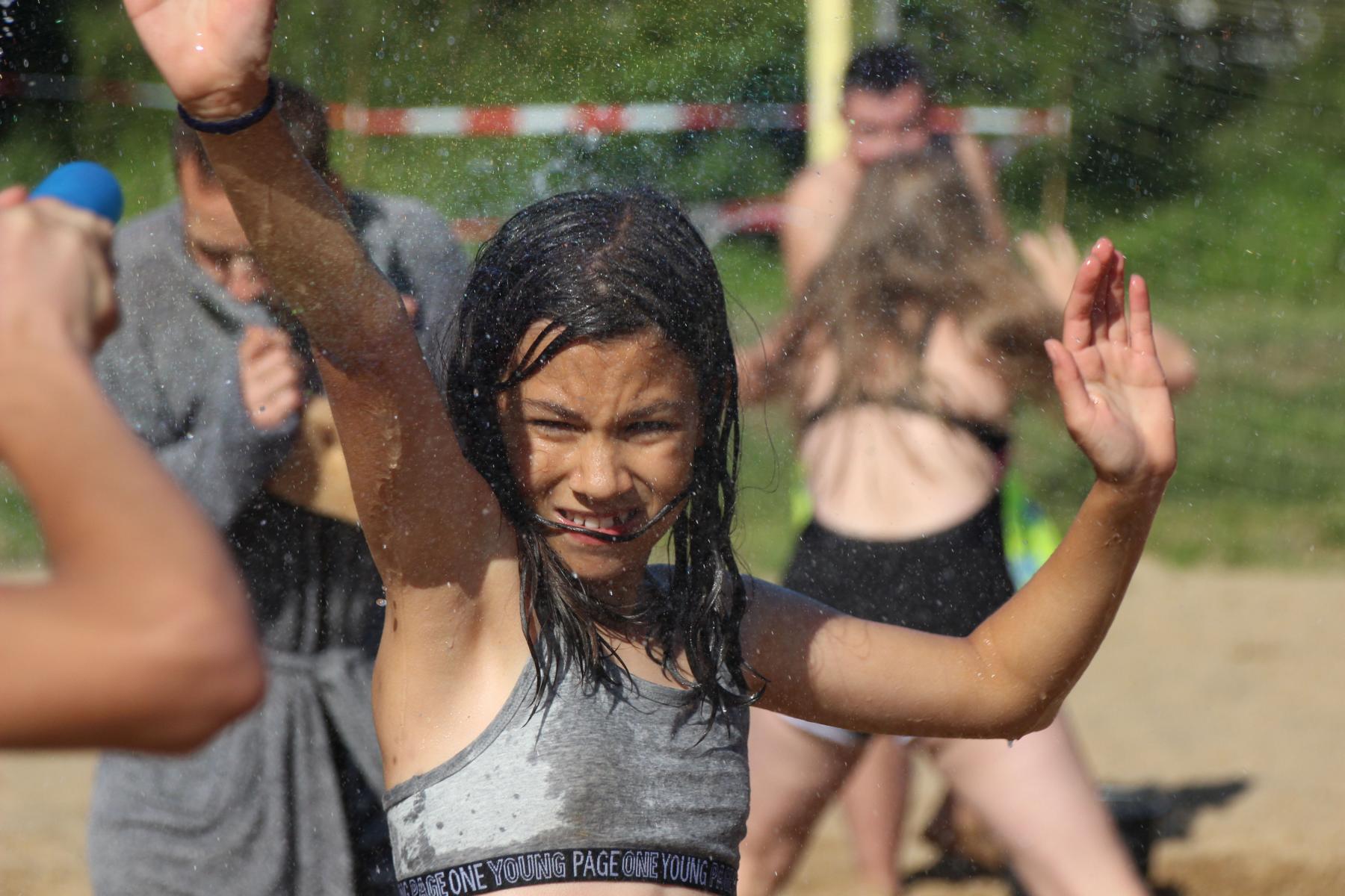 Der Nachmittag stand ganz im Zeichen der Beachparty. Diese fand dieses Jahr auf dem Beachhandballfeld statt. Hier wurde ein Spiel gespielt, bei dem es darum ging, die Betreuer eines anderen Zeltes möglichst nass zu machen. Das Zelt des Betreuers hatte die Aufgabe, ihren Betreuer möglichst gut vor dem Wasser zu schützen. Nach 90 Sekunden wurde der Bademantel des Betreuers ausgewrungen und die Rollen der Zelte wurden getauscht. Dies hat allen Kids sehr viel Spaß gemacht.