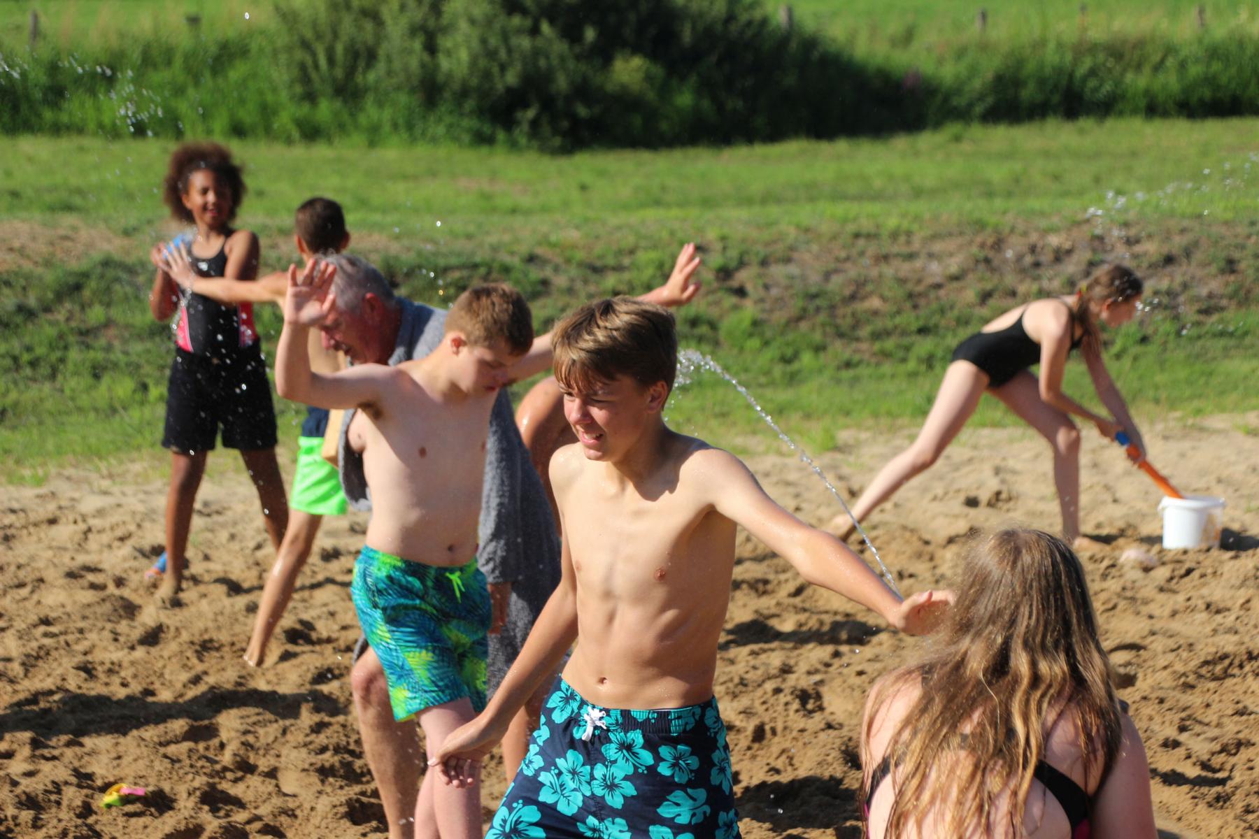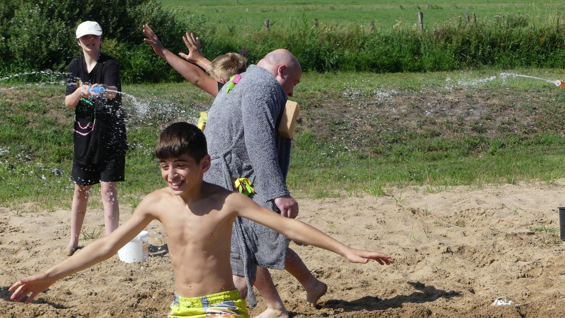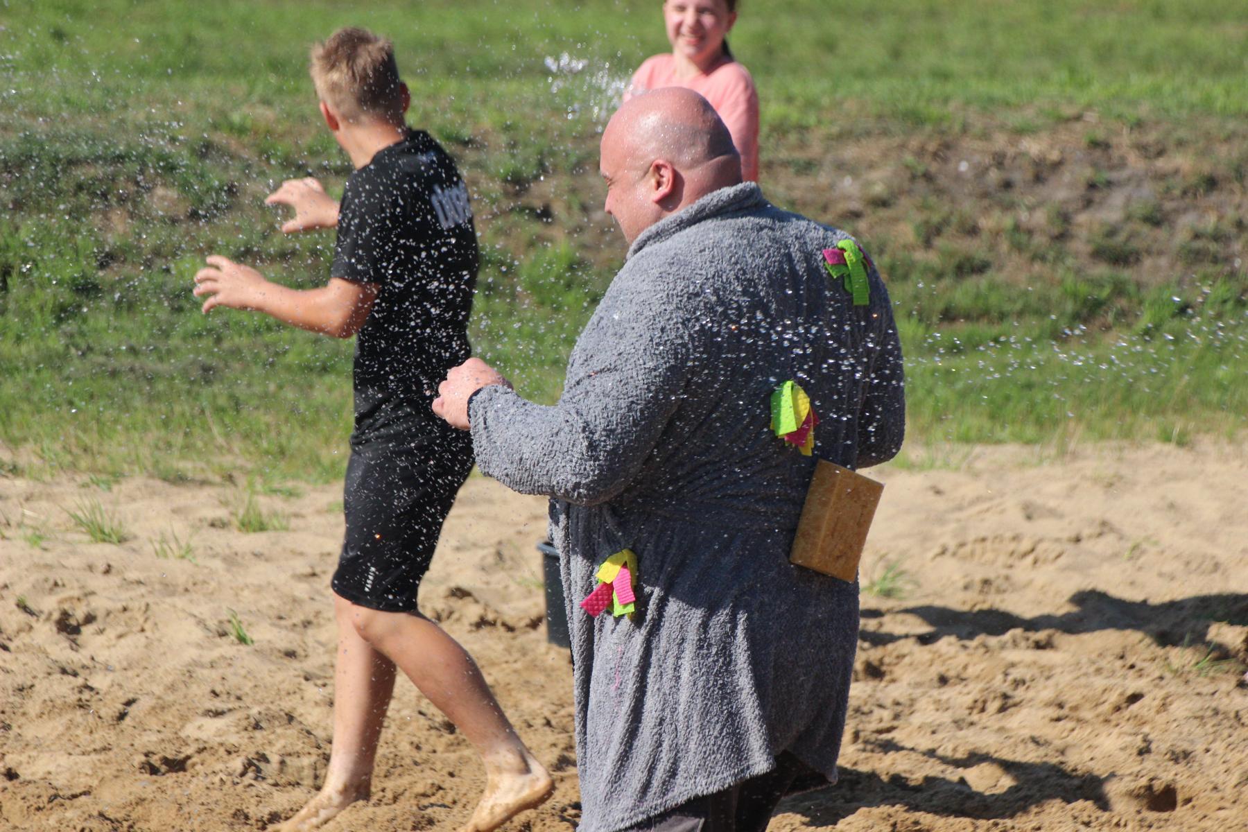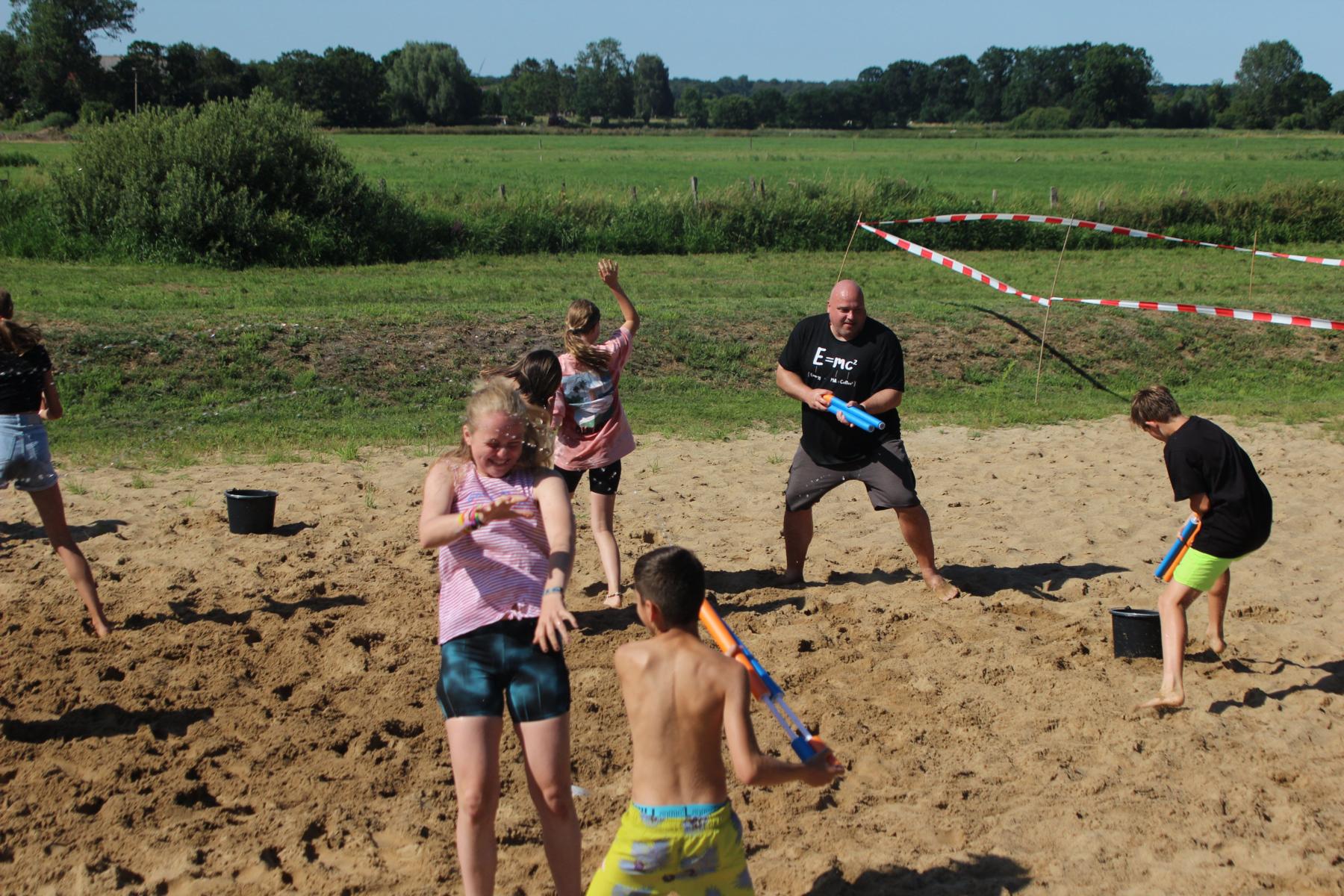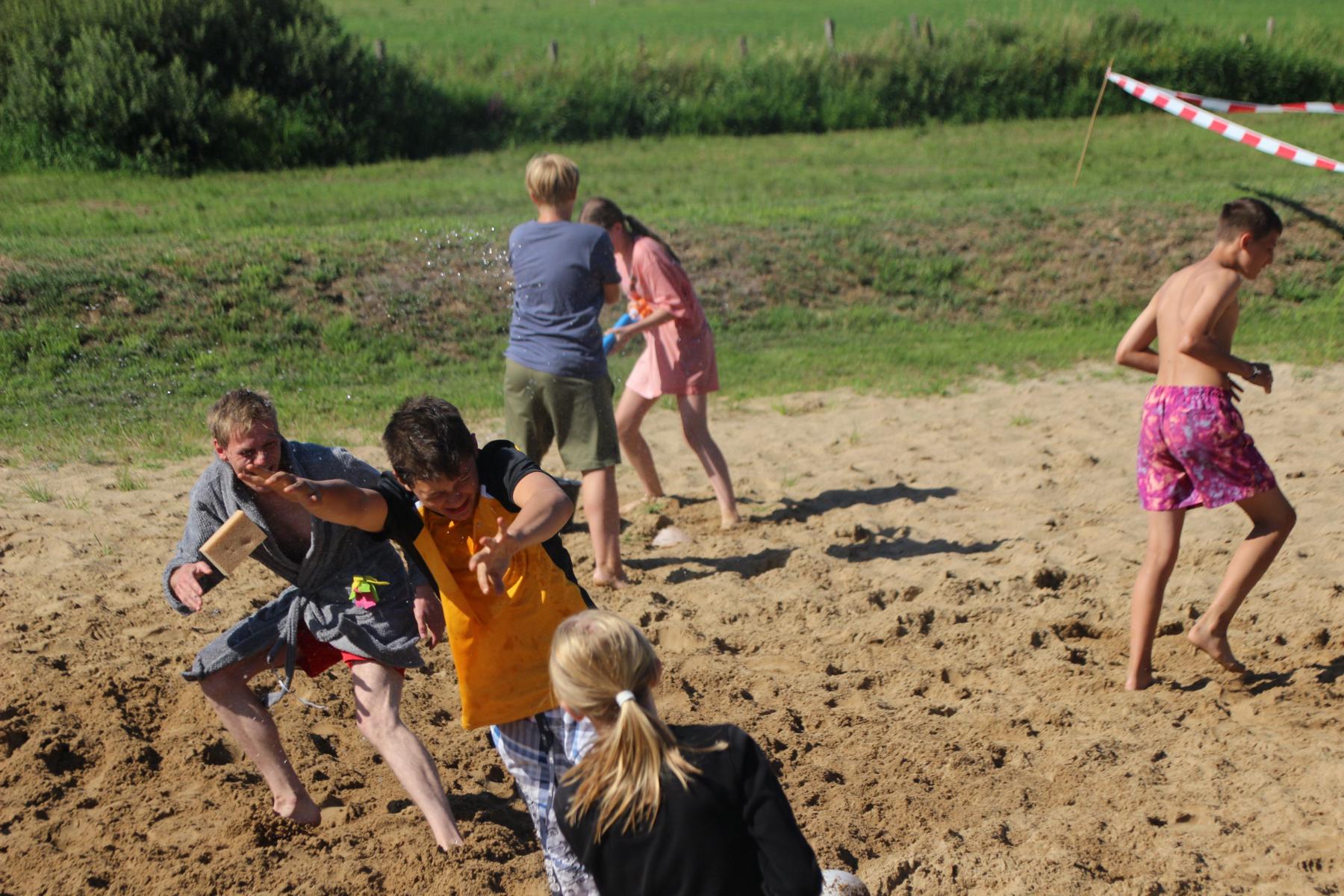 Der Nachmittag stand ganz im Zeichen der Beachparty. Diese fand dieses Jahr auf dem Beachhandballfeld statt. Hier wurde ein Spiel gespielt, bei dem es darum ging, die Betreuer eines anderen Zeltes möglichst nass zu machen. Das Zelt des Betreuers hatte die Aufgabe, ihren Betreuer möglichst gut vor dem Wasser zu schützen. Nach 90 Sekunden wurde der Bademantel des Betreuers ausgewrungen und die Rollen der Zelte wurden getauscht. Dies hat allen Kids sehr viel Spaß gemacht.