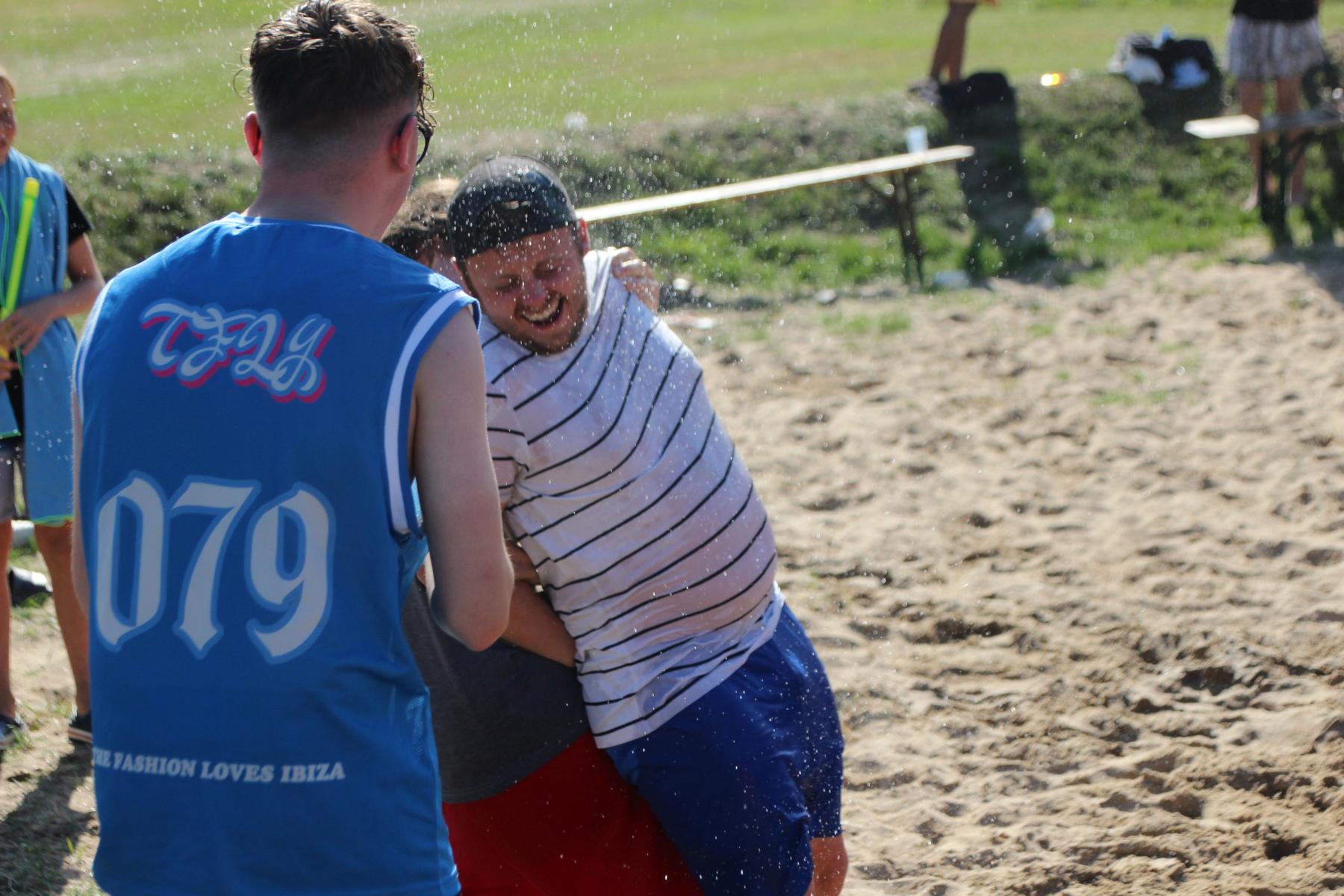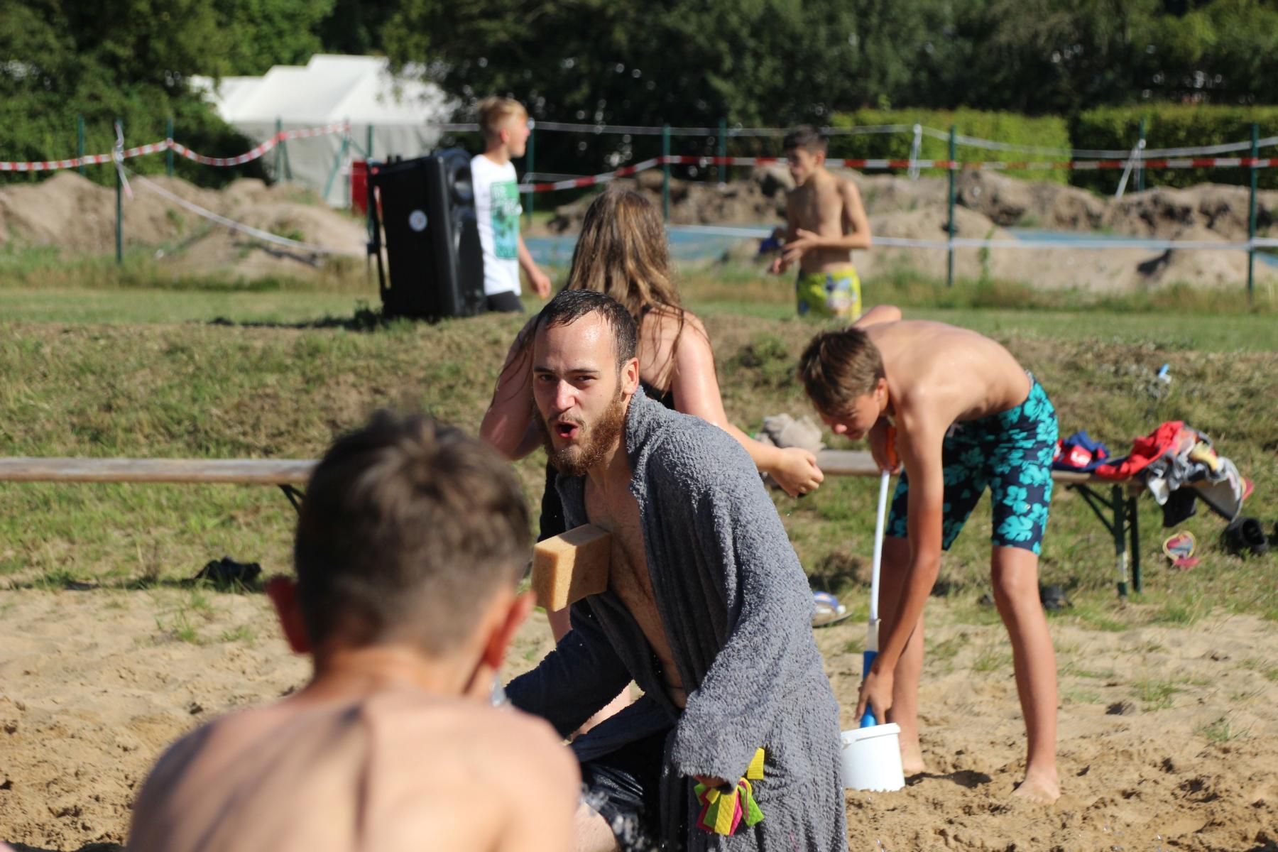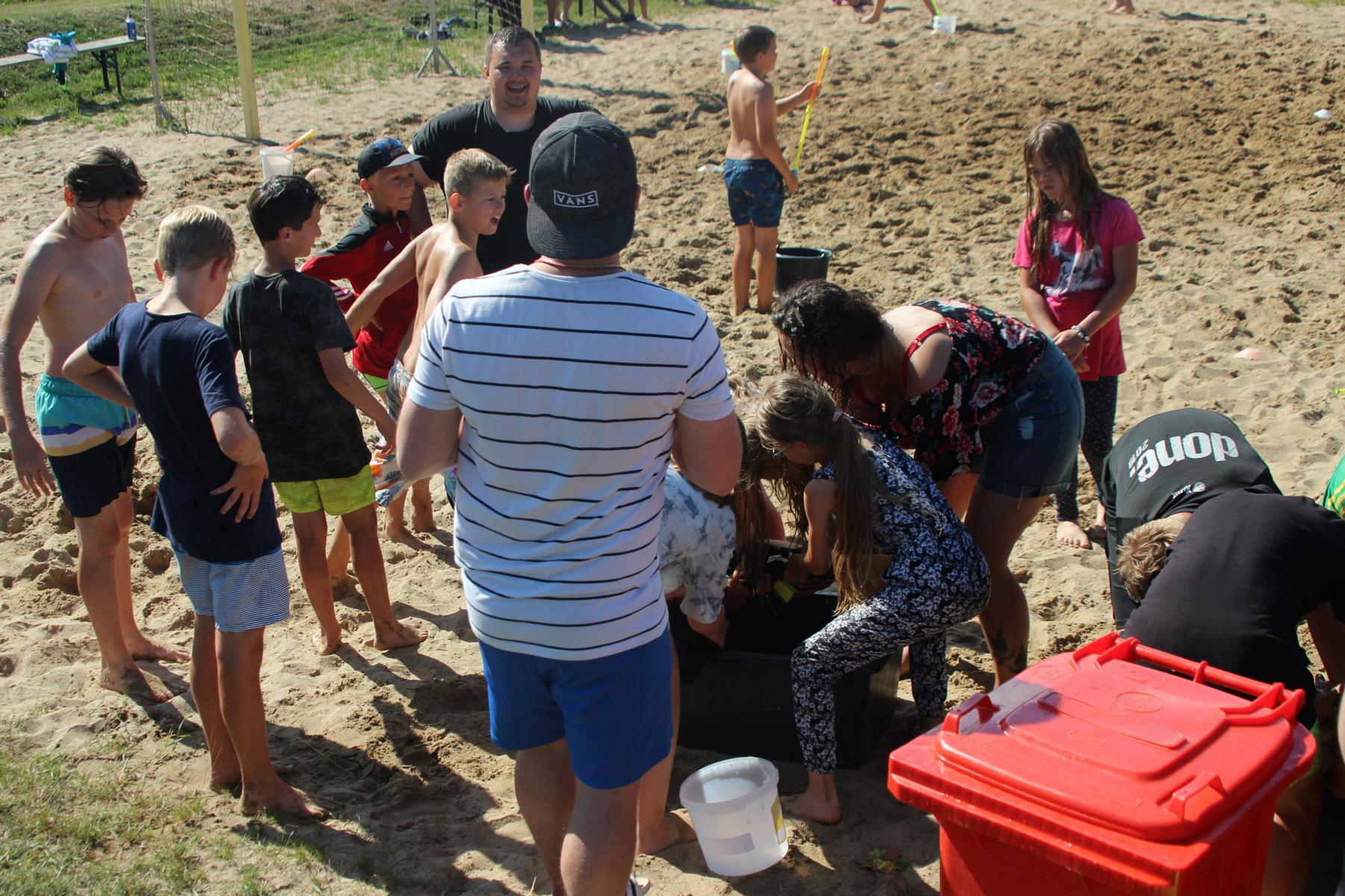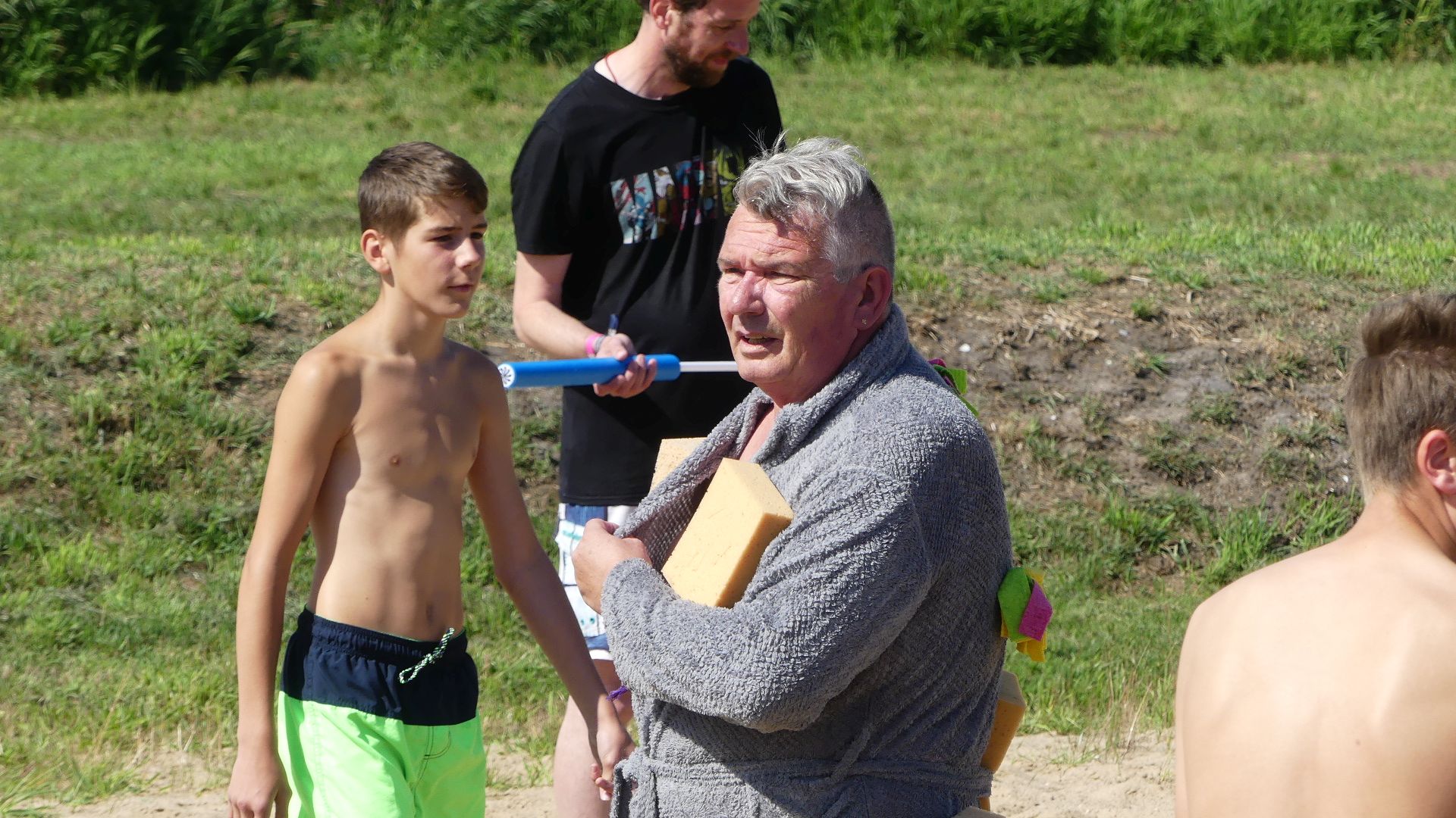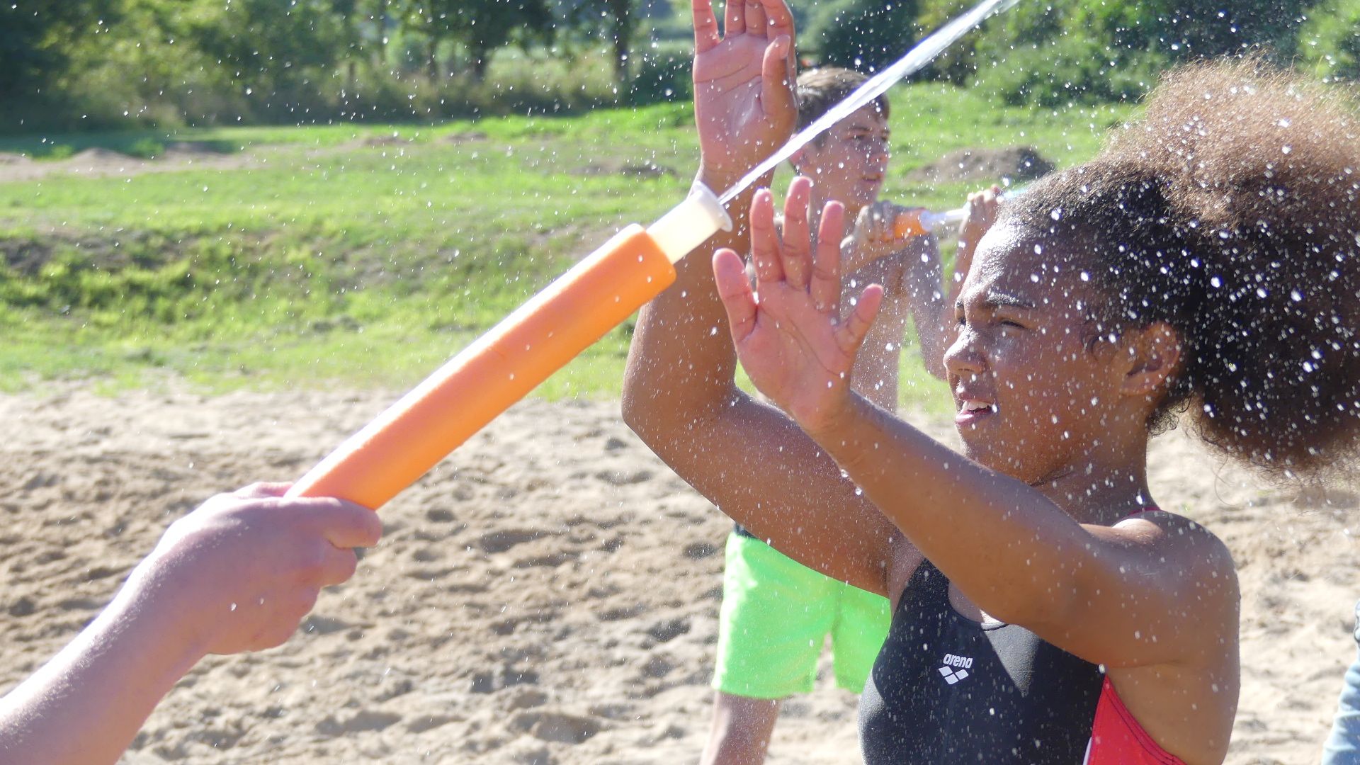 Der Nachmittag stand ganz im Zeichen der Beachparty. Diese fand dieses Jahr auf dem Beachhandballfeld statt. Hier wurde ein Spiel gespielt, bei dem es darum ging, die Betreuer eines anderen Zeltes möglichst nass zu machen. Das Zelt des Betreuers hatte die Aufgabe, ihren Betreuer möglichst gut vor dem Wasser zu schützen. Nach 90 Sekunden wurde der Bademantel des Betreuers ausgewrungen und die Rollen der Zelte wurden getauscht. Dies hat allen Kids sehr viel Spaß gemacht.