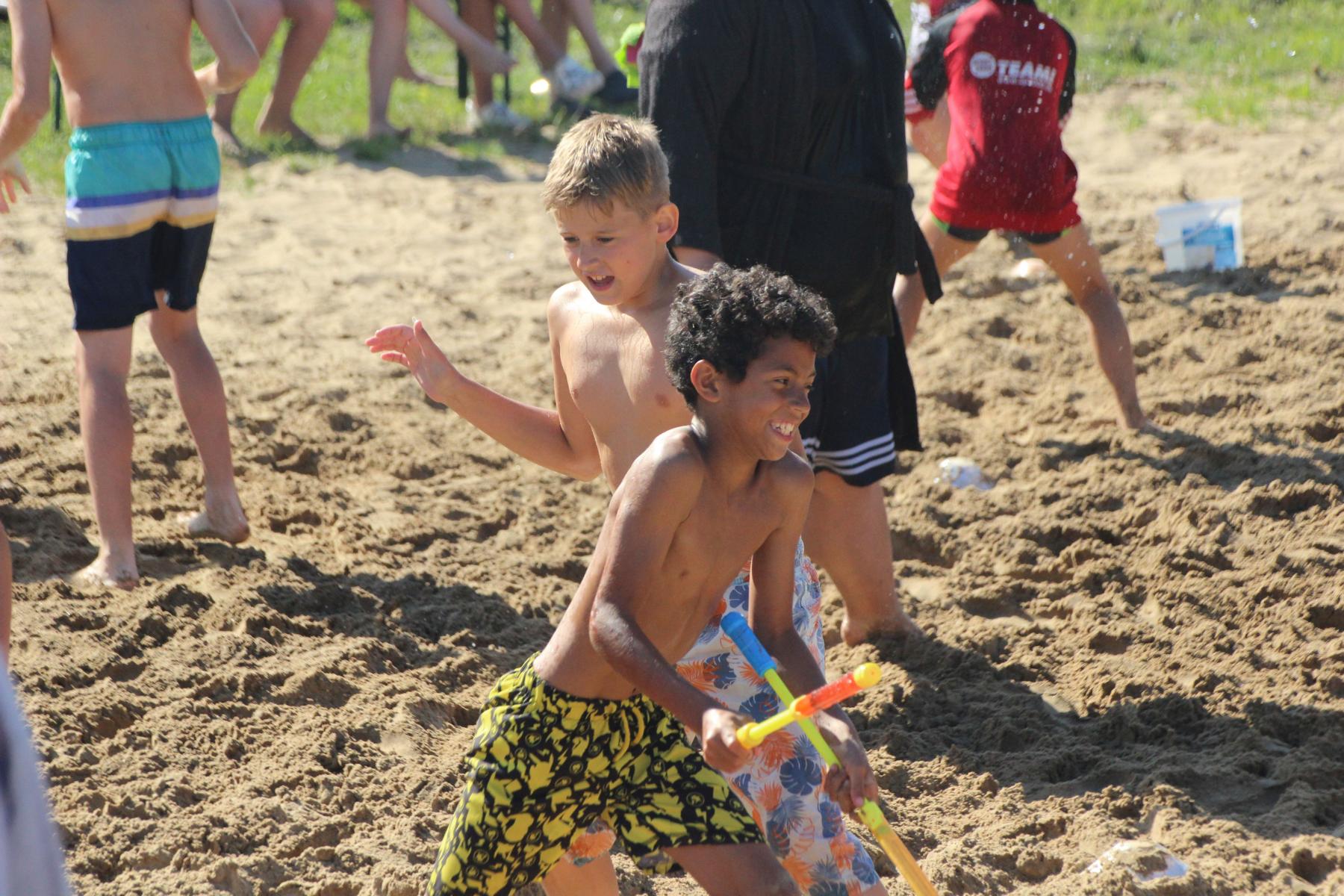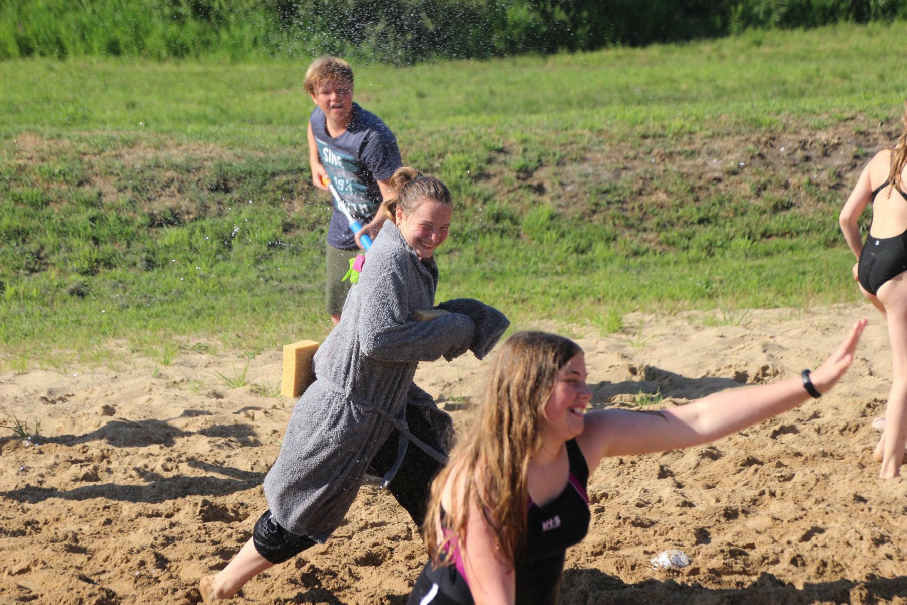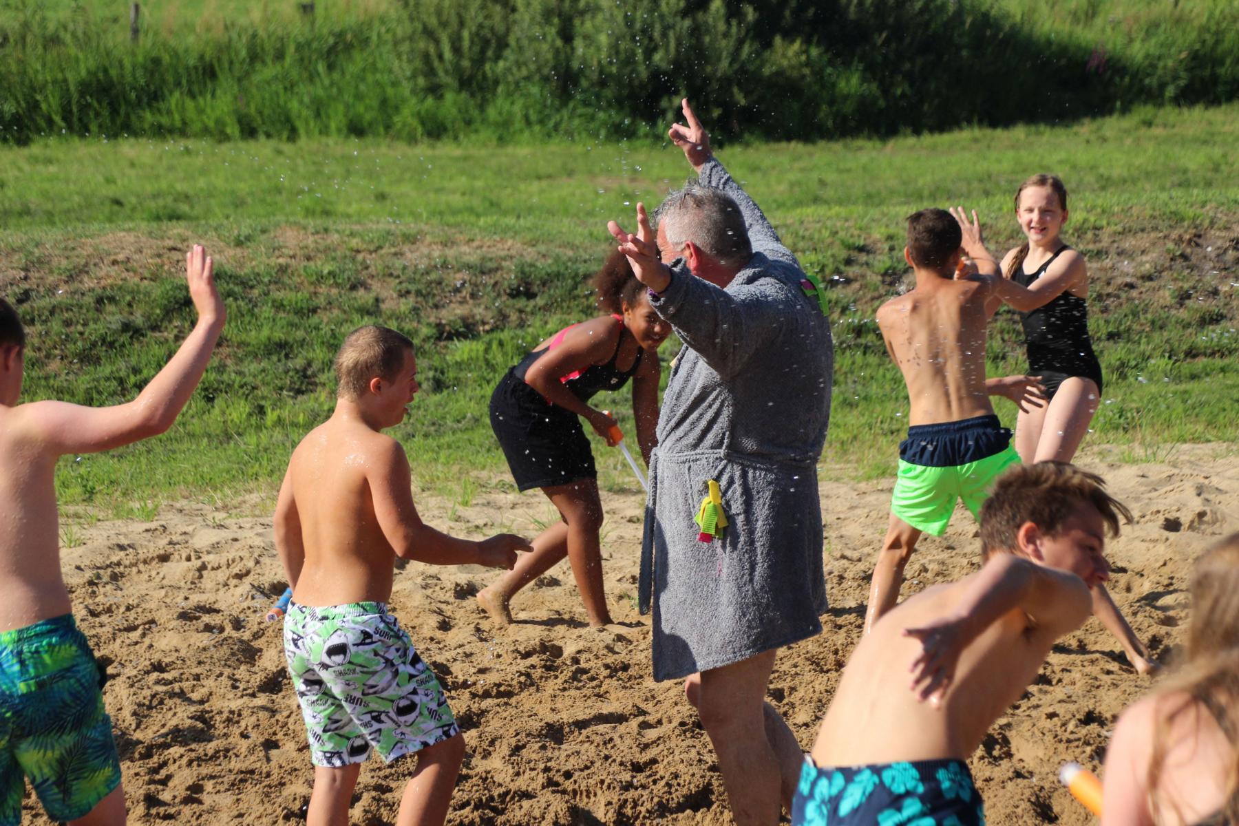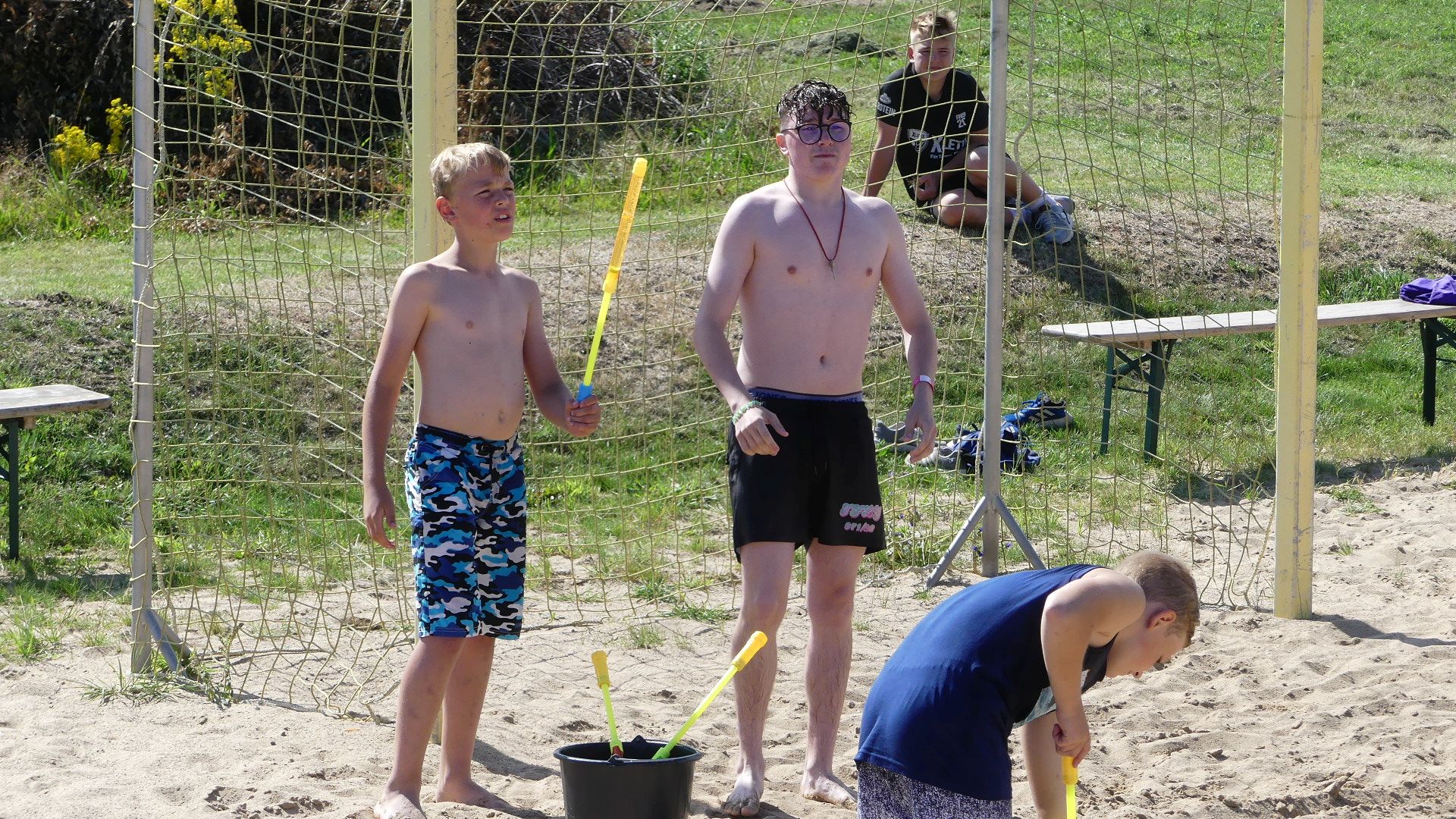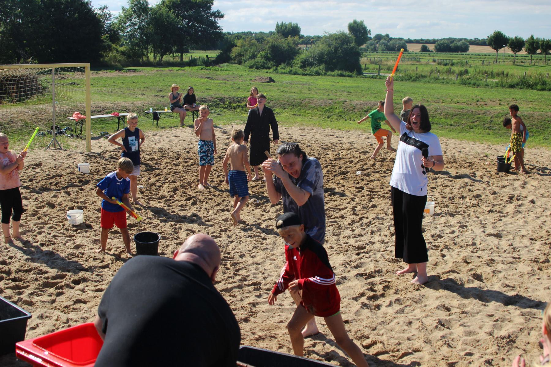 Der Nachmittag stand ganz im Zeichen der Beachparty. Diese fand dieses Jahr auf dem Beachhandballfeld statt. Hier wurde ein Spiel gespielt, bei dem es darum ging, die Betreuer eines anderen Zeltes möglichst nass zu machen. Das Zelt des Betreuers hatte die Aufgabe, ihren Betreuer möglichst gut vor dem Wasser zu schützen. Nach 90 Sekunden wurde der Bademantel des Betreuers ausgewrungen und die Rollen der Zelte wurden getauscht. Dies hat allen Kids sehr viel Spaß gemacht.