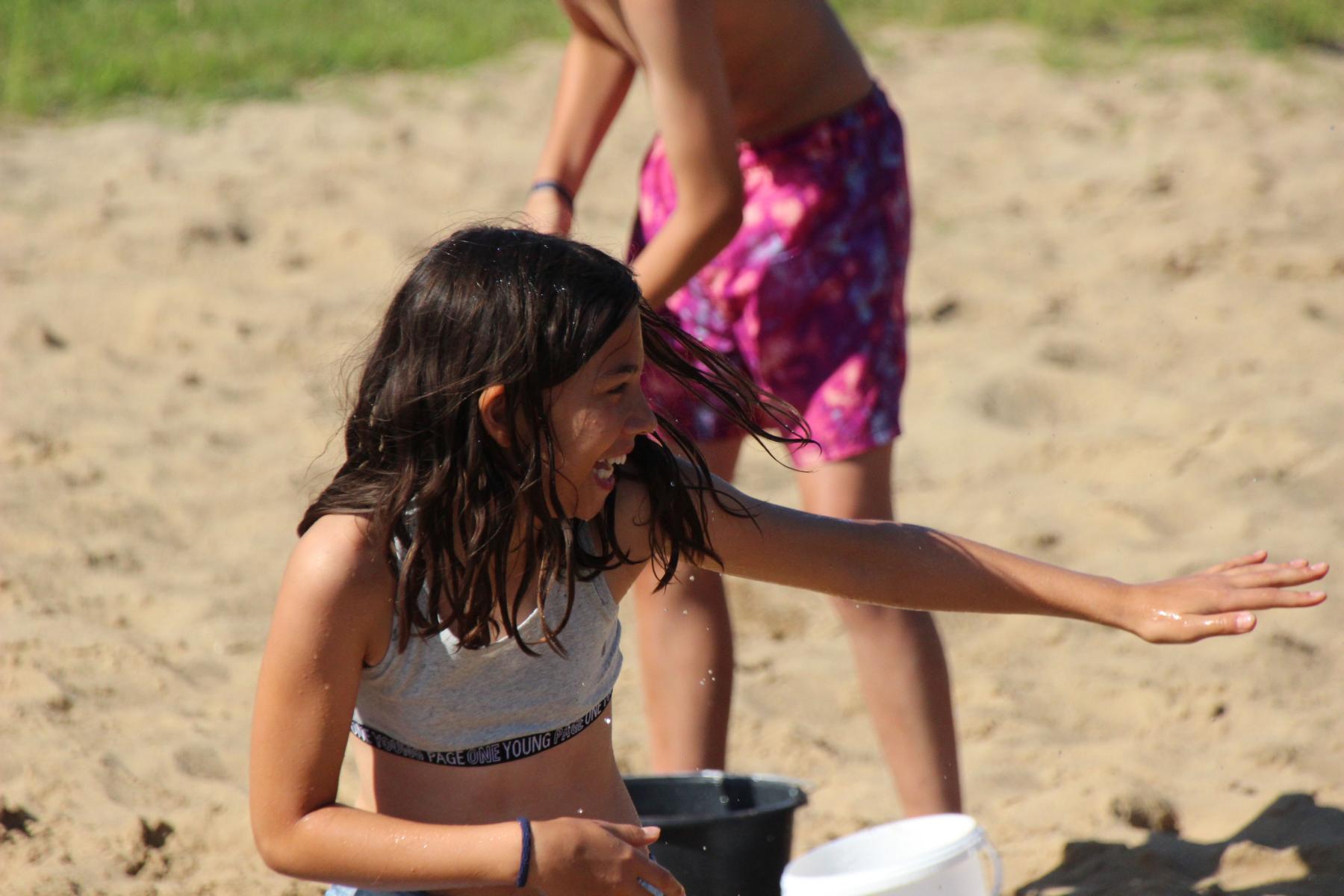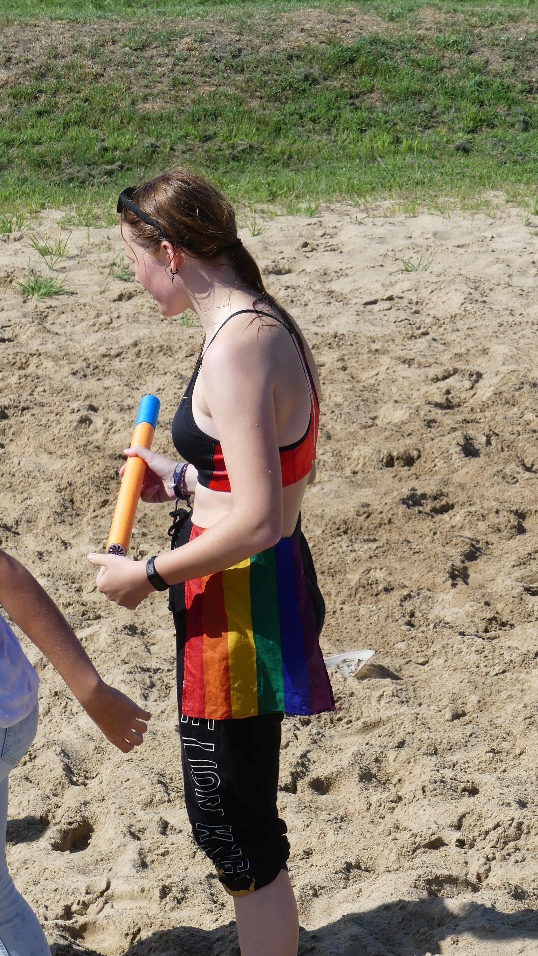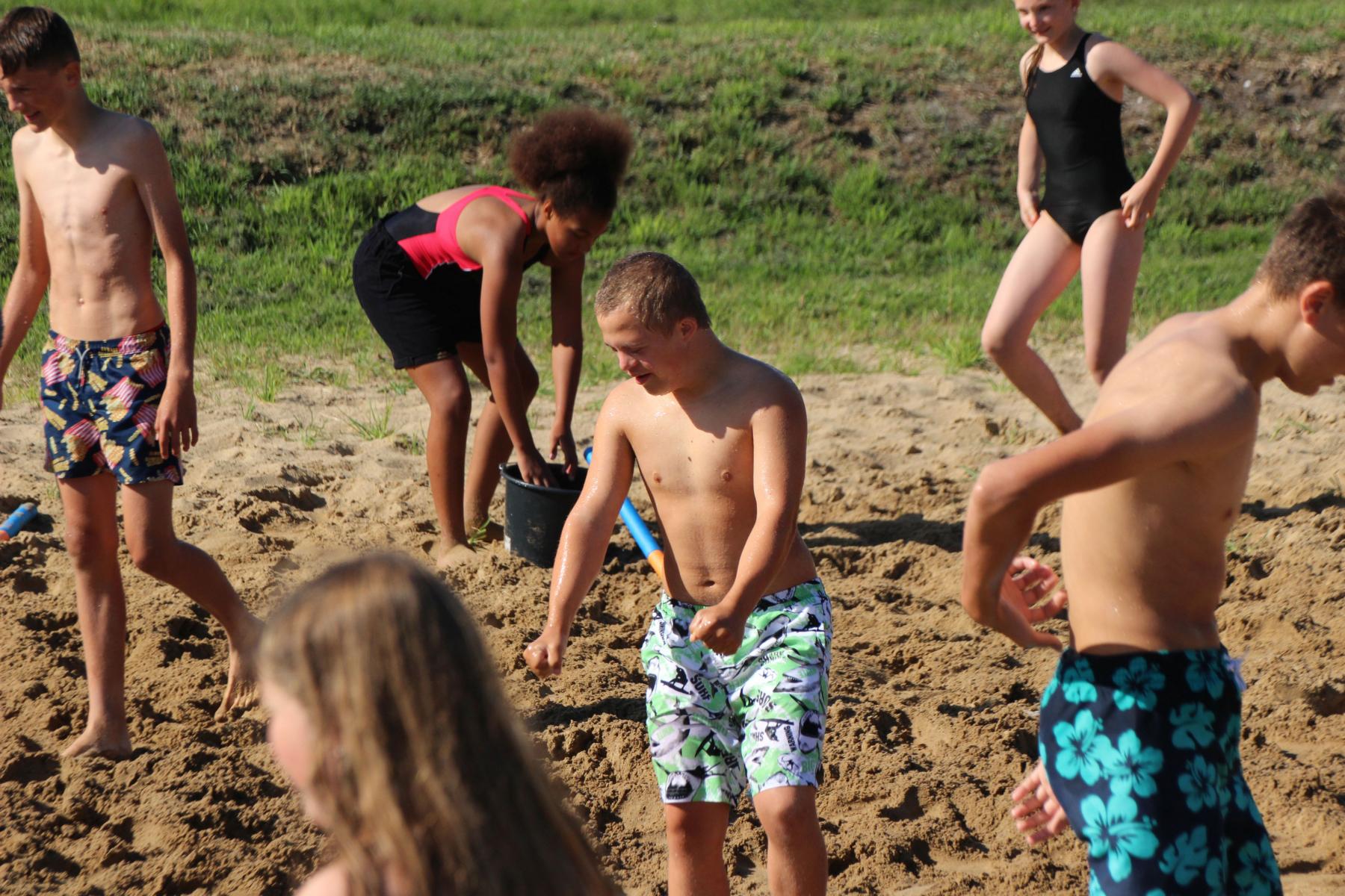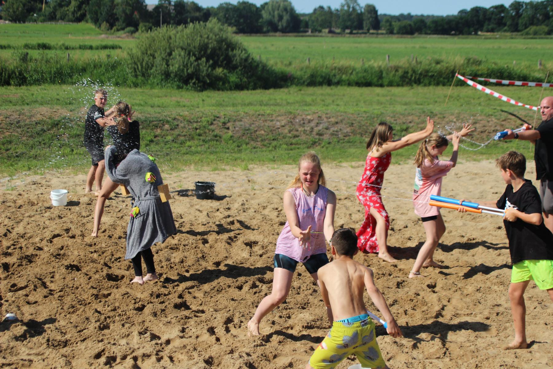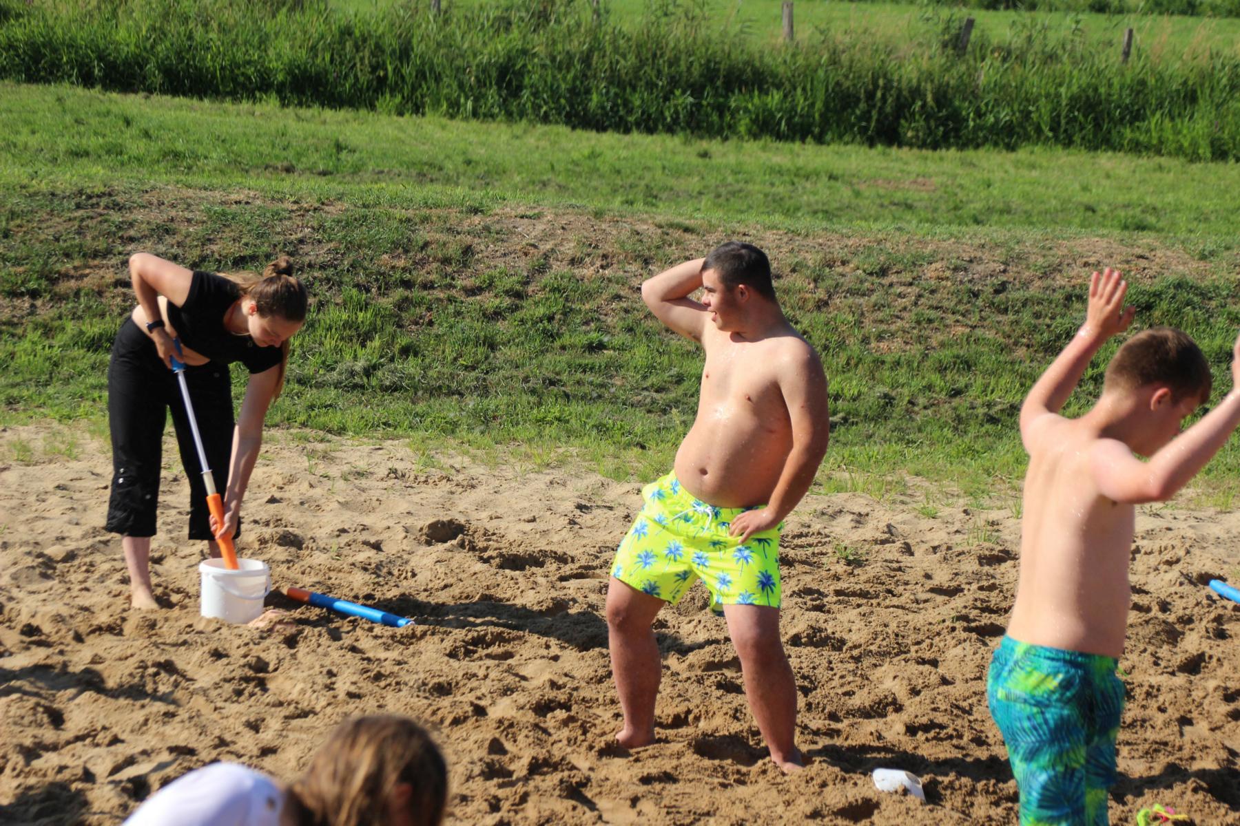 Der Nachmittag stand ganz im Zeichen der Beachparty. Diese fand dieses Jahr auf dem Beachhandballfeld statt. Hier wurde ein Spiel gespielt, bei dem es darum ging, die Betreuer eines anderen Zeltes möglichst nass zu machen. Das Zelt des Betreuers hatte die Aufgabe, ihren Betreuer möglichst gut vor dem Wasser zu schützen. Nach 90 Sekunden wurde der Bademantel des Betreuers ausgewrungen und die Rollen der Zelte wurden getauscht. Dies hat allen Kids sehr viel Spaß gemacht.