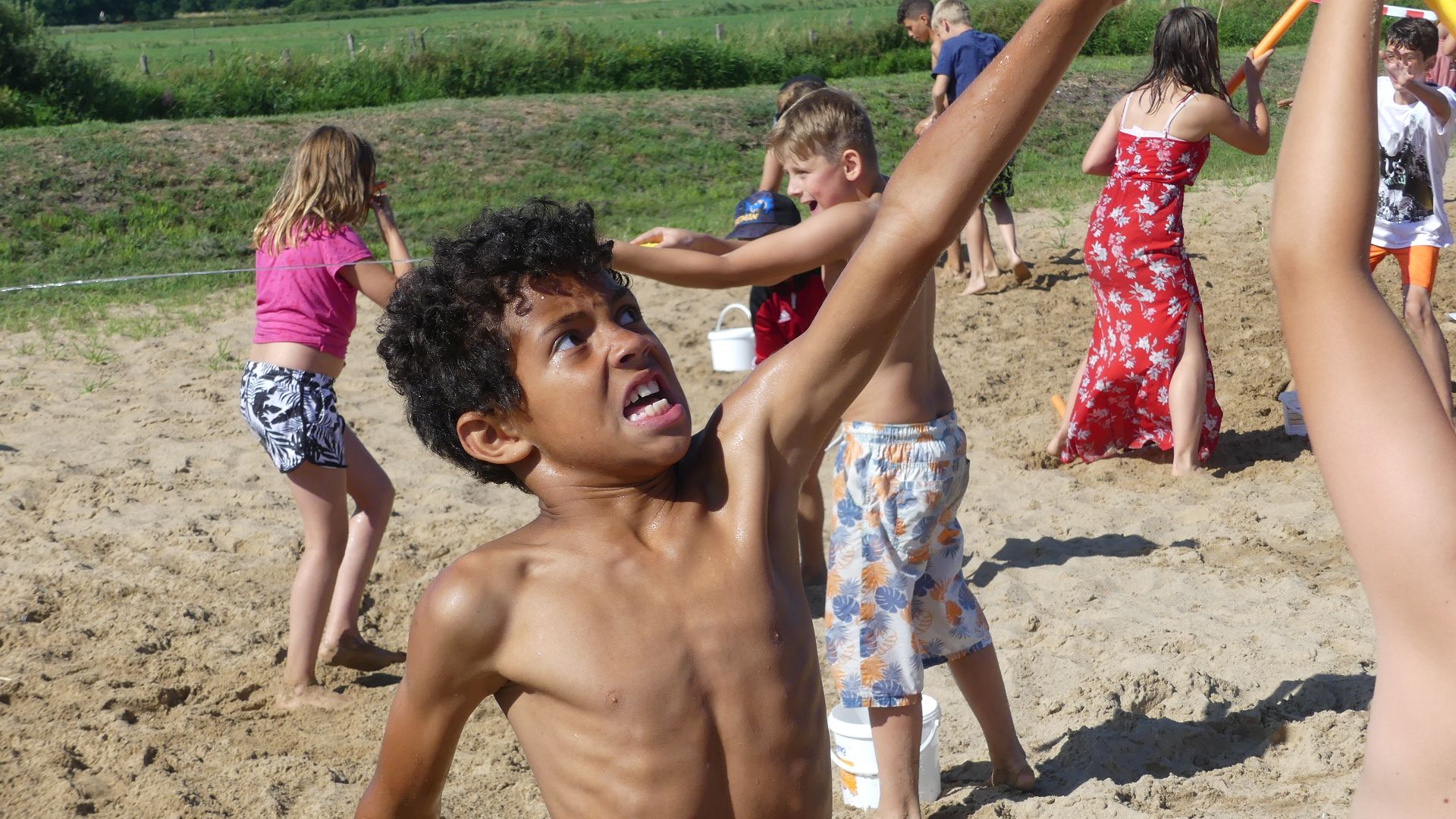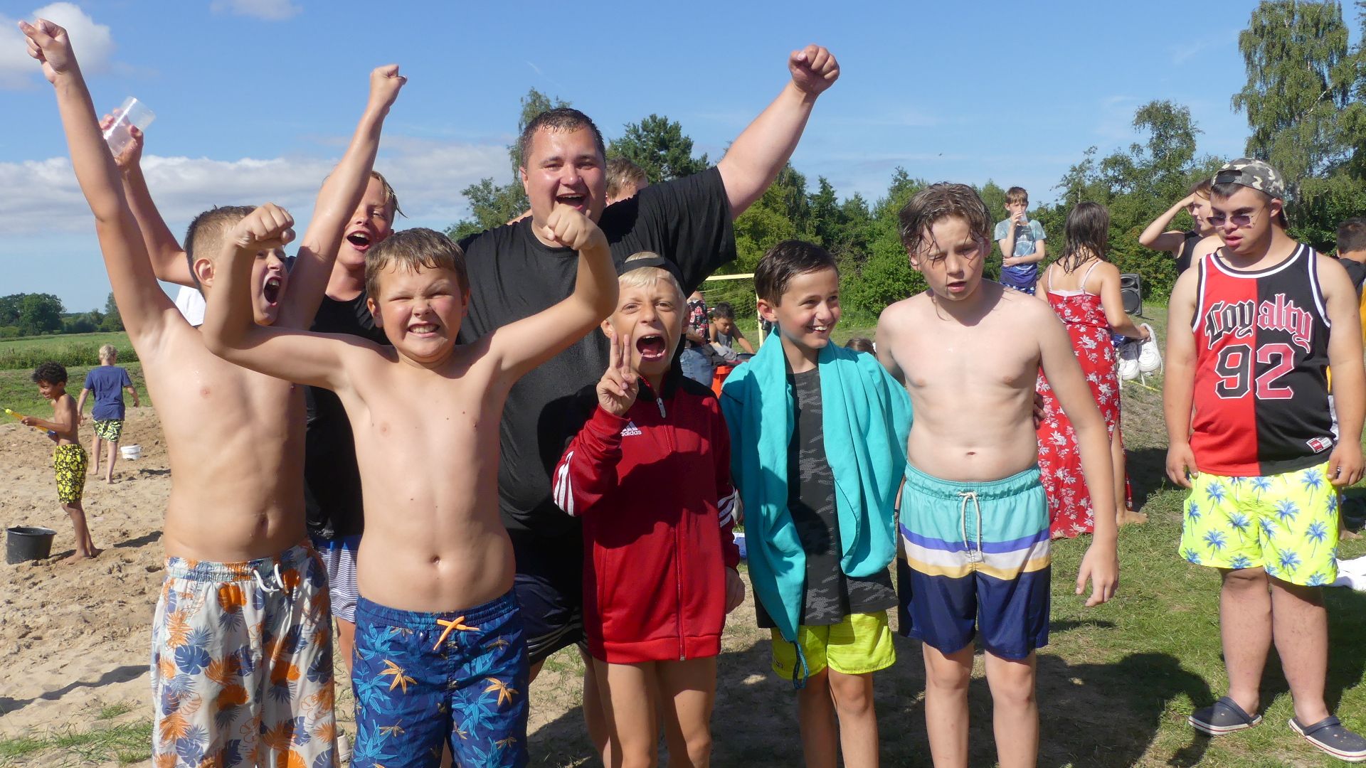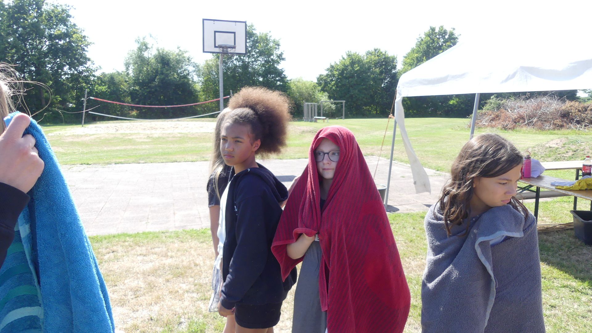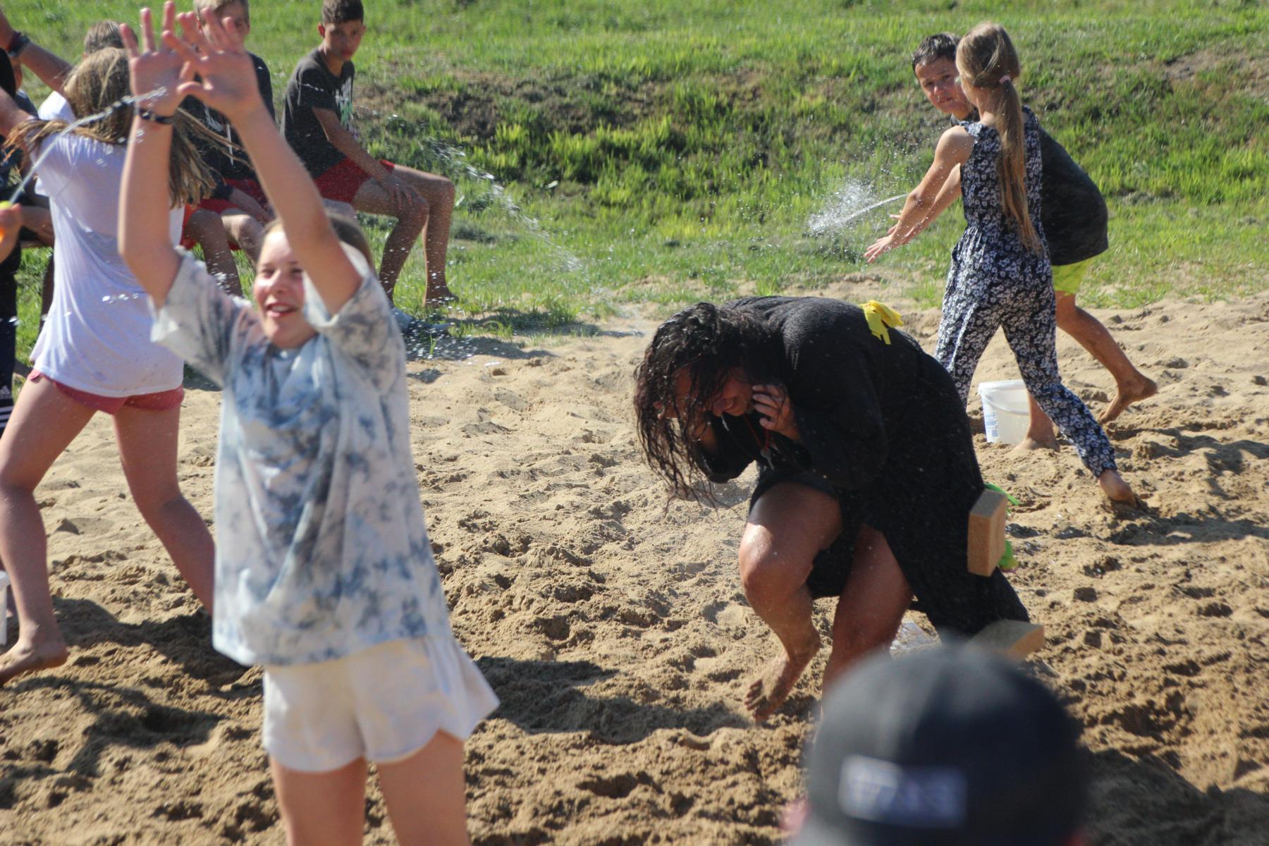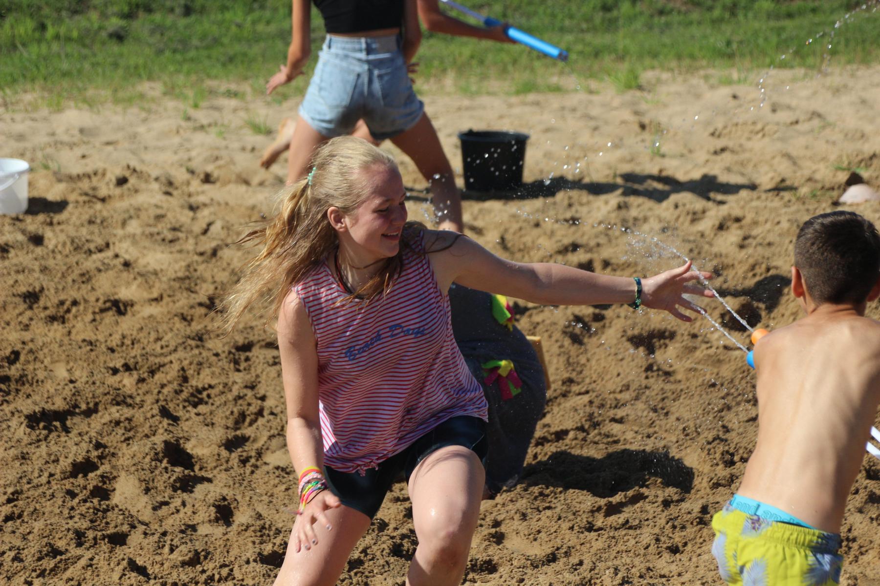 Der Nachmittag stand ganz im Zeichen der Beachparty. Diese fand dieses Jahr auf dem Beachhandballfeld statt. Hier wurde ein Spiel gespielt, bei dem es darum ging, die Betreuer eines anderen Zeltes möglichst nass zu machen. Das Zelt des Betreuers hatte die Aufgabe, ihren Betreuer möglichst gut vor dem Wasser zu schützen. Nach 90 Sekunden wurde der Bademantel des Betreuers ausgewrungen und die Rollen der Zelte wurden getauscht. Dies hat allen Kids sehr viel Spaß gemacht.