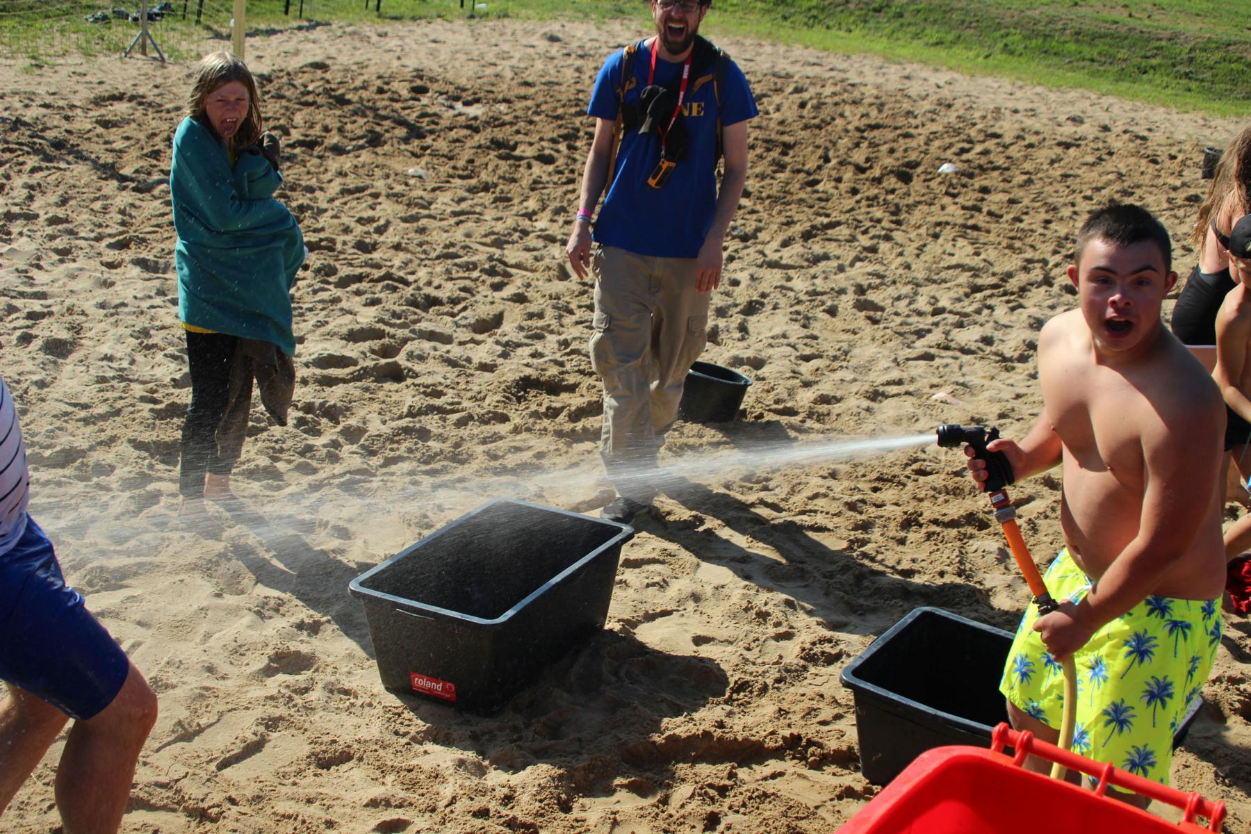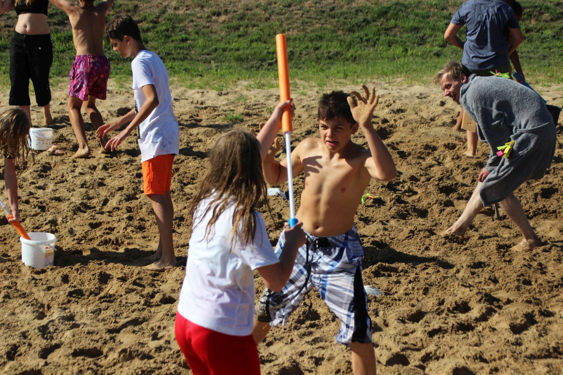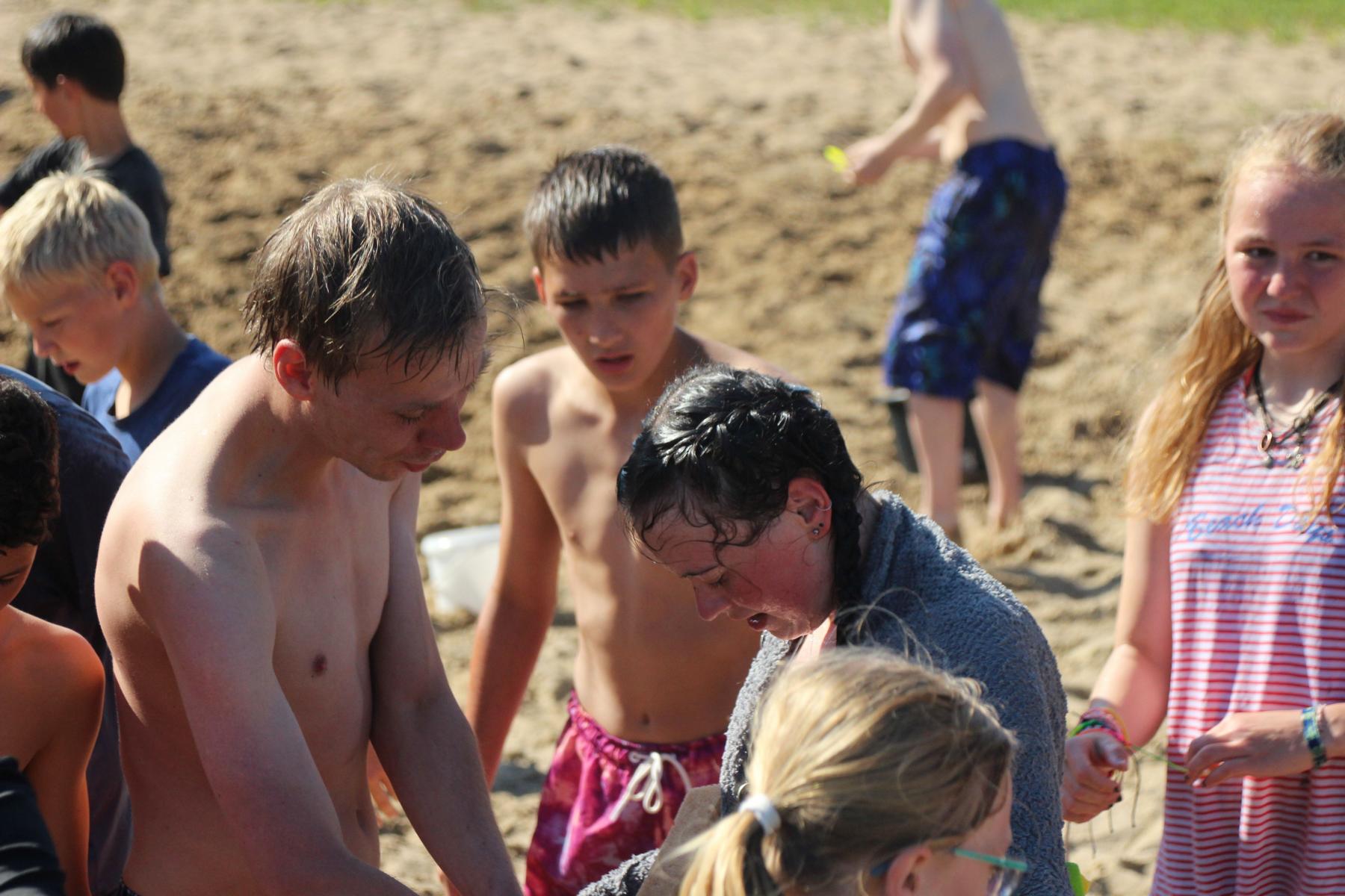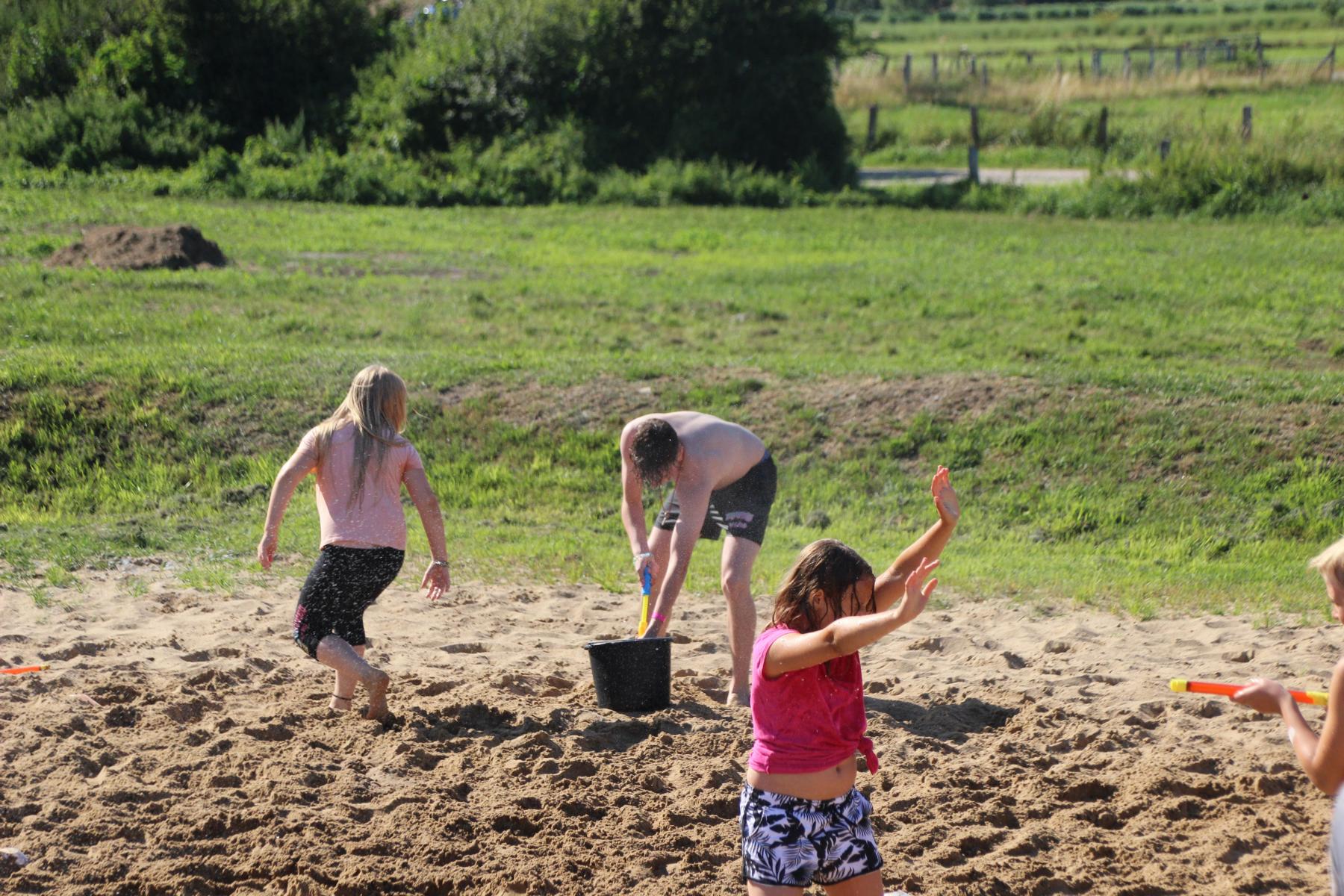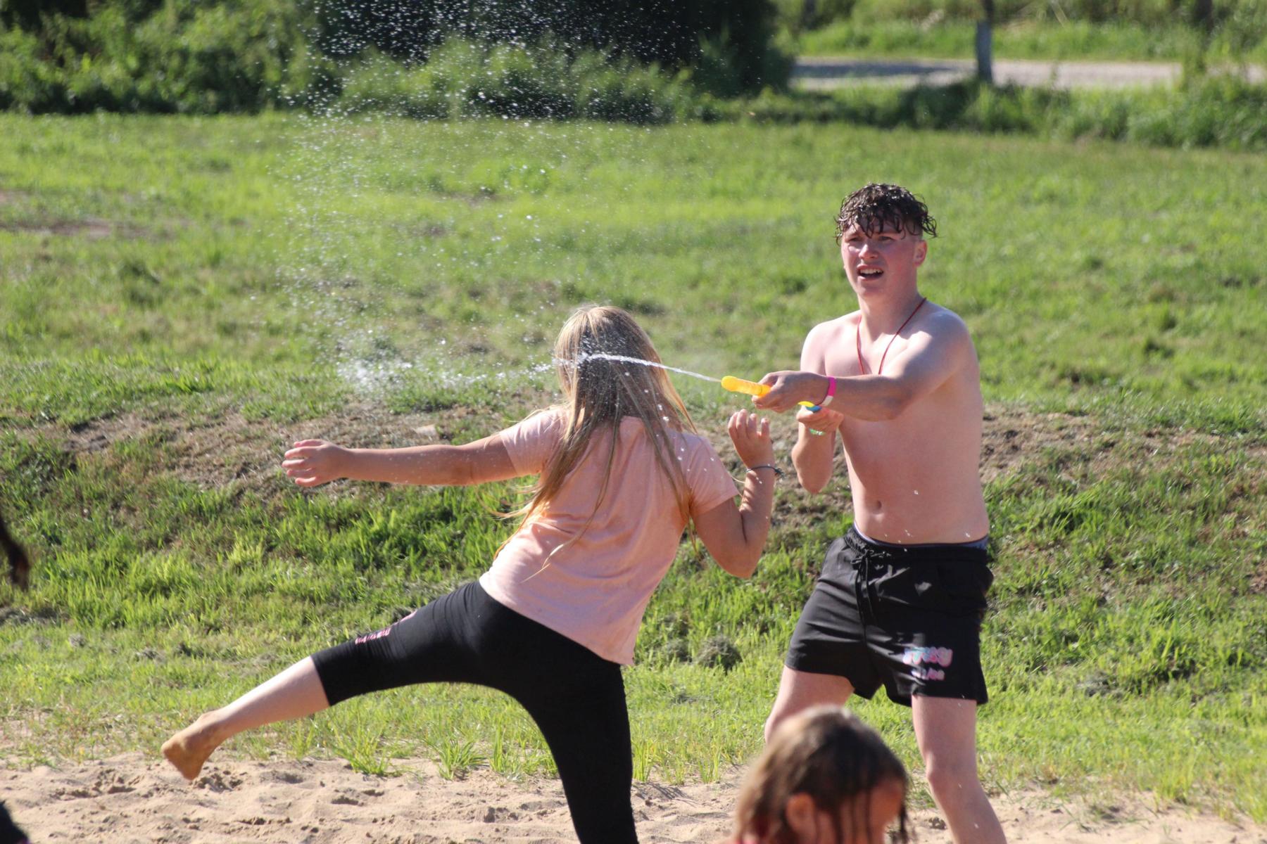 Der Nachmittag stand ganz im Zeichen der Beachparty. Diese fand dieses Jahr auf dem Beachhandballfeld statt. Hier wurde ein Spiel gespielt, bei dem es darum ging, die Betreuer eines anderen Zeltes möglichst nass zu machen. Das Zelt des Betreuers hatte die Aufgabe, ihren Betreuer möglichst gut vor dem Wasser zu schützen. Nach 90 Sekunden wurde der Bademantel des Betreuers ausgewrungen und die Rollen der Zelte wurden getauscht. Dies hat allen Kids sehr viel Spaß gemacht.