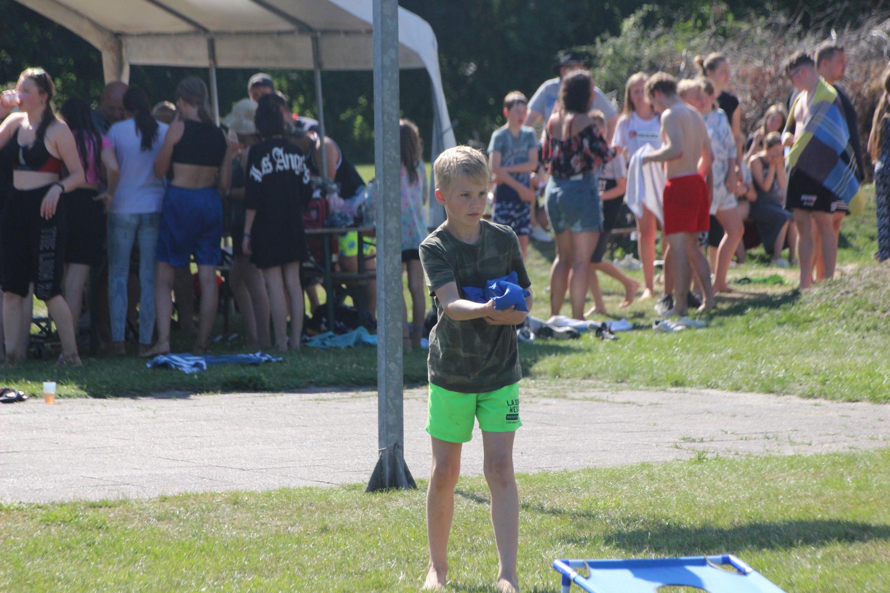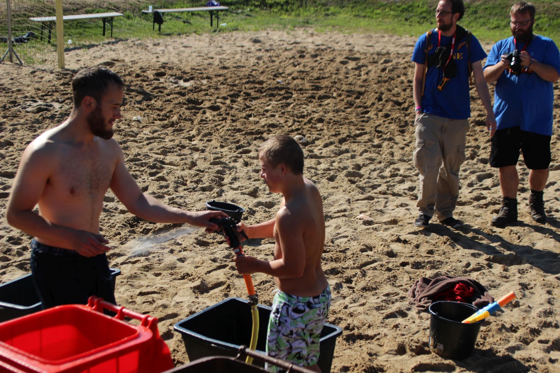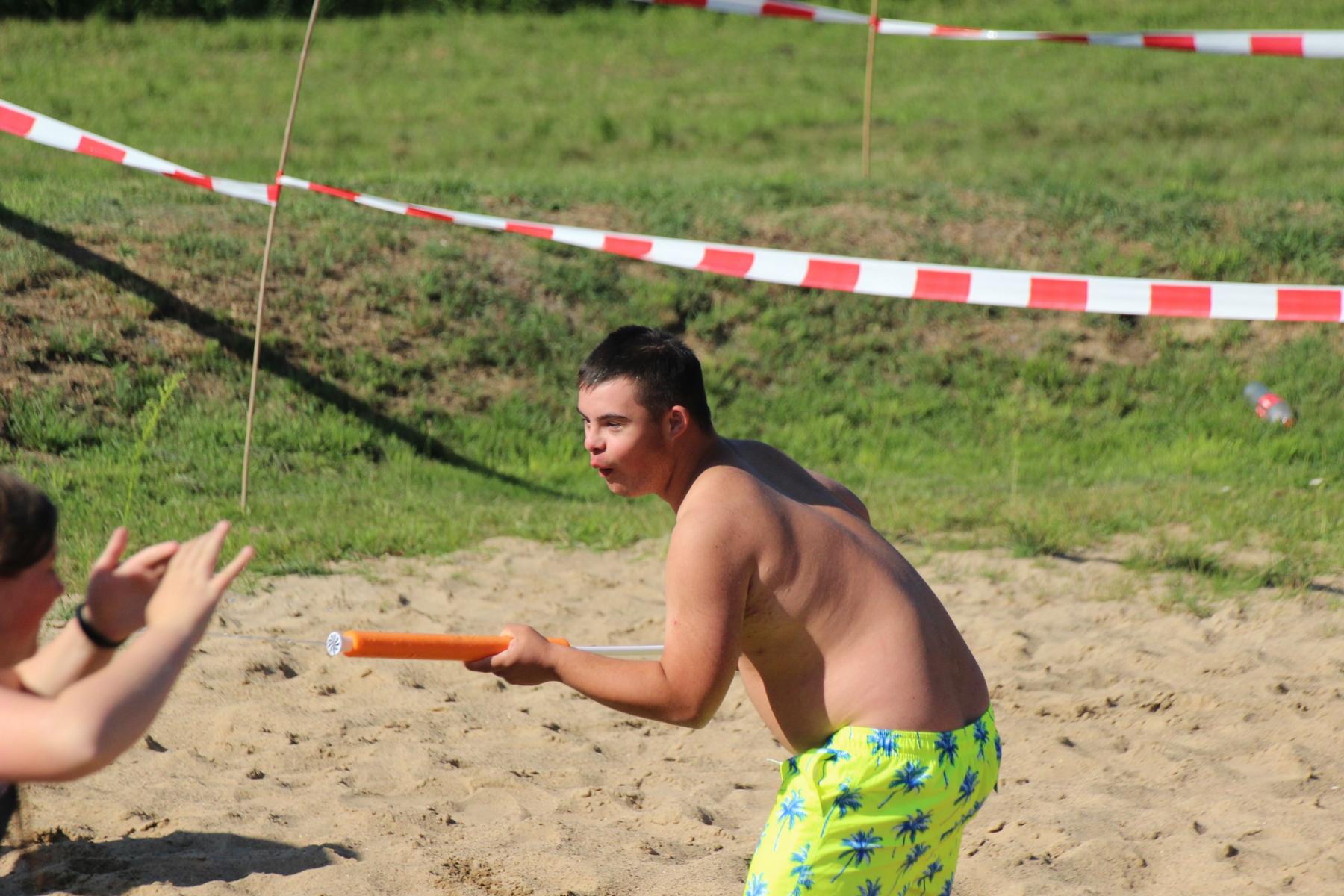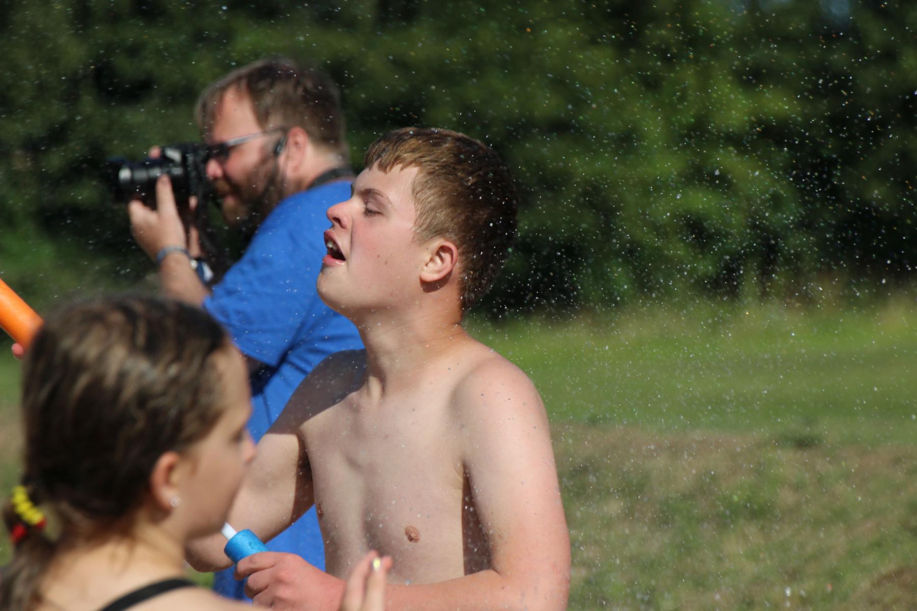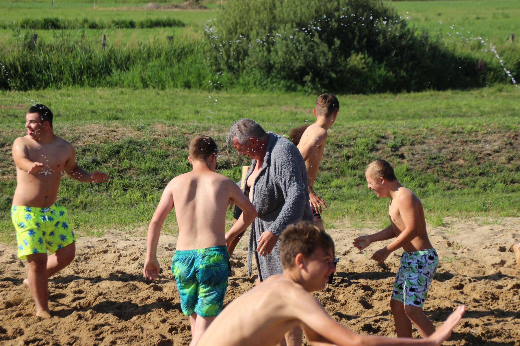 Der Nachmittag stand ganz im Zeichen der Beachparty. Diese fand dieses Jahr auf dem Beachhandballfeld statt. Hier wurde ein Spiel gespielt, bei dem es darum ging, die Betreuer eines anderen Zeltes möglichst nass zu machen. Das Zelt des Betreuers hatte die Aufgabe, ihren Betreuer möglichst gut vor dem Wasser zu schützen. Nach 90 Sekunden wurde der Bademantel des Betreuers ausgewrungen und die Rollen der Zelte wurden getauscht. Dies hat allen Kids sehr viel Spaß gemacht.