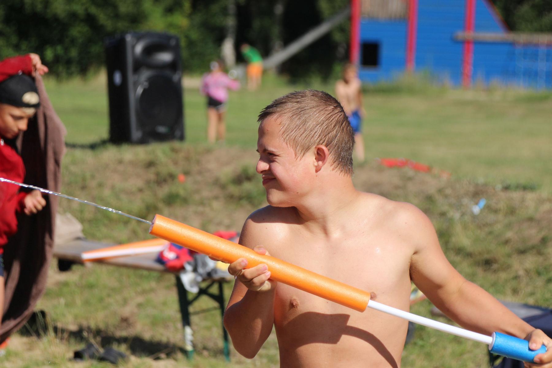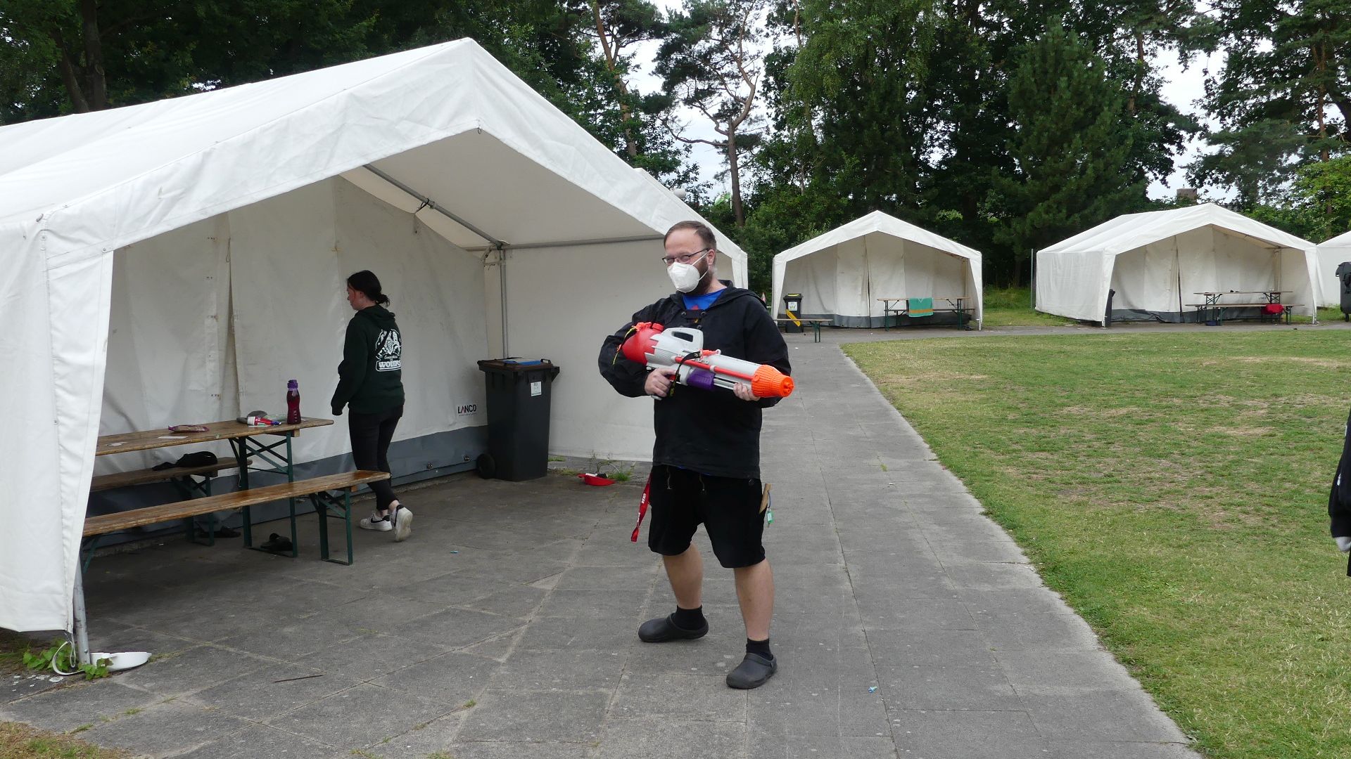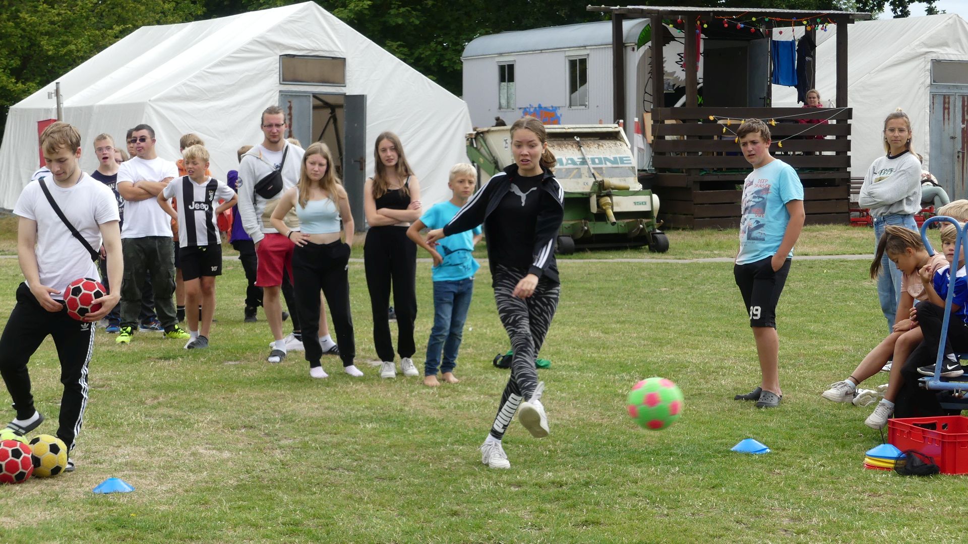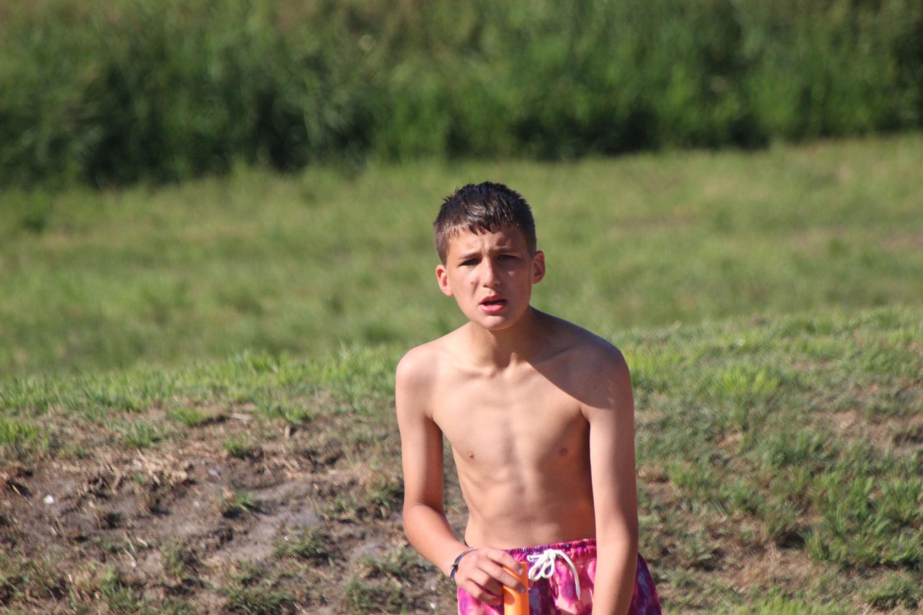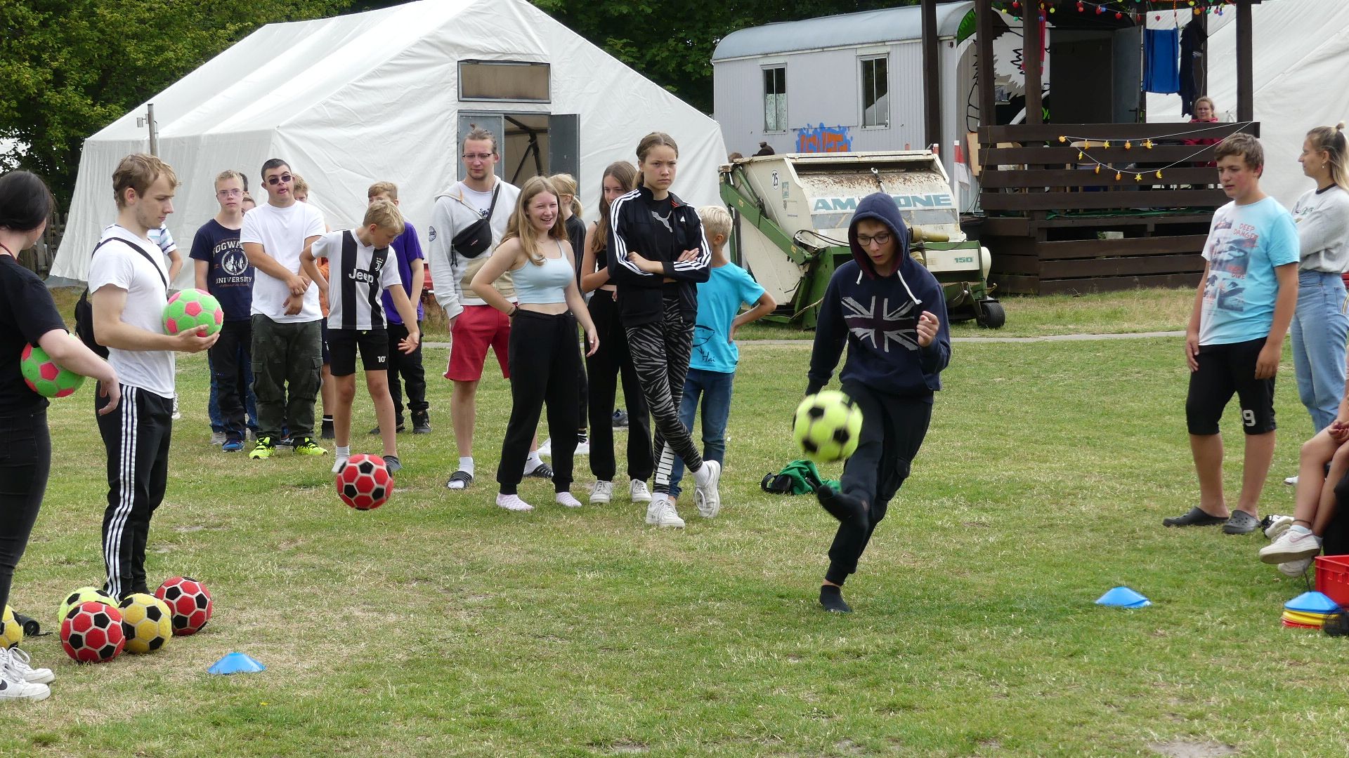 Der Nachmittag stand ganz im Zeichen der Beachparty. Diese fand dieses Jahr auf dem Beachhandballfeld statt. Hier wurde ein Spiel gespielt, bei dem es darum ging, die Betreuer eines anderen Zeltes möglichst nass zu machen. Das Zelt des Betreuers hatte die Aufgabe, ihren Betreuer möglichst gut vor dem Wasser zu schützen. Nach 90 Sekunden wurde der Bademantel des Betreuers ausgewrungen und die Rollen der Zelte wurden getauscht. Dies hat allen Kids sehr viel Spaß gemacht.