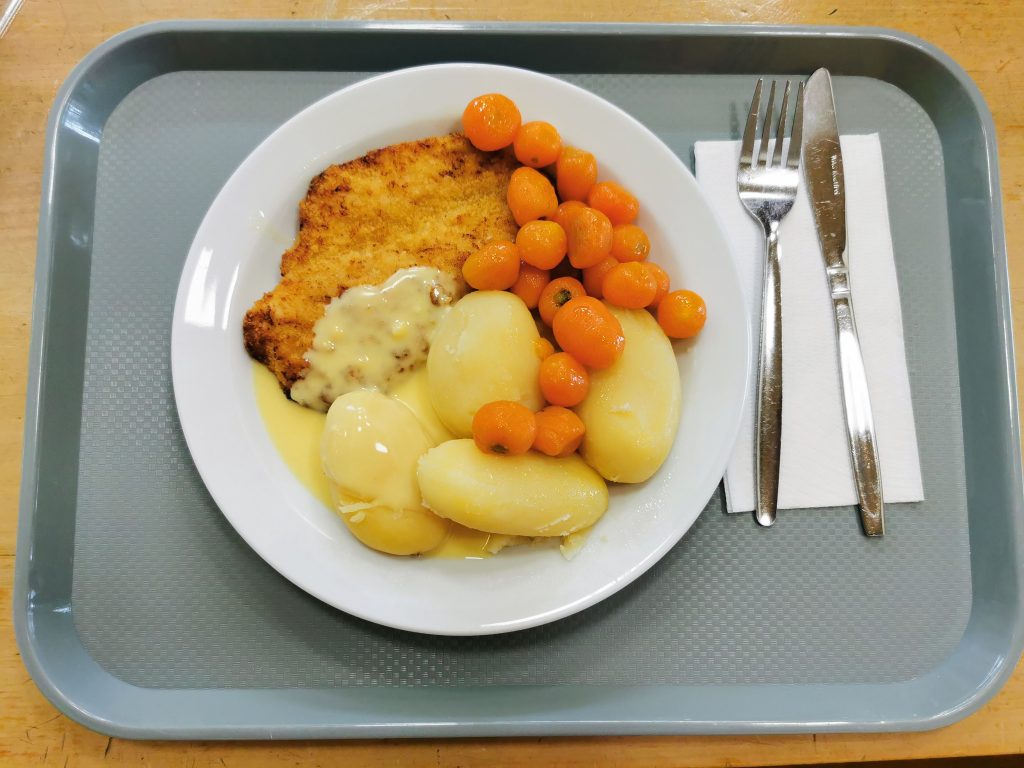 Zum Mittagessen gab es sehr gute Schnitzel mit Karotten, Kartoffeln und Sauce Hollandaise. Nach einer regnerischen Mittagspause lachte die Sonne auf den heutigen Projektnachmittag.
