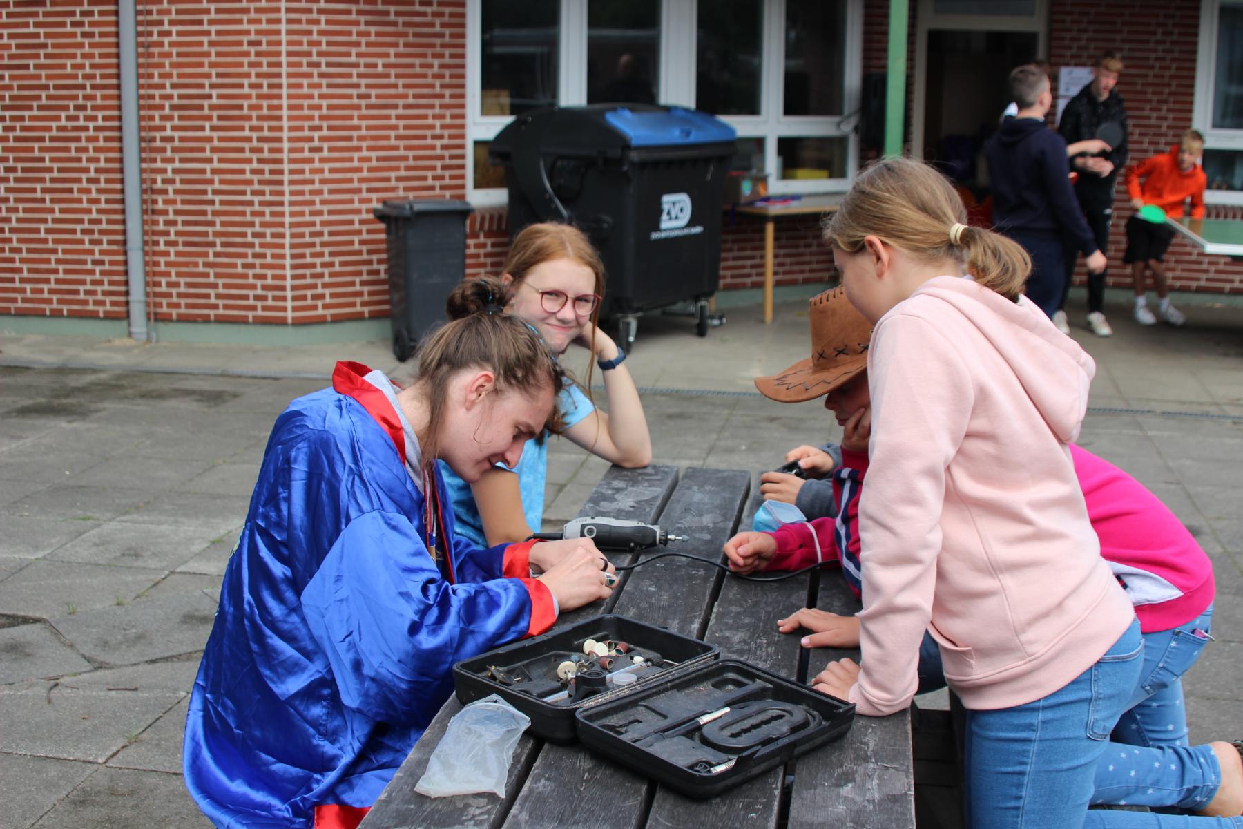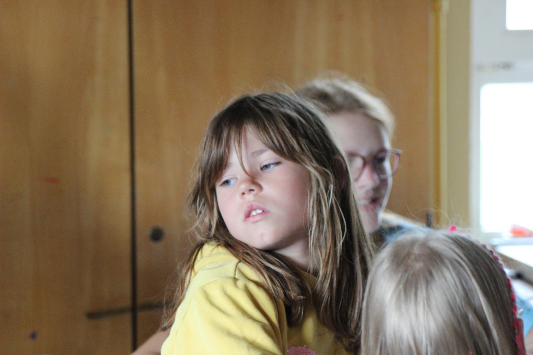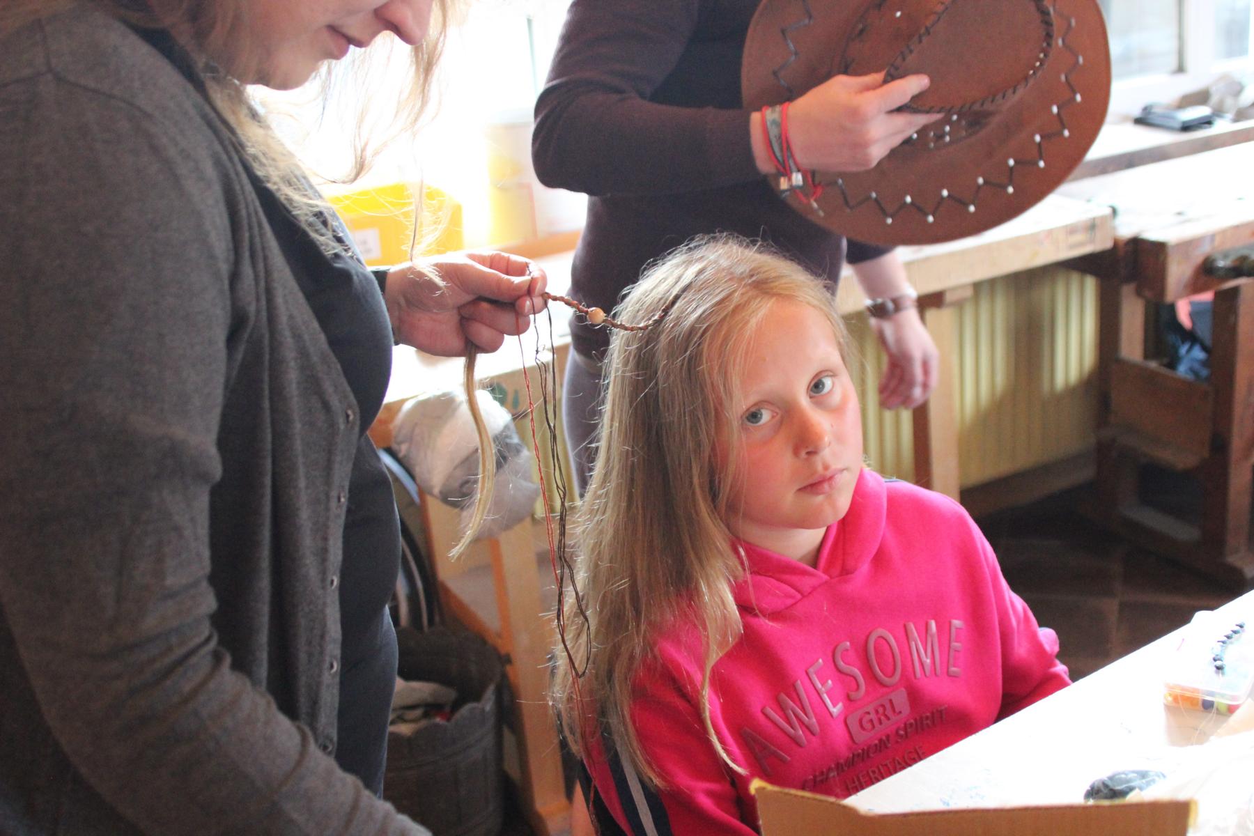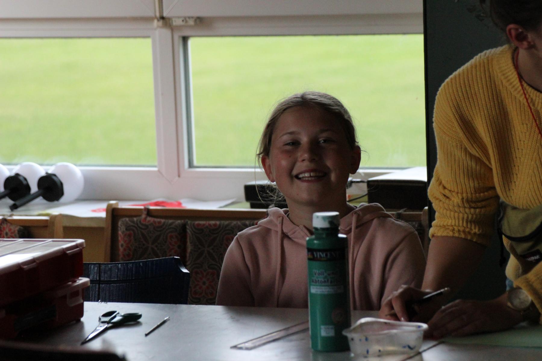 Heute ist Sonntag und somit gab es zu dem üblichen Frühstück aus Brötchen, Brot, Wurst, Käse, süßen Aufstrichen und Obst auch noch Müsli und Eier. Nach dem Frühstück konnten die Astronauten an der Tischtennisplatte den ganzen Vormittag so richtig durchstarten. Im Bastelraum wurden abgespacete Frisuren durch das Einflechten von bunten Bändern in die Haare kreiert. Auch versuchten sich einige Abenteurer daran, gemeinsam mit Betreuern Schmuck aus Mondgestein und Marskristallen herzustellen.
