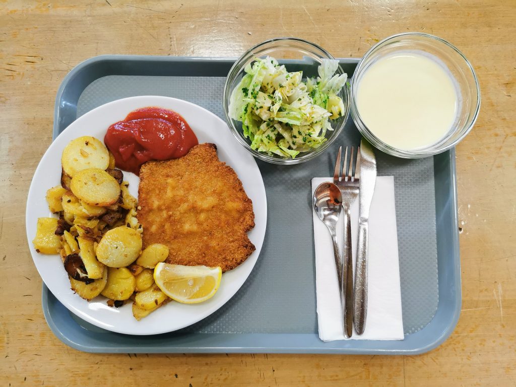 Pünktlich wie immer servierte die Besatzung der Küche Schnitzel mit Bratkartoffeln und Salat. Der dazu gereichte Nachtisch bestand heute aus Grießpudding an Roter Grütze oder wahlweise Wackelpudding mit Vanillesauce.