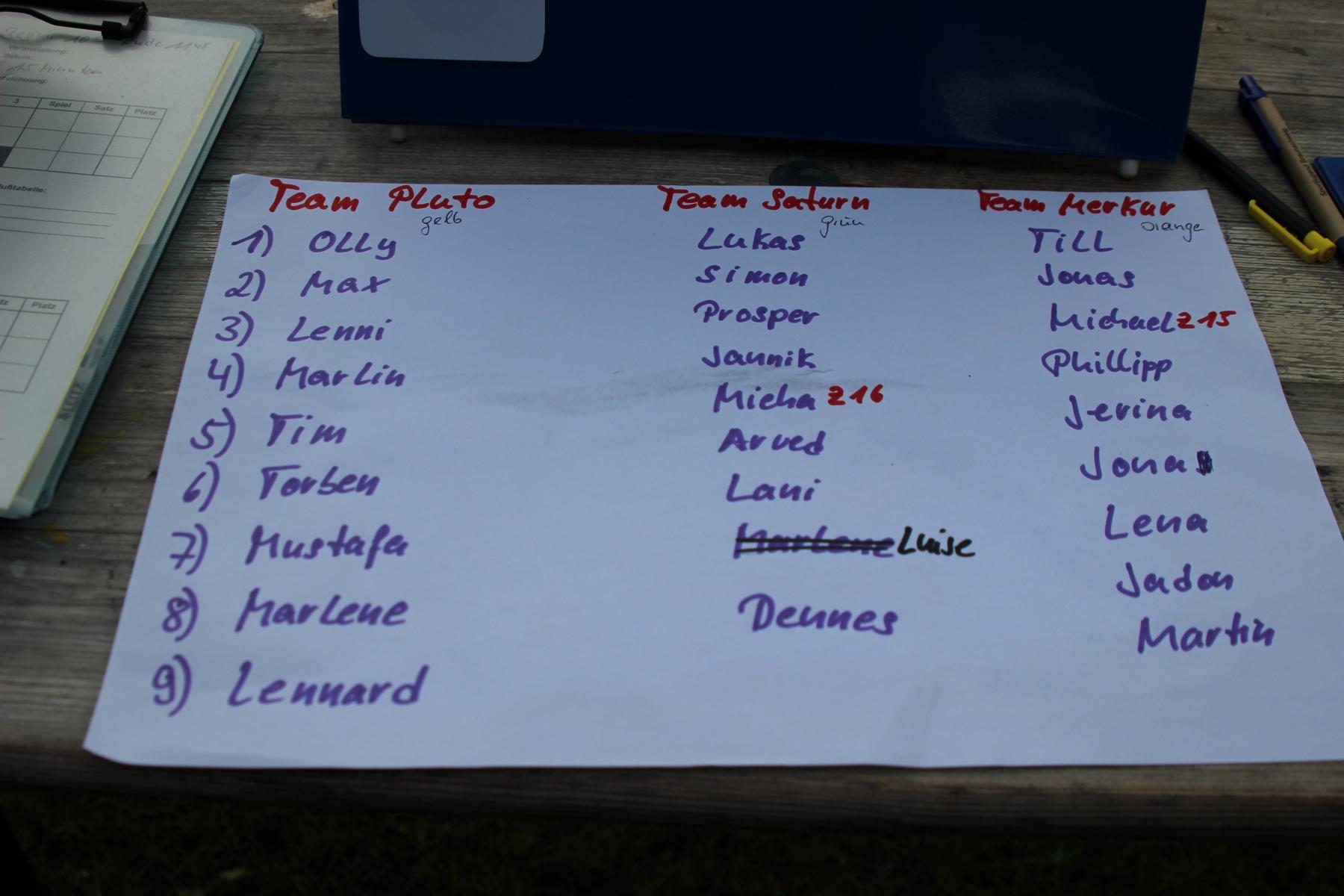 Nach einem reichhaltigen Frühstück stand am heutigen morgen das Fußballturnier an. Drei Mannschaften, Saturn, Pluto und Merkur, standen sich gegenüber. Bis zur letzten Minute war noch nichts entschieden, da alle Mannschaften sich in Talent und Stärke in nichts nachstanden und hart aber fair um Sieg wetteiferten.