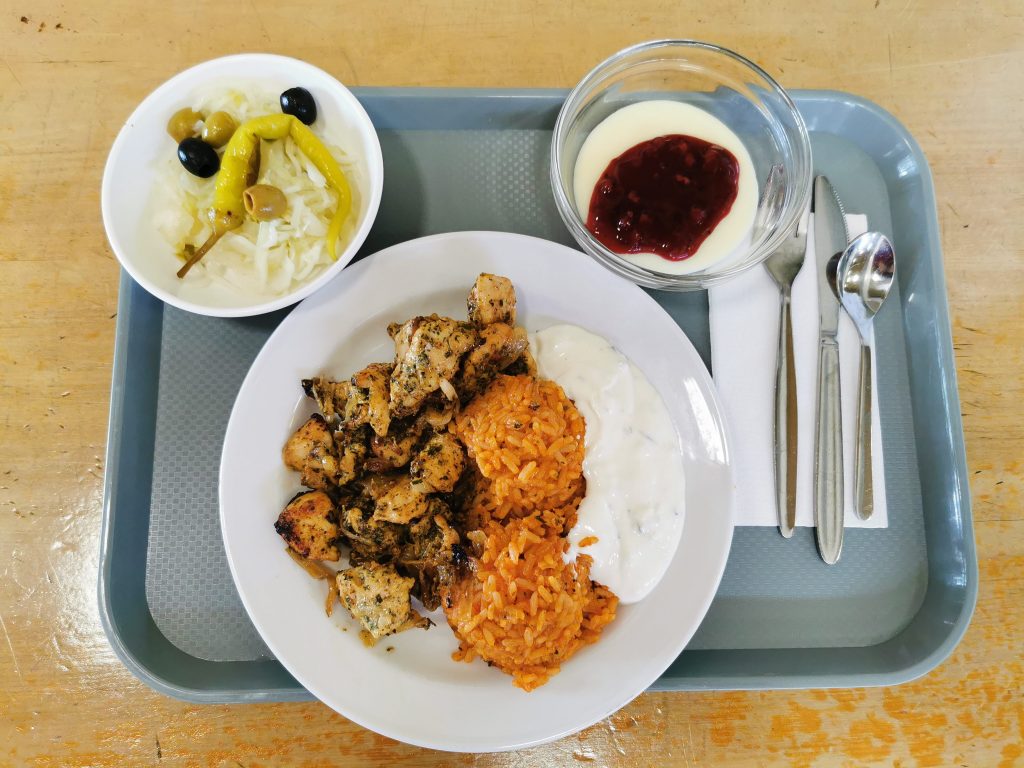 Im astronomischen Casino wurden zum Mittag Hühnchengyros mit Reis und Krautsalat gereicht. Der Nachtisch bestand aus Grießpudding mit Roter Grütze.