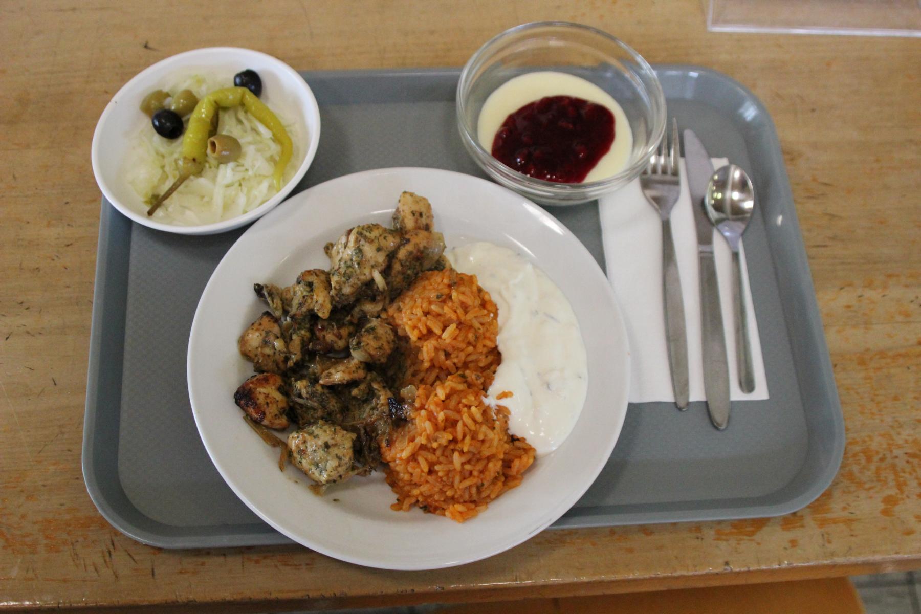 Im astronomischen Casino wurden zum Mittag Hühnchengyros mit Reis und Krautsalat gereicht. Der Nachtisch bestand aus Grießpudding mit Roter Grütze.