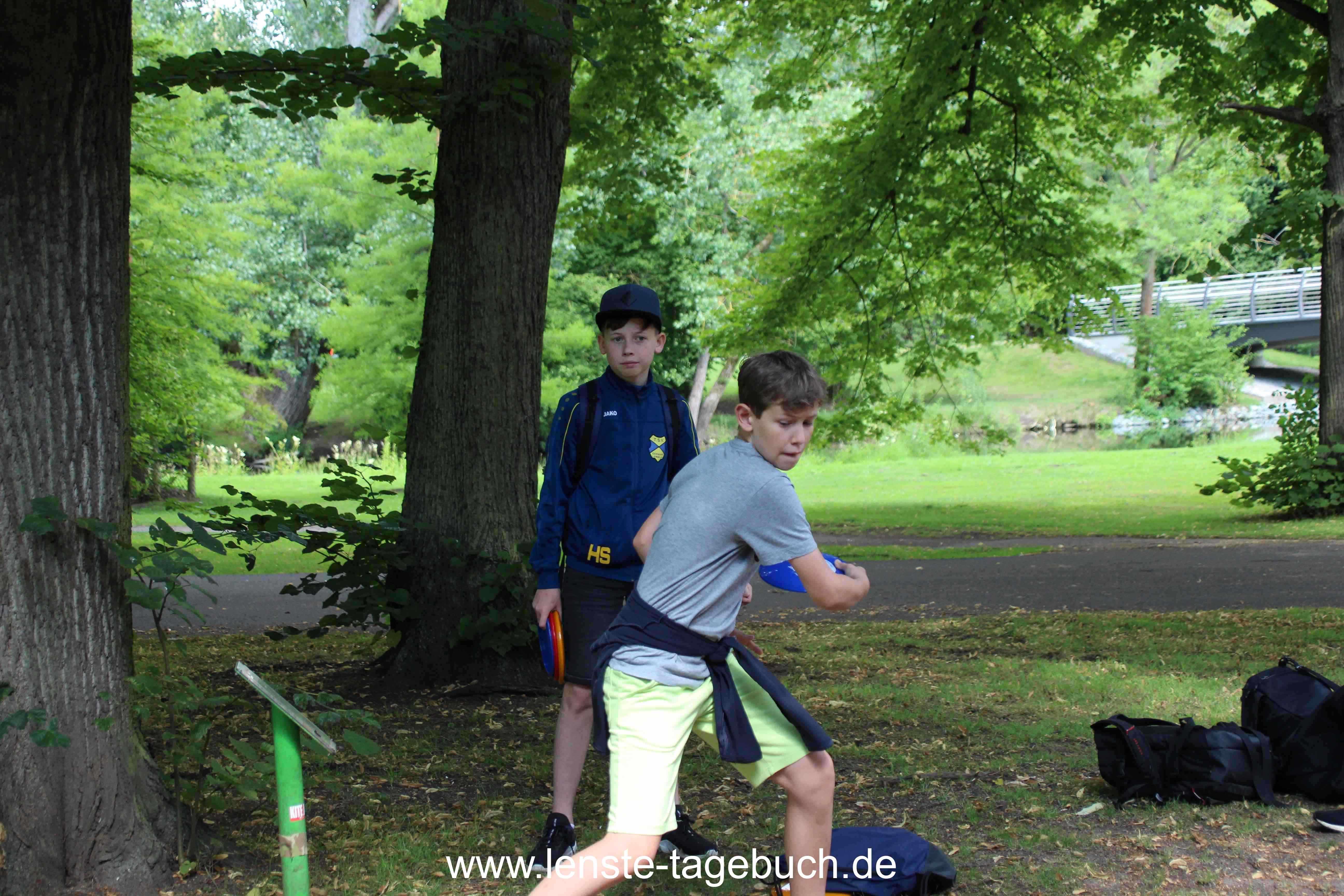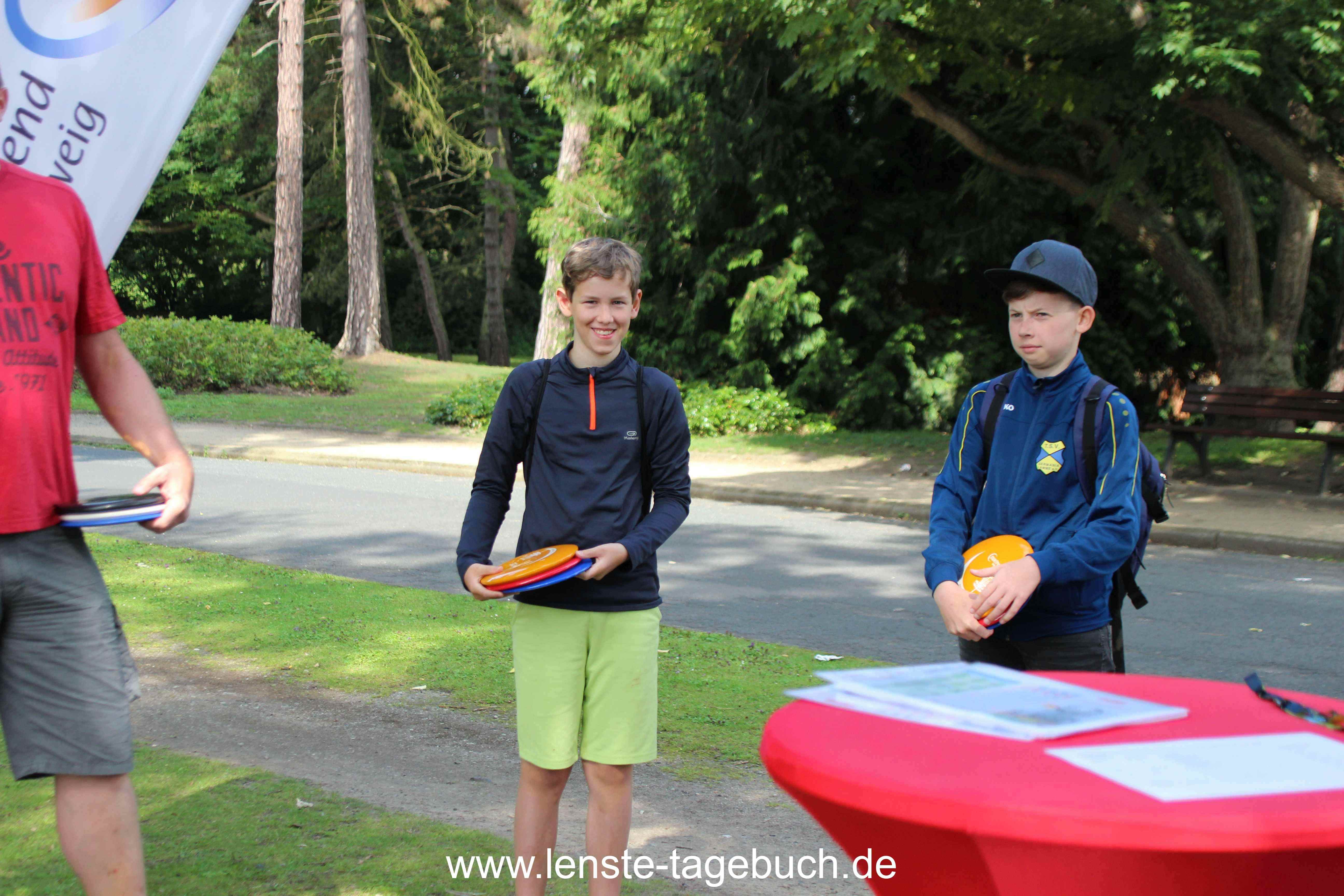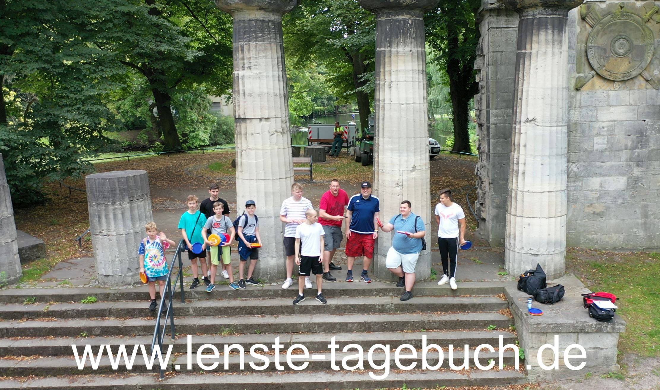 7 Teilnehmer und die Betreuer der Sportjugend Braunschweig trafen sich bei angenehmen Temperaturen im Bürgerpark, wo es nach einer kurzen Anmeldung und Einführung zum ersten Korb des Disc-Golf Parcours ging.