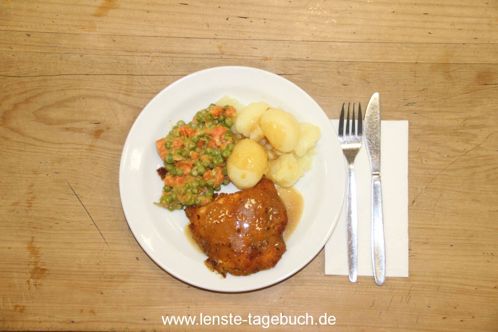 Mittagessen: Leckeres Cordon Bleu mit Kartoffeln und Erbsen-Möhren-Gemüse