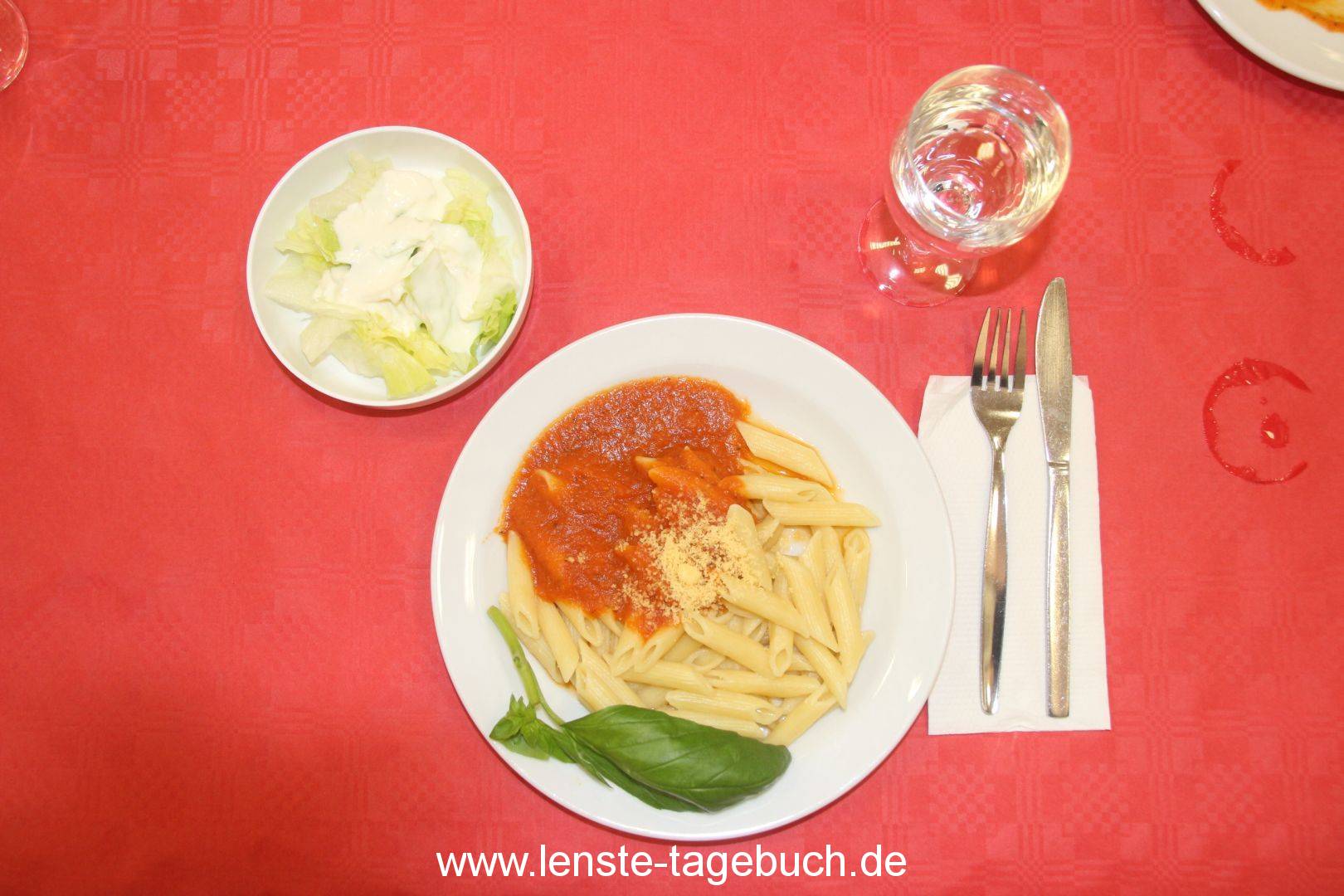 Mittagessen: Maccheroni mit Tomatensoße und Salat