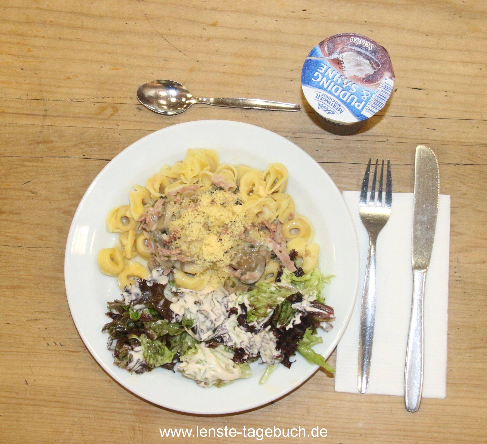 Mittagessen: Tortellini mit Schinken-Sahnesoße, Salat und zum Nachtisch Pudding