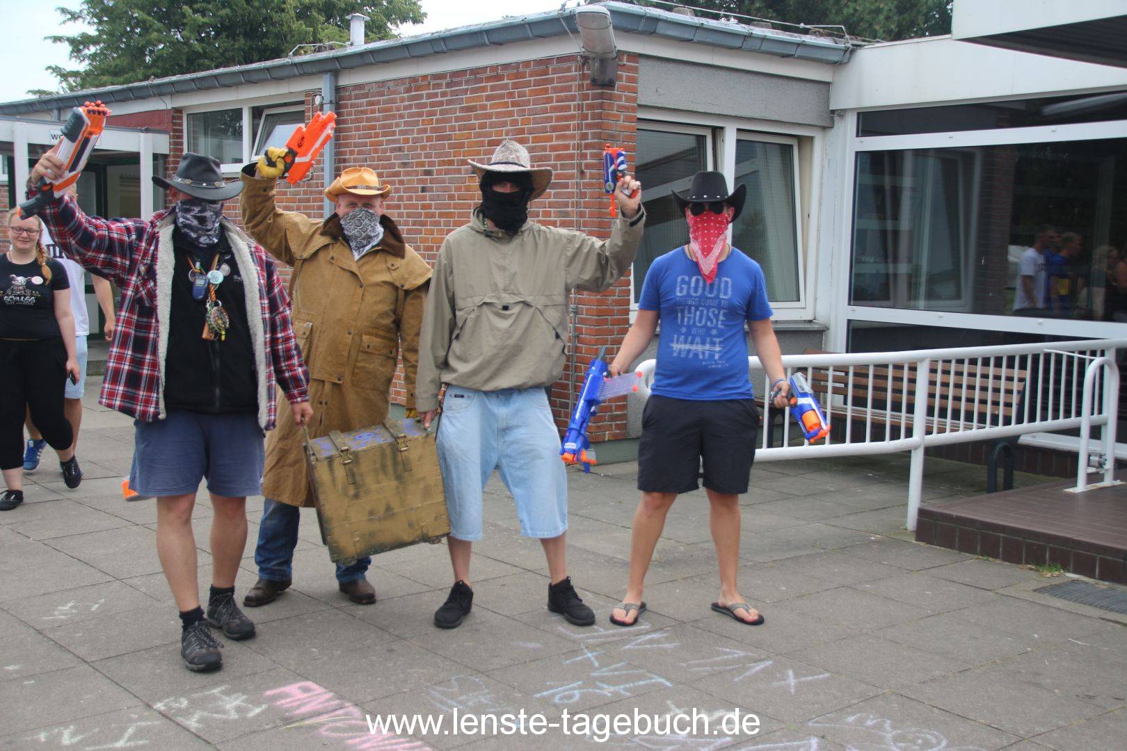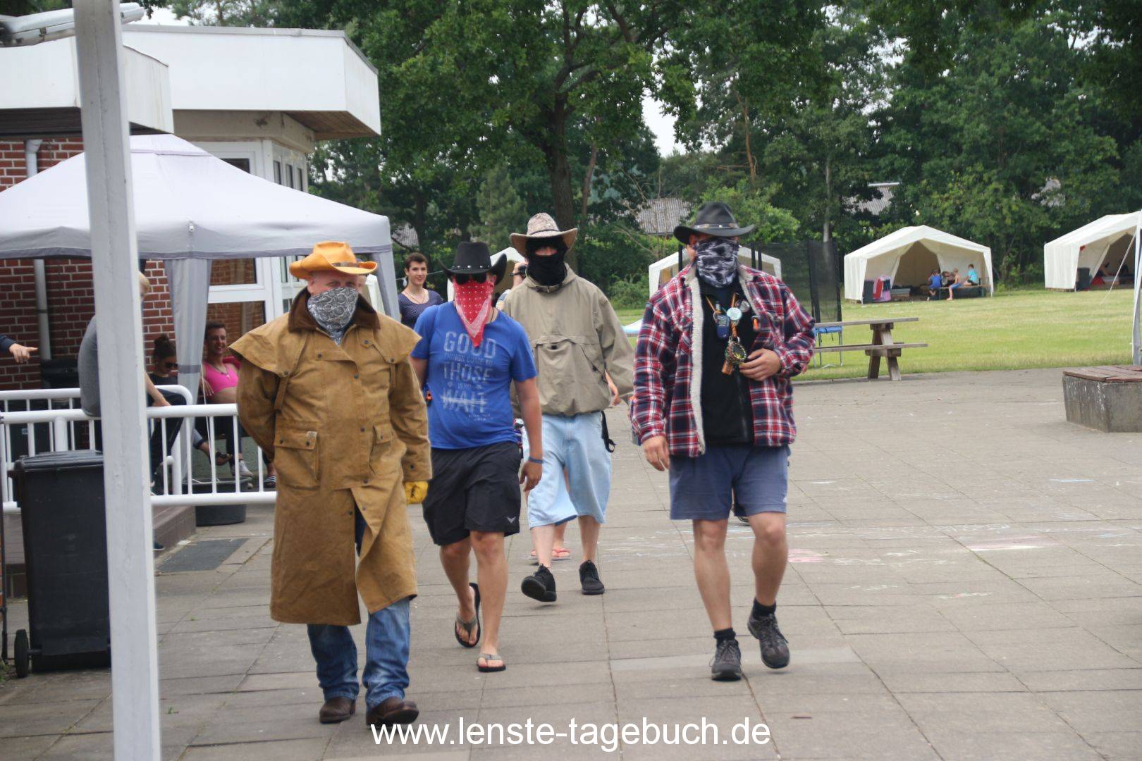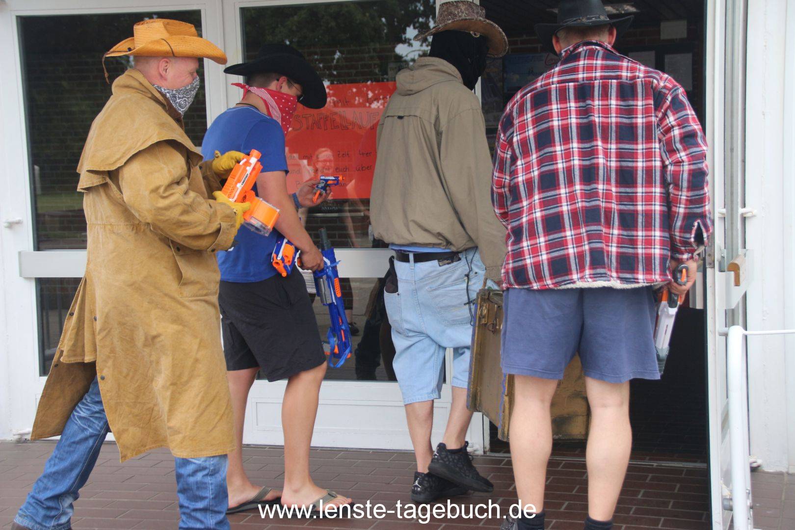 Die dreisten Gangster haben heute gegen Mittag erneut die Lenste-Zentralbank überfallen und dabei eine Schatztruhe mit Süßigkeiten erbeutet! Sie konnten anschließend unerkannt auf dem Zeltplatz entkommen.