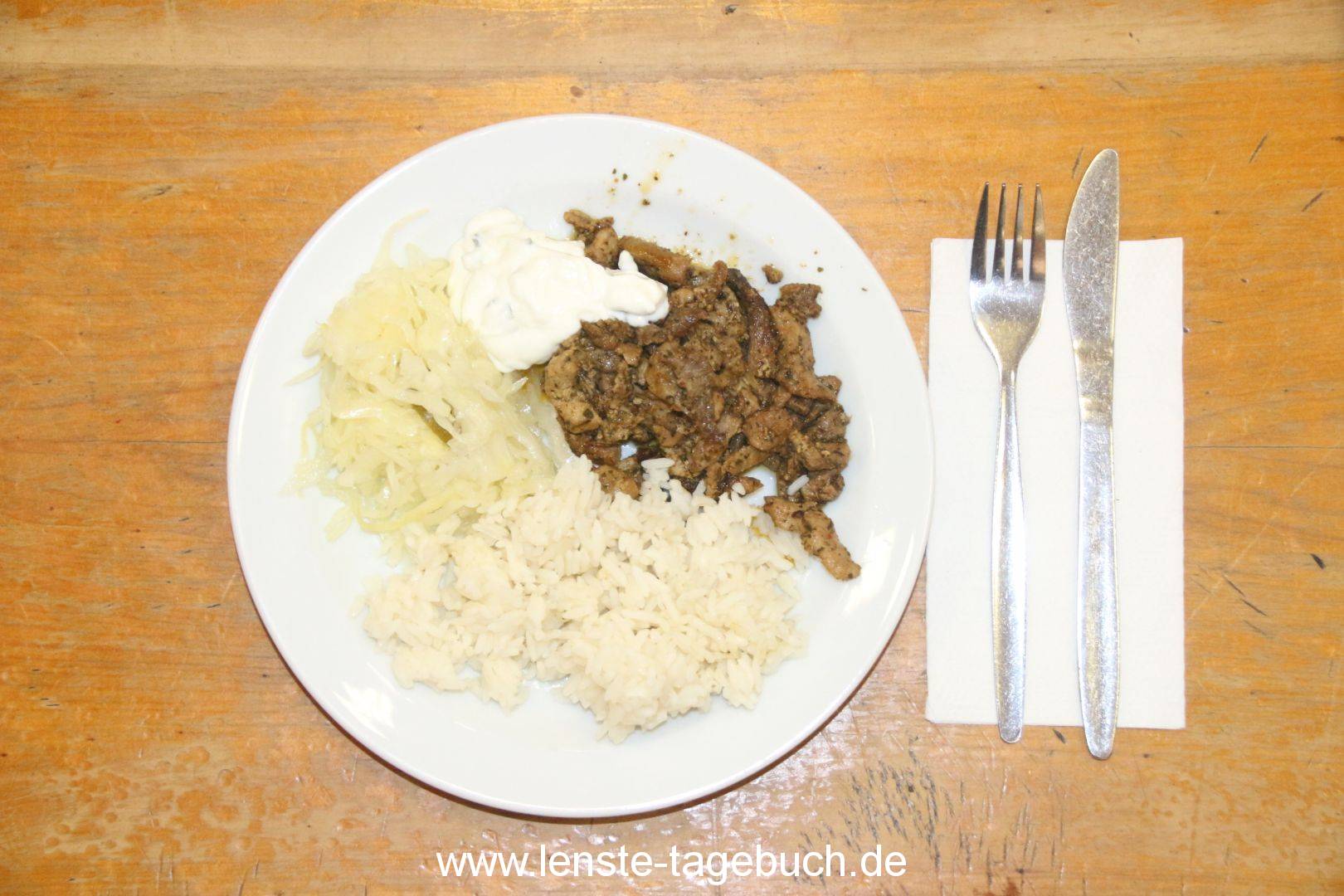 Mittagessen: Gyros mit Reis, Zaziki und Krautsalat