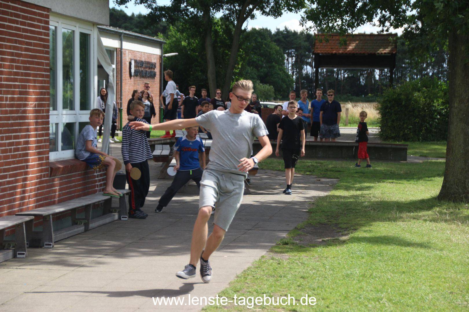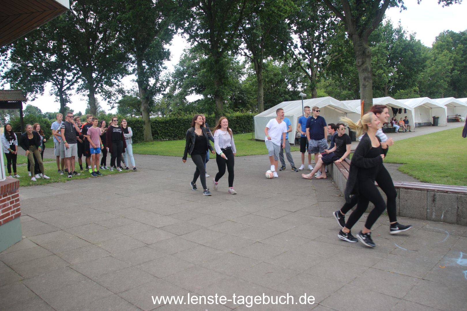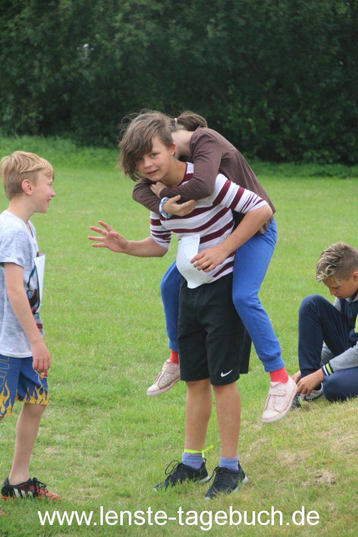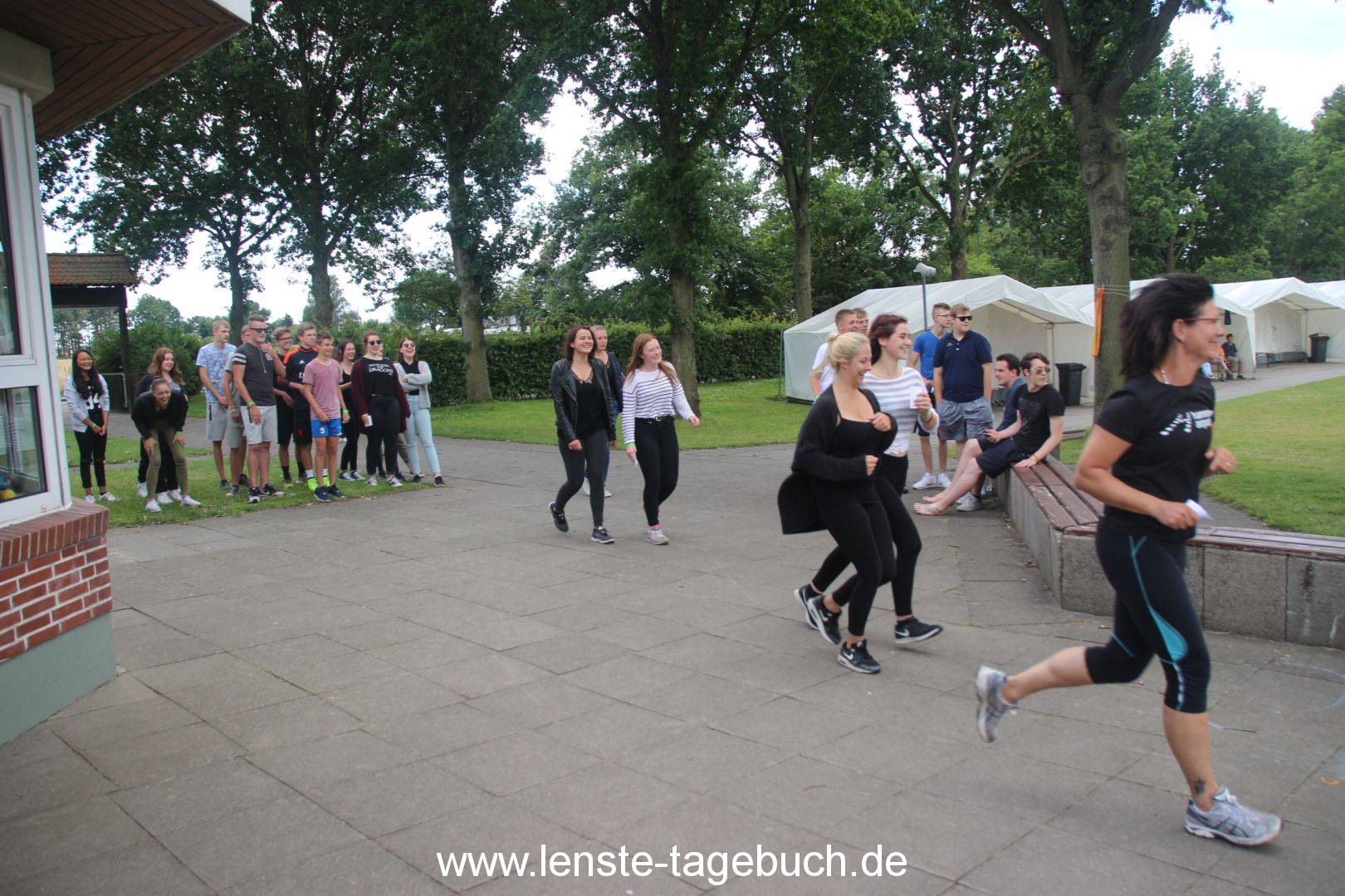 Unser Tagesprogramm beginnt heute mit einem Staffellauf und einem Line Dance. Beim Staffellauf geht es einmal rundherum um unser Lager – und es machen ziemlich viele von uns mit wahnsinniger Freude und Ehrgeiz mit. Ein Staffellauf stellt quasi eine historische Methode des Nachrichtenversand per Bote dar: