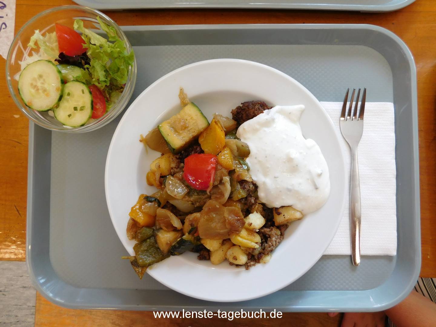 Zum Mittagessen gab es Hackfleisch-Kartoffel-Pfanne „Mediterran“ mit Tzaziki.