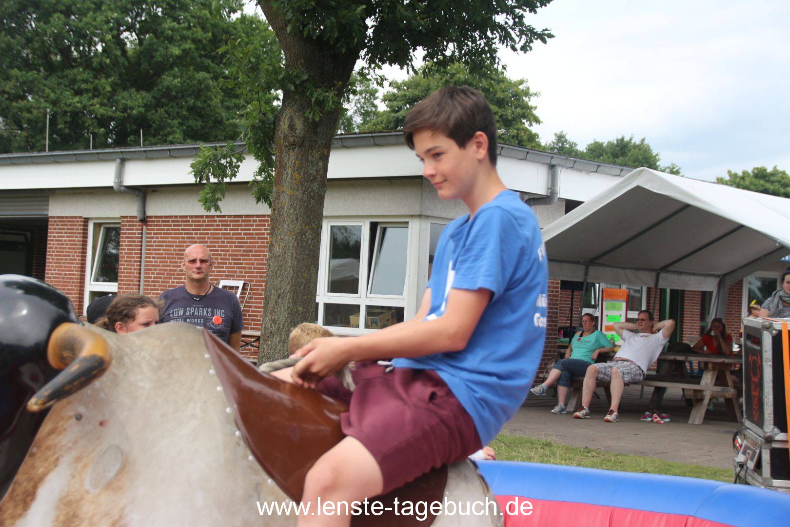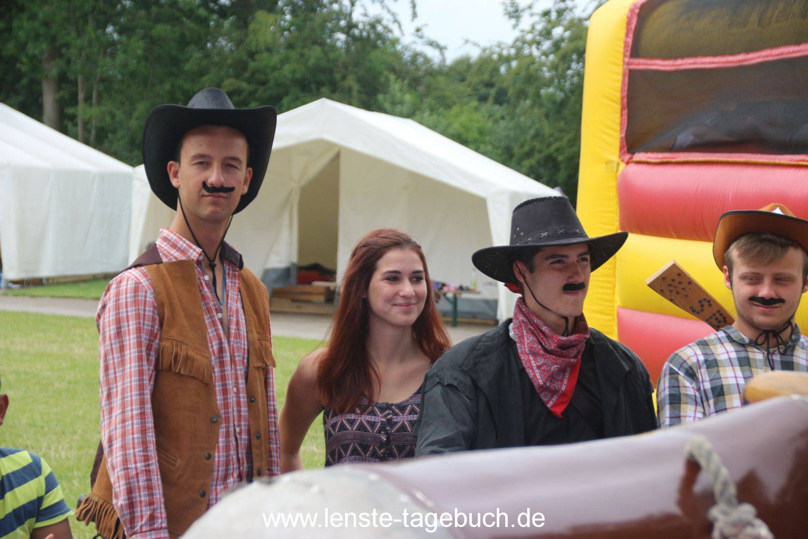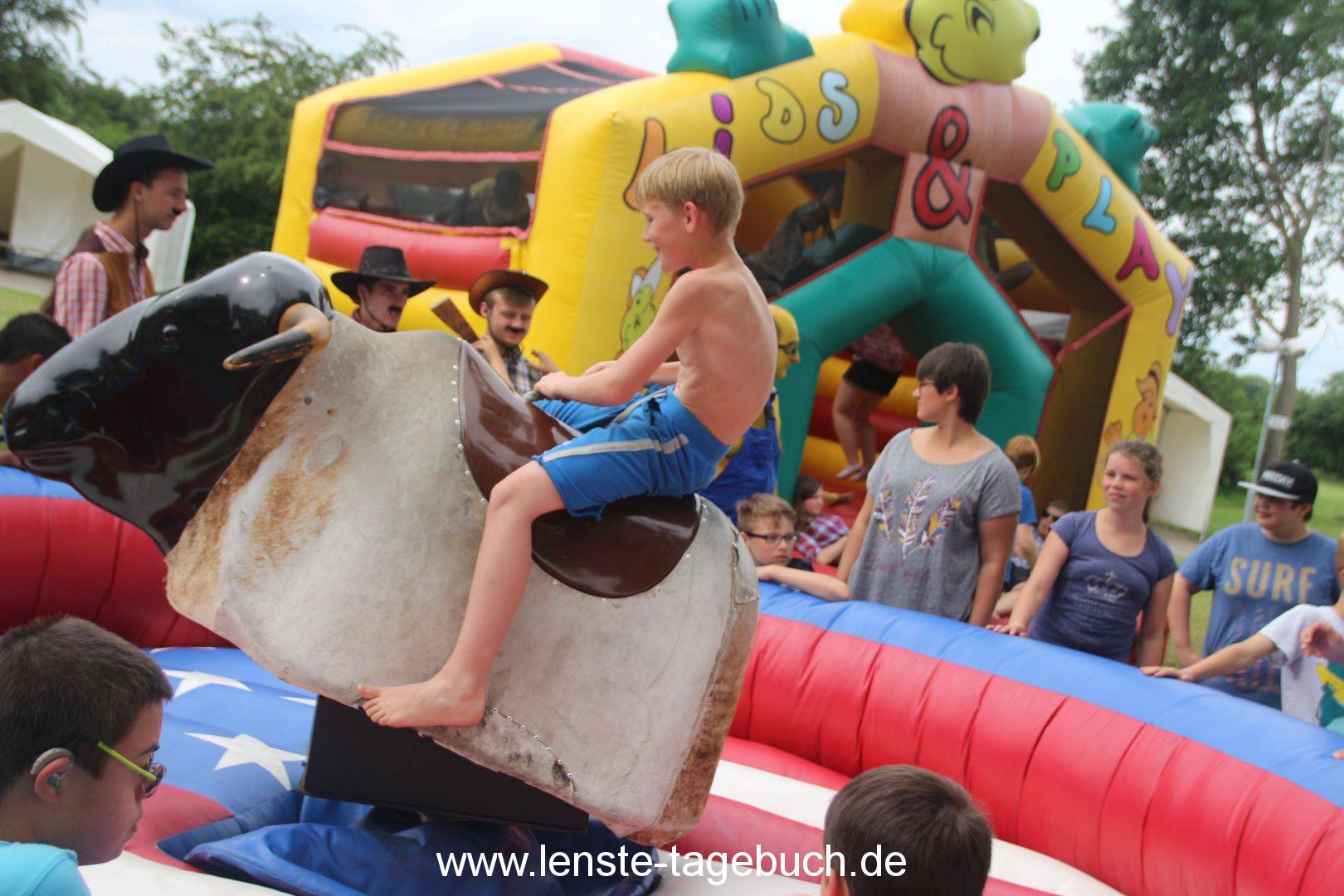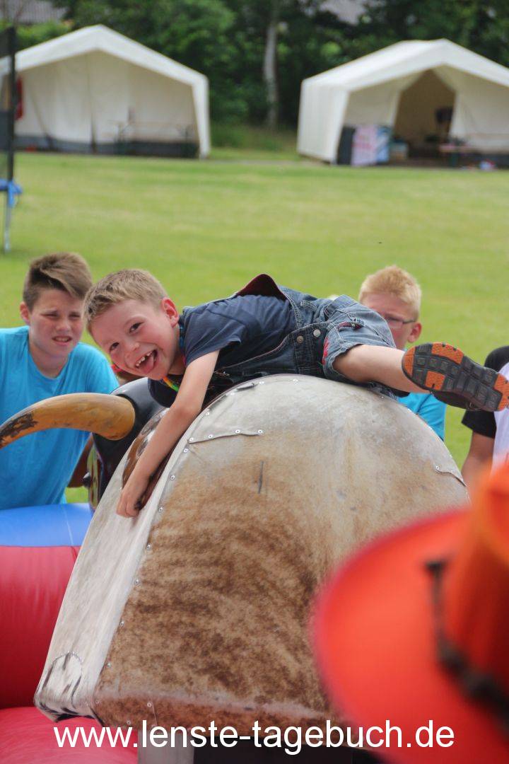 Nach dem Mittagessen beginnt dann der Budenzauber (wie das im Wilden Westen richtig genannt wird, konnte ich leider nicht ermitteln), zu dem wir uns diesmal ein paar ganz besondere Attraktionen ausgedacht haben. Neben Bogenschießen, einer Hüpfburg, Hufeisenwerfen und Lasso-Werfen ist das Highlight des Tages das Bullenreiten! Sehr viele von uns wagen es, sich auf den Bullen zu setzen und versuchen, ihn zu bezwingen.